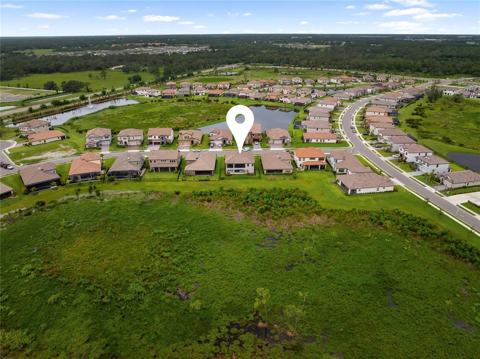 Offering over 4,200 sq. ft. this 3 car, 5 bedroom, 4.5 bath home was designed to impress. With great attention to detail inside and out. This home features striking curb appeal with a rotunda front entry, ornate glass front door, tropical landscape and split garage design. The 2 story foyer welcomes you with a soaring double circular tray ceiling. Upon entering the oversized foyer you will see an office with glass doors, modern style dining room which leads the way to a luxurious gourmet kitchen, with expansive island, quartz countertops, and an upgraded table extension for even more seating. This kitchen features an abundance of 42" cabinets and drawer space, as well as under island cabinet storage. Pantry- walk in with frosted glass door. Kitchen appliances include a gas cooktop with vented hood, microwave with convection oven and refrigerator. The kitchen overlooks the grand family room. The family room has 8' sliders off the back which offers serene views of the preservation area. There is also a bedroom/guest suite on the first floor and full bath. Covered Lanai on first floor is rough plumbed and has a gas rough in for a future summer kitchen, fenced in backyard. As you come up the eloquent stairway, the 2nd floor boasts the Owner's Retreat and opulent bath. The Owner's bath includes an oversized, free standing soaking tub, glass enclosed shower, with dual shower heads. One being a rain shower head and his and hers walk in closets. You will also find 3 more generous bedrooms and 2 full baths, one featuring a Jack and Jill style bath. This home also includes a sizable bonus room with rough in for wet bar and access to the 2nd floor screened in balcony. Great for entertaining and taking in the scenic views. The Laundry room comes with a laundry sink. The washer, dryer are included in the sale. Crosswind Ranch offers a variety of amenities. Residents will enjoy a resort-style community pool, open-air cabana, pocket parks, and scenic water and conservation views. Further amenities may include a community amenity center, pickleball courts and trails. Crosswind Ranch is conveniently located to top area schools, Tampa, St. Petersburg, Sarasota and the Gulf Coast's beautiful beaches.
