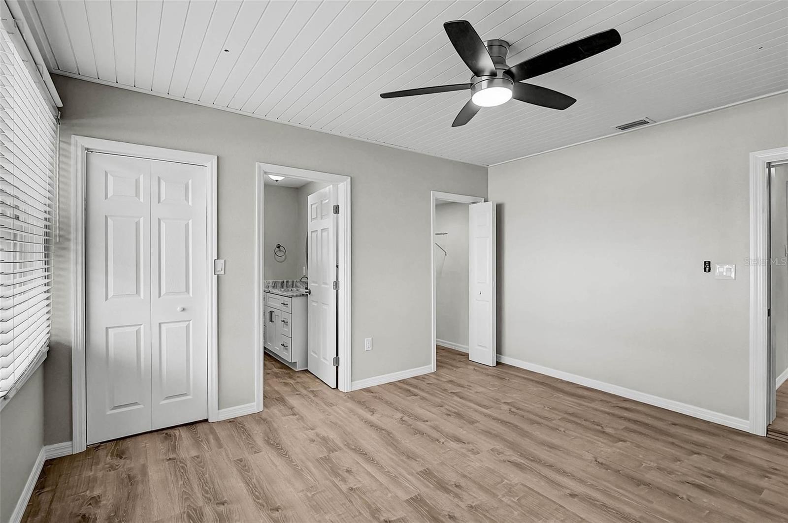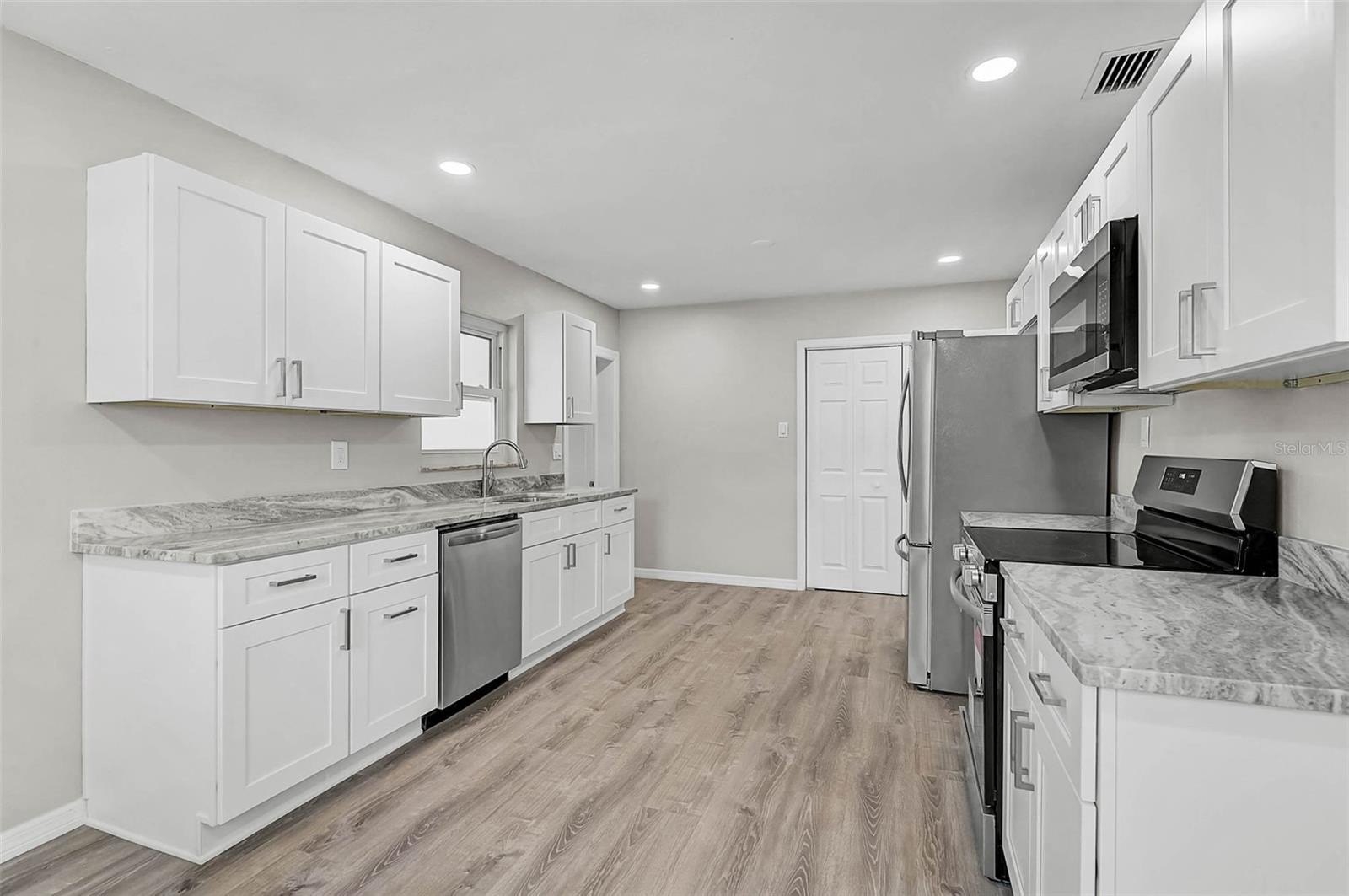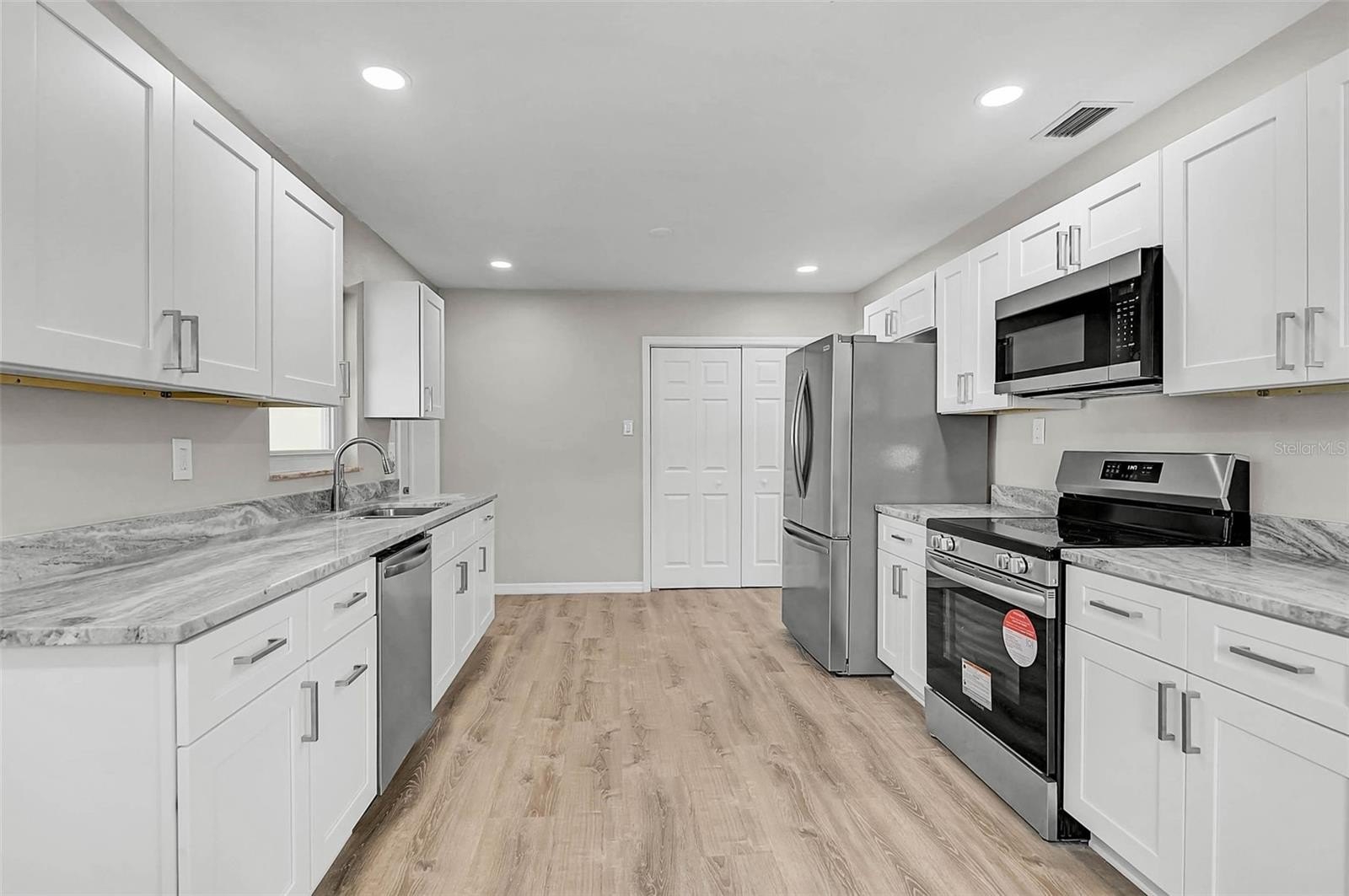 Step into a spacious great room with living and dining areas that flow seamlessly into the fully updated kitchen, complete with Frigidaire stainless steel appliances, shaker cabinets, and granite countertops. The split floor plan offers two guest bedrooms and a full bathroom with granite countertops and a tub. The private Primary Suite features a modern en-suite with a granite vanity, shower, and walk-in closet. Elegance and modern updates reflect throughout this home. You must see to fully appreciated. Set on two parcels, it features a spacious side yard, perfect for outdoor living and entertaining. This is a No HOA, no CDD neighborhood.