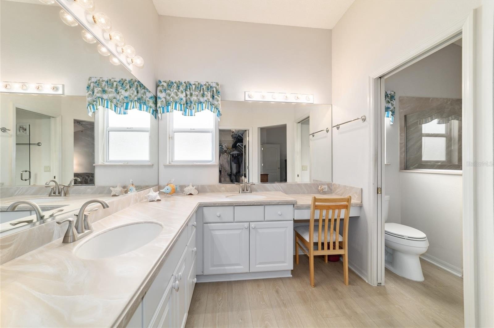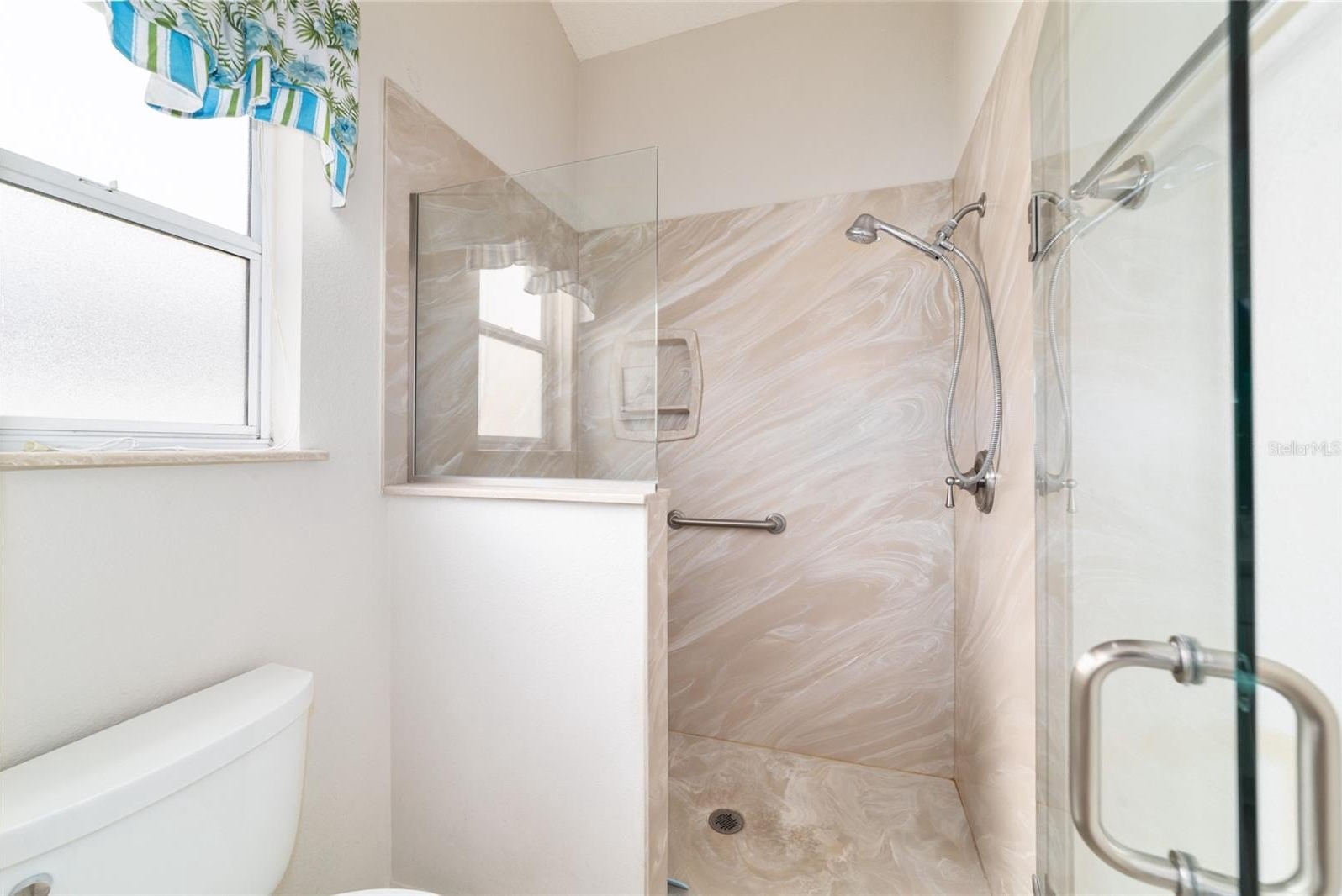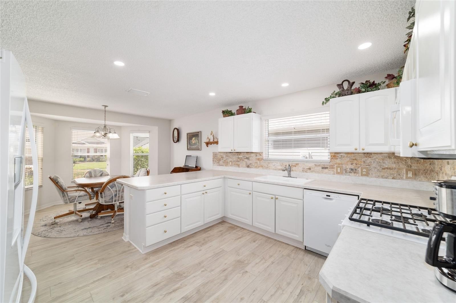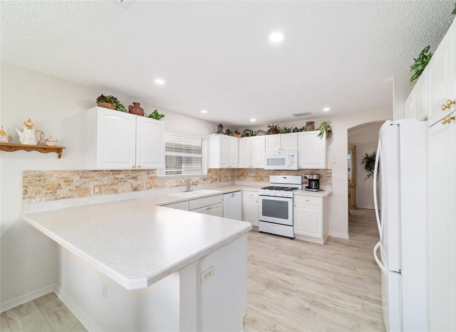 Inside, luxury vinyl plank flooring runs through the main living areas, complemented by carpet in the bedrooms. The open kitchen features classic white cabinetry and ample storage, flowing seamlessly into the dining and living areas for easy entertaining. The spacious primary suite includes TWO WALK-IN CLOSETS and a beautifully updated en-suite bath with a TERRA STONE SHOWER complete with bench, TERRA STONE vanity top, and white cabinetry.