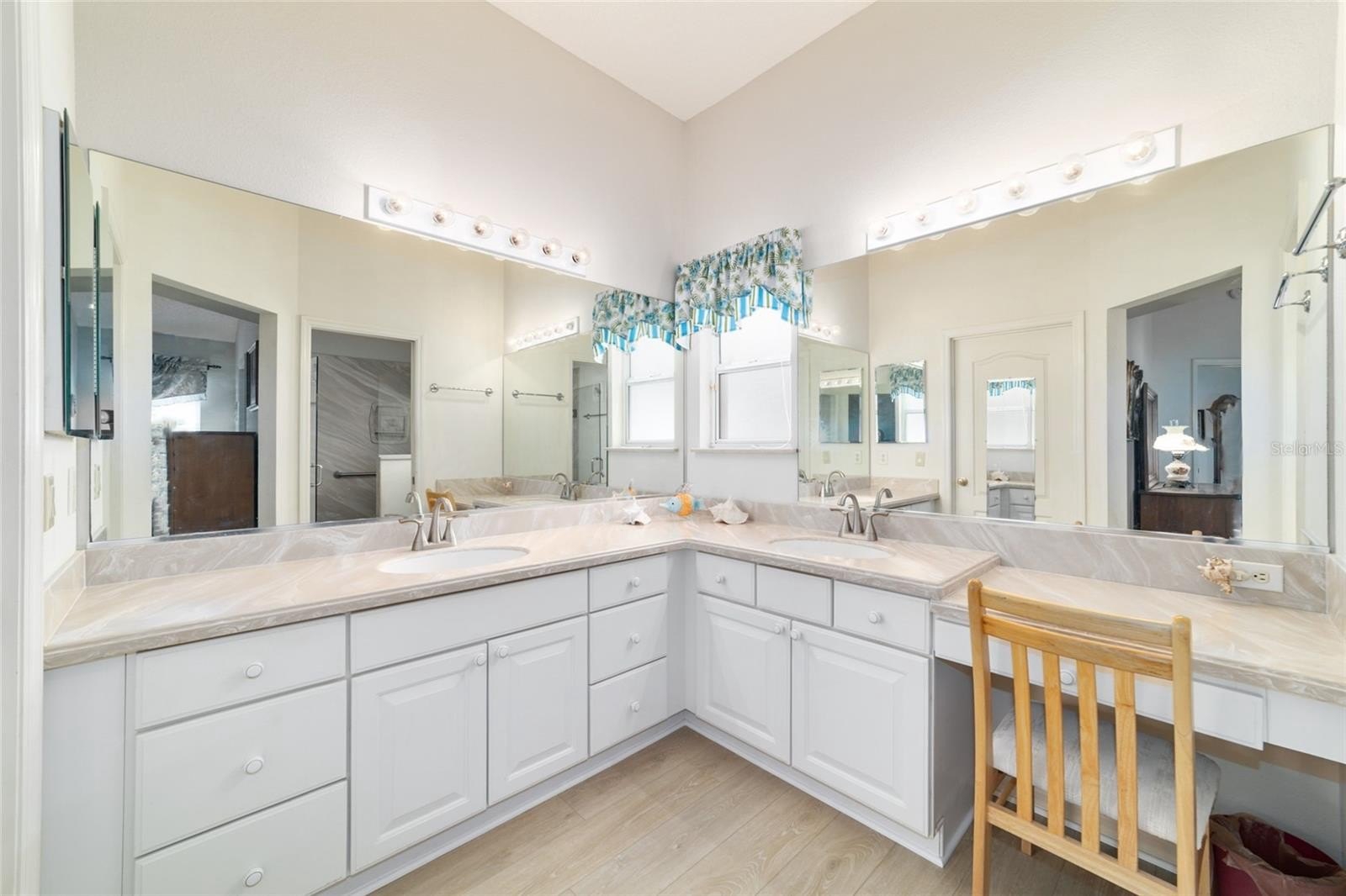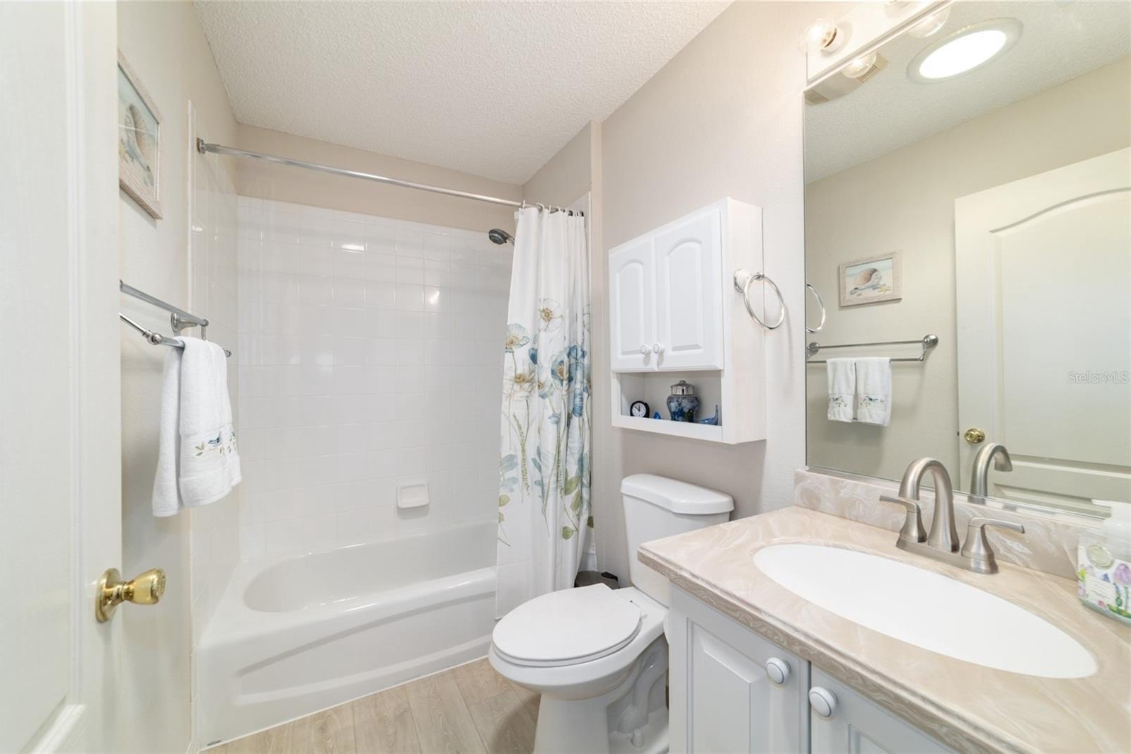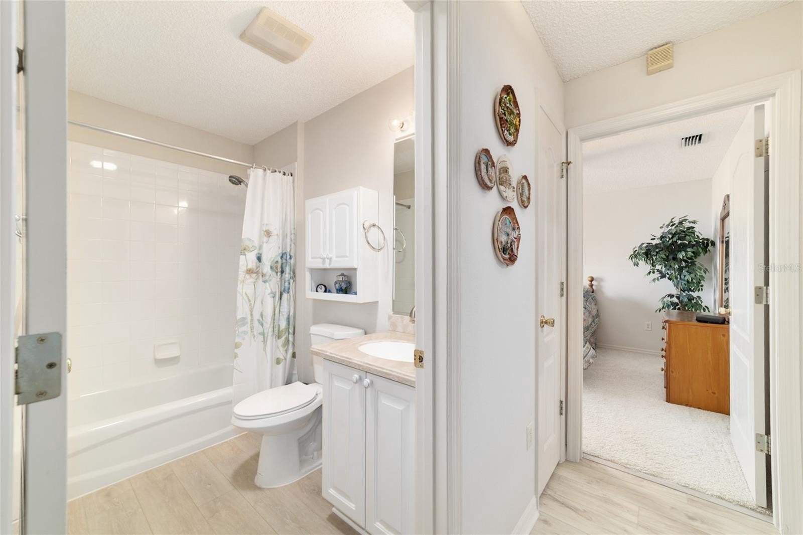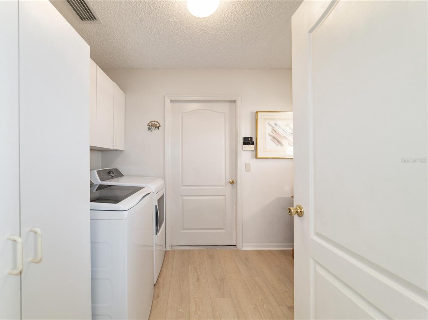 Inside, luxury vinyl plank flooring runs through the main living areas, complemented by carpet in the bedrooms. The open kitchen features classic white cabinetry and ample storage, flowing seamlessly into the dining and living areas for easy entertaining. The spacious primary suite includes TWO WALK-IN CLOSETS and a beautifully updated en-suite bath with a TERRA STONE SHOWER complete with bench, TERRA STONE vanity top, and white cabinetry.