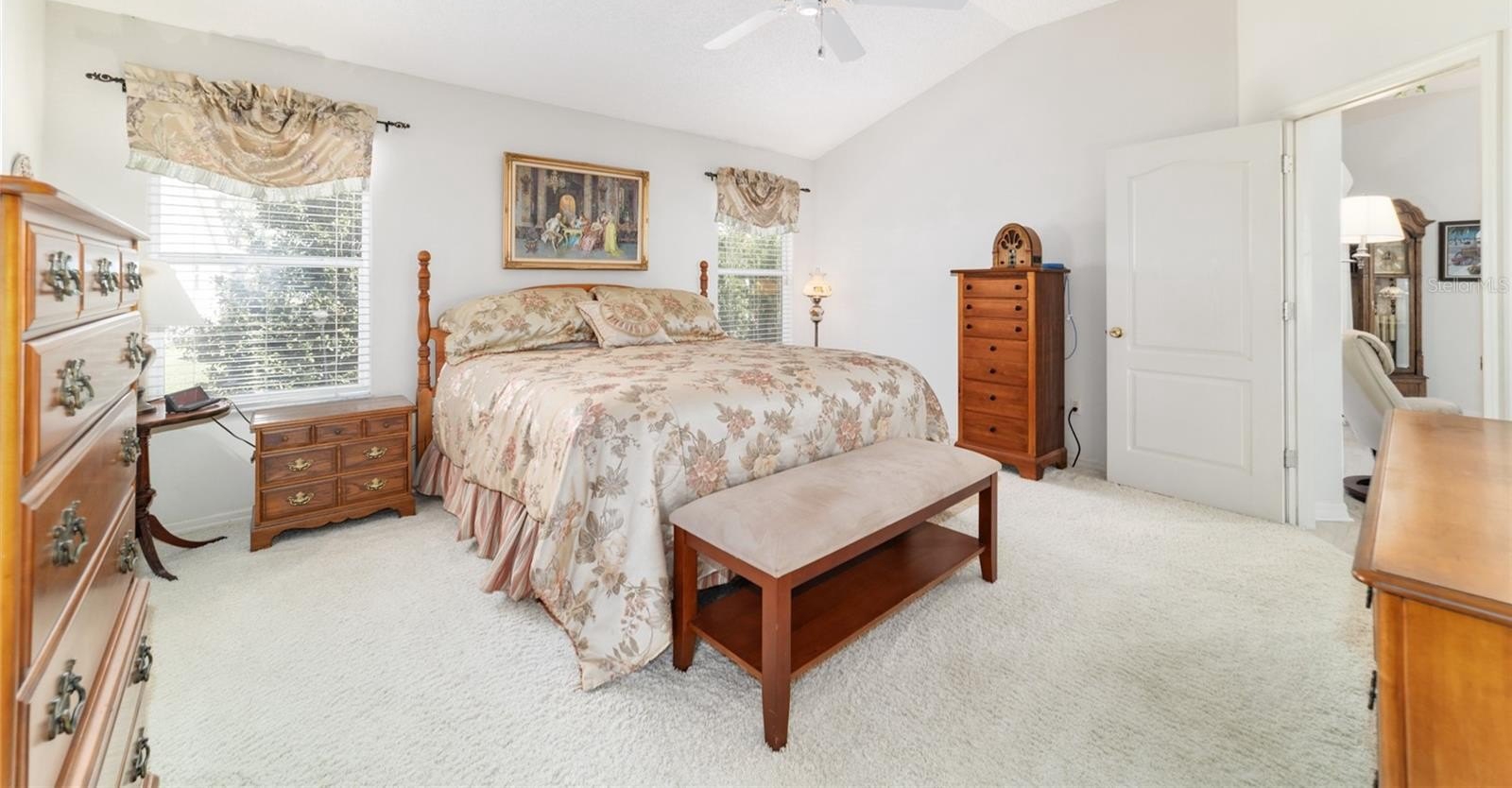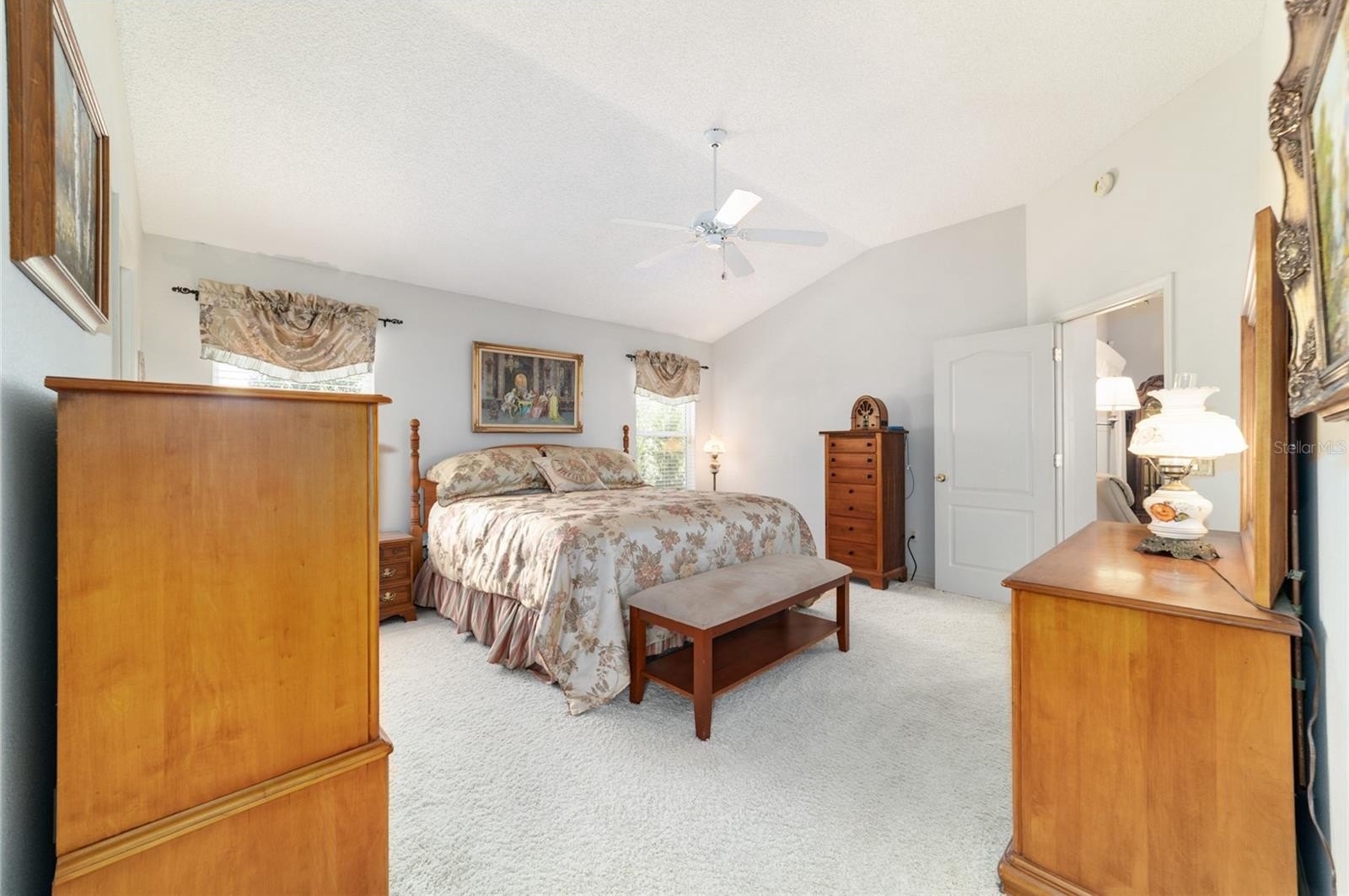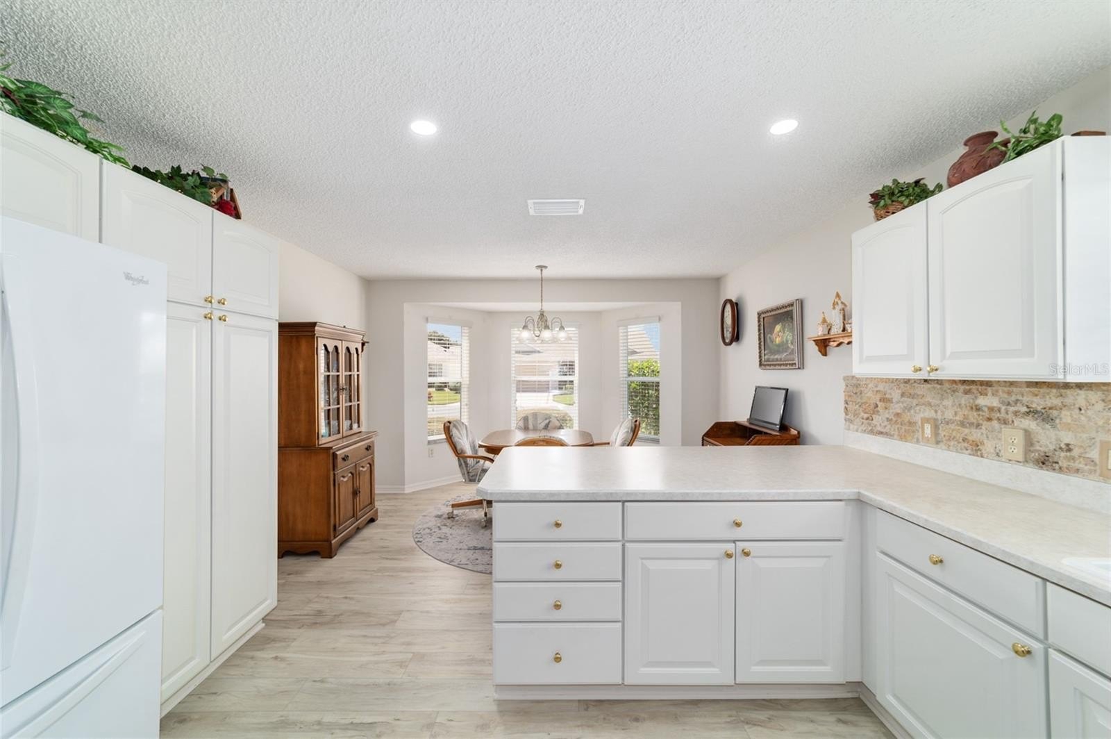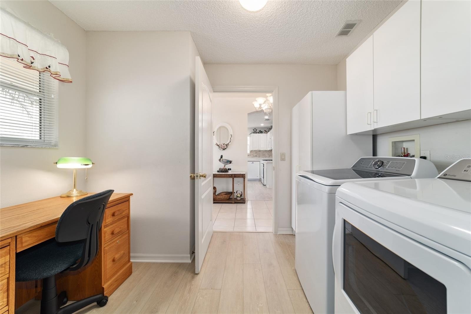 Inside, luxury vinyl plank flooring runs through the main living areas, complemented by carpet in the bedrooms. The open kitchen features classic white cabinetry and ample storage, flowing seamlessly into the dining and living areas for easy entertaining. The spacious primary suite includes TWO WALK-IN CLOSETS and a beautifully updated en-suite bath with a TERRA STONE SHOWER complete with bench, TERRA STONE vanity top, and white cabinetry.