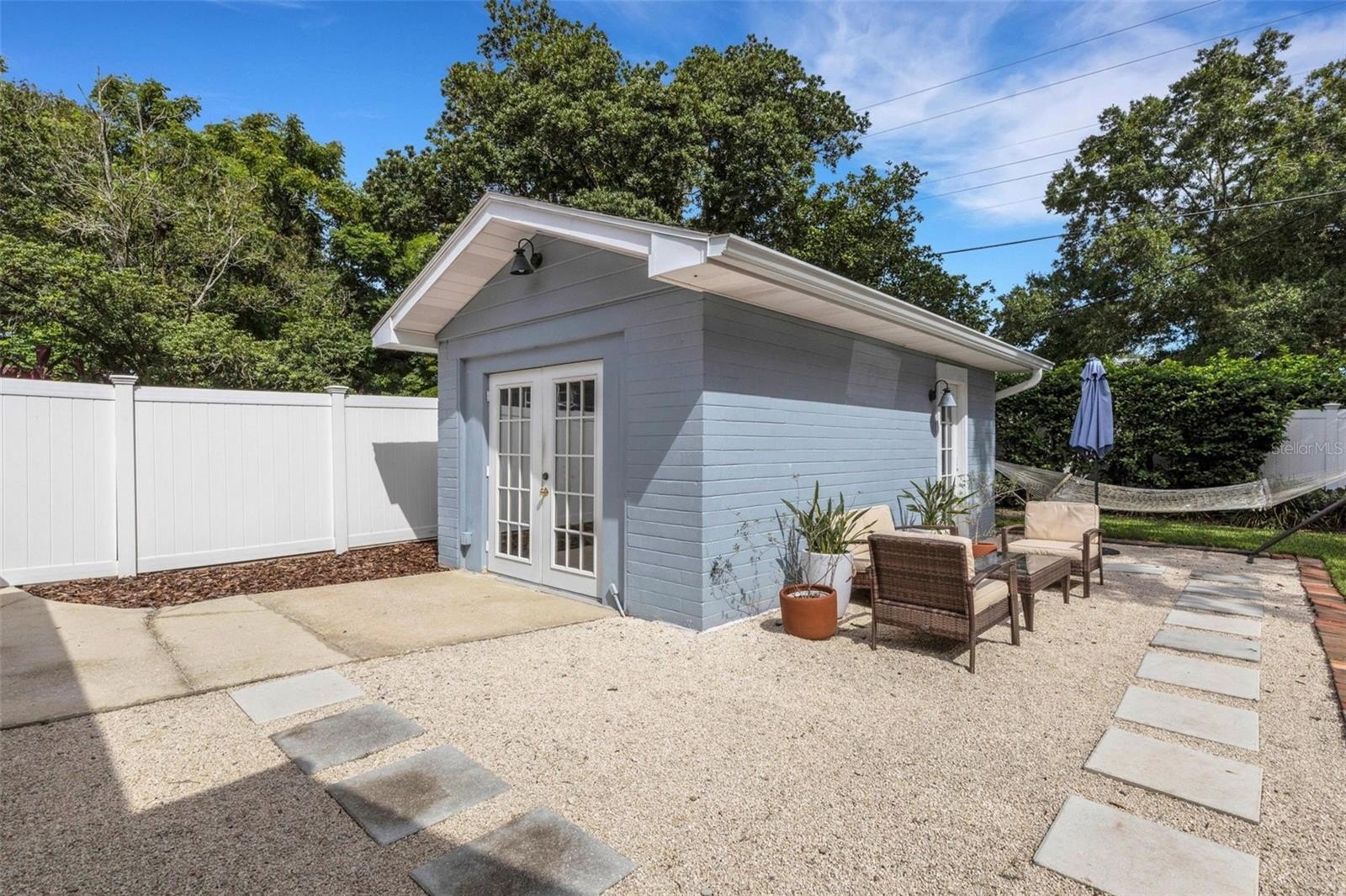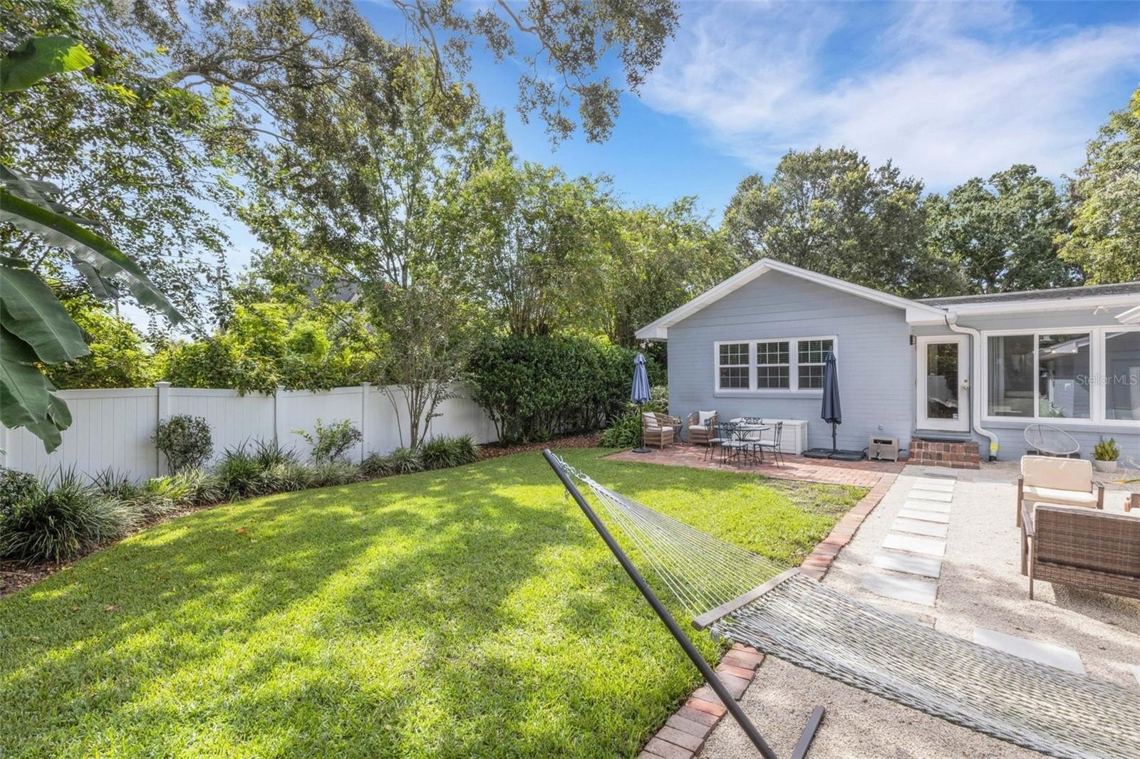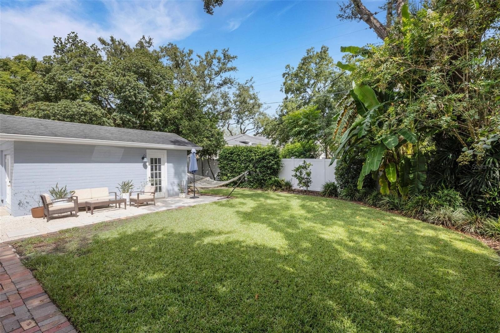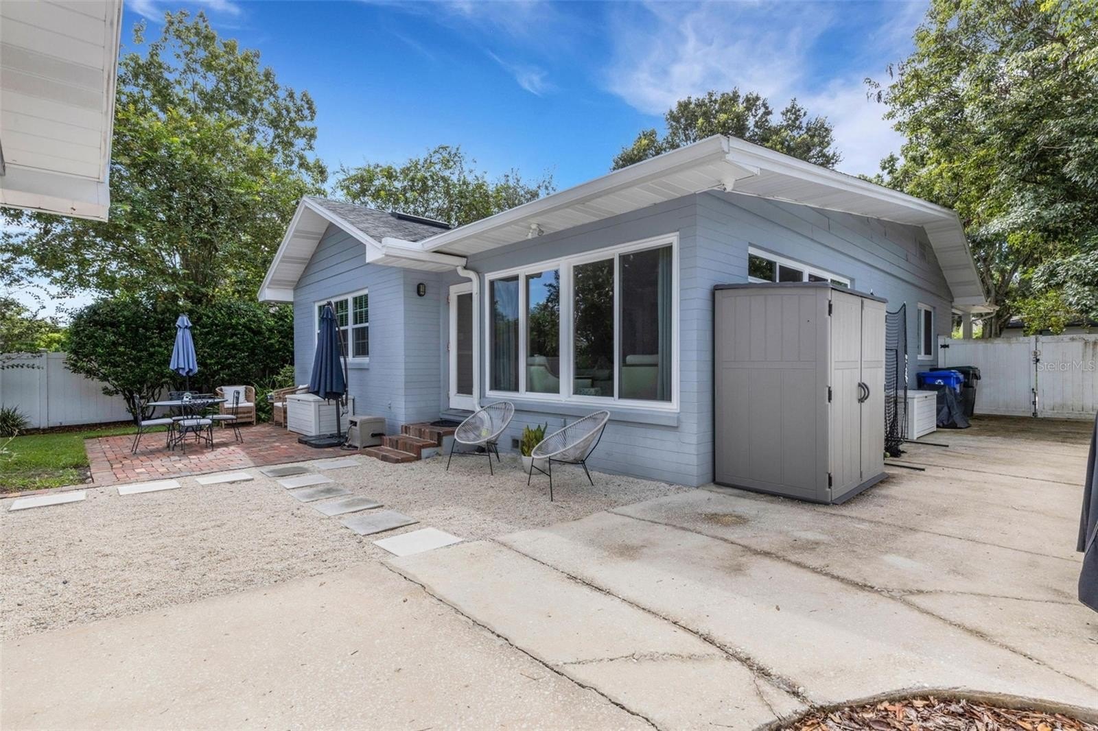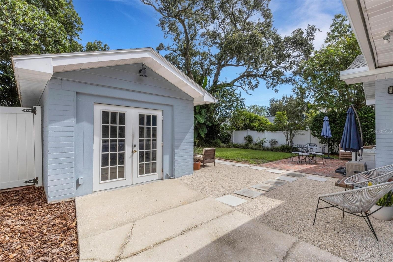 Outdoors, the entertainment-sized backyard is designed for Florida living—lush landscaping, a white privacy fence, and both a brick paver patio and a separate stone seating area offer multiple spots for entertaining. A she-shed/man cave with 252 sq ft plus A/C and electric is ideal for a home office, studio, or hobby space.
