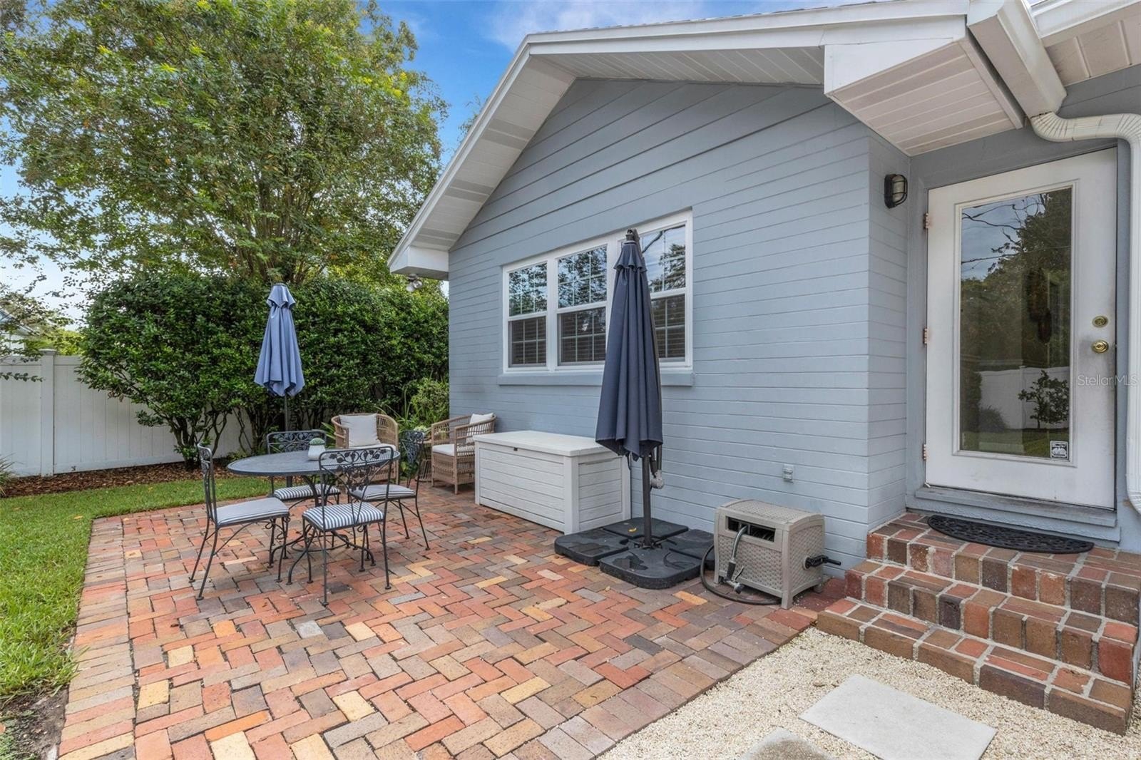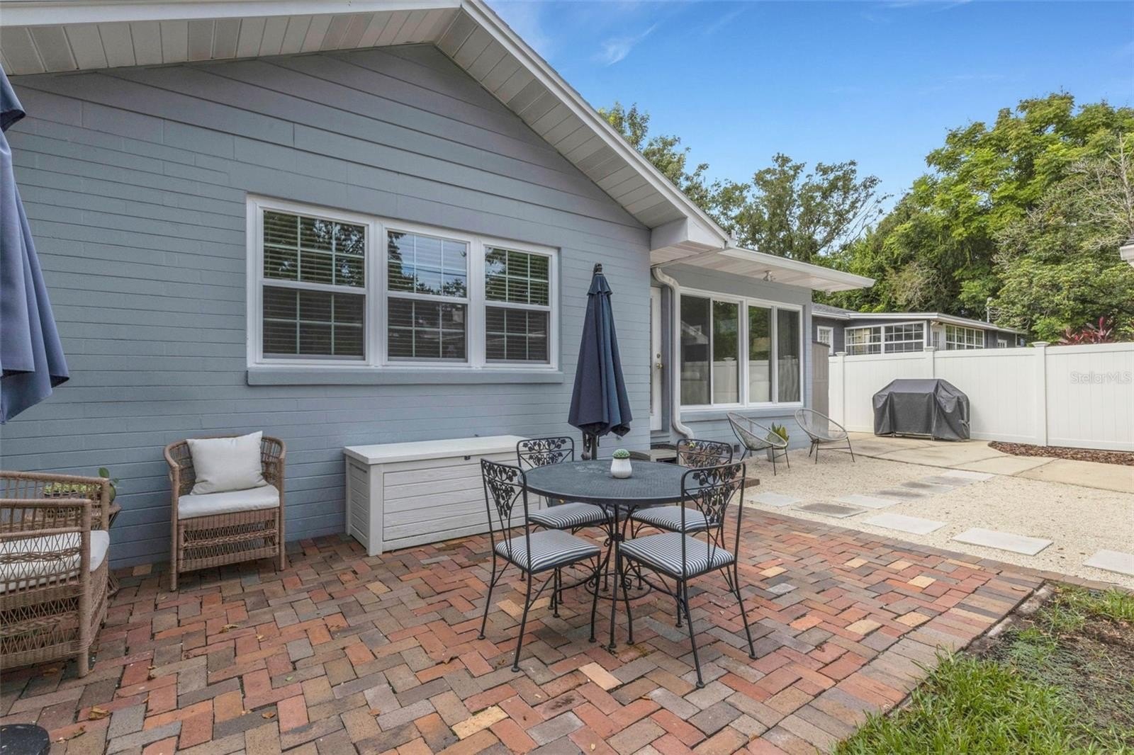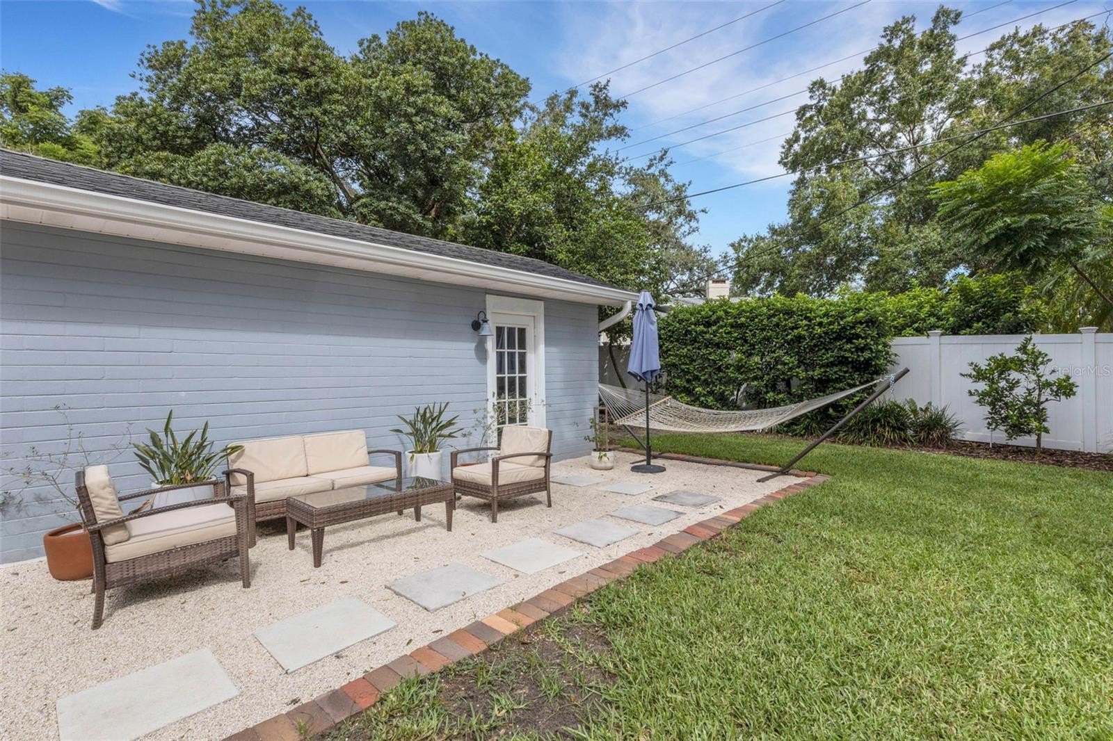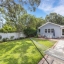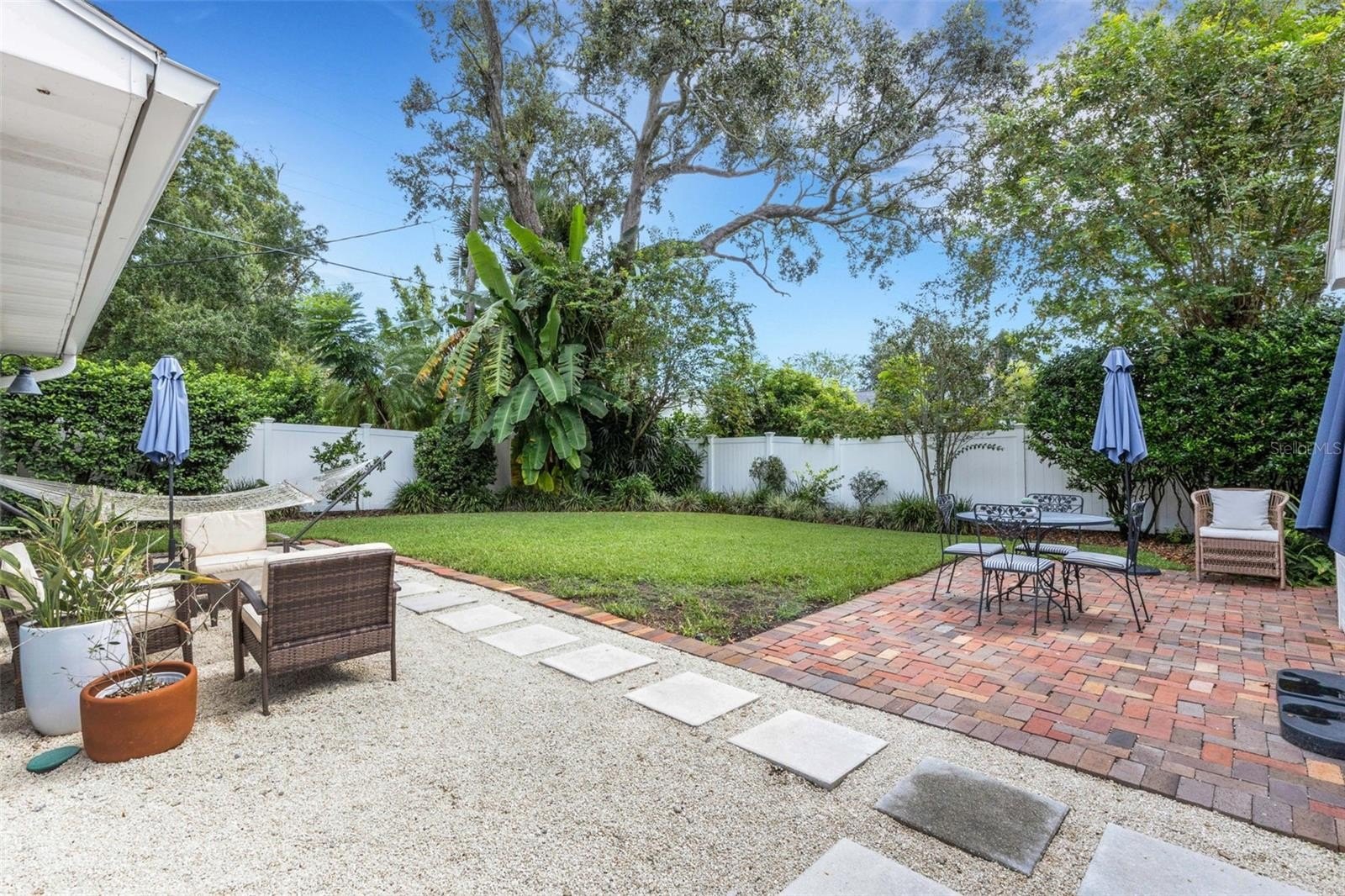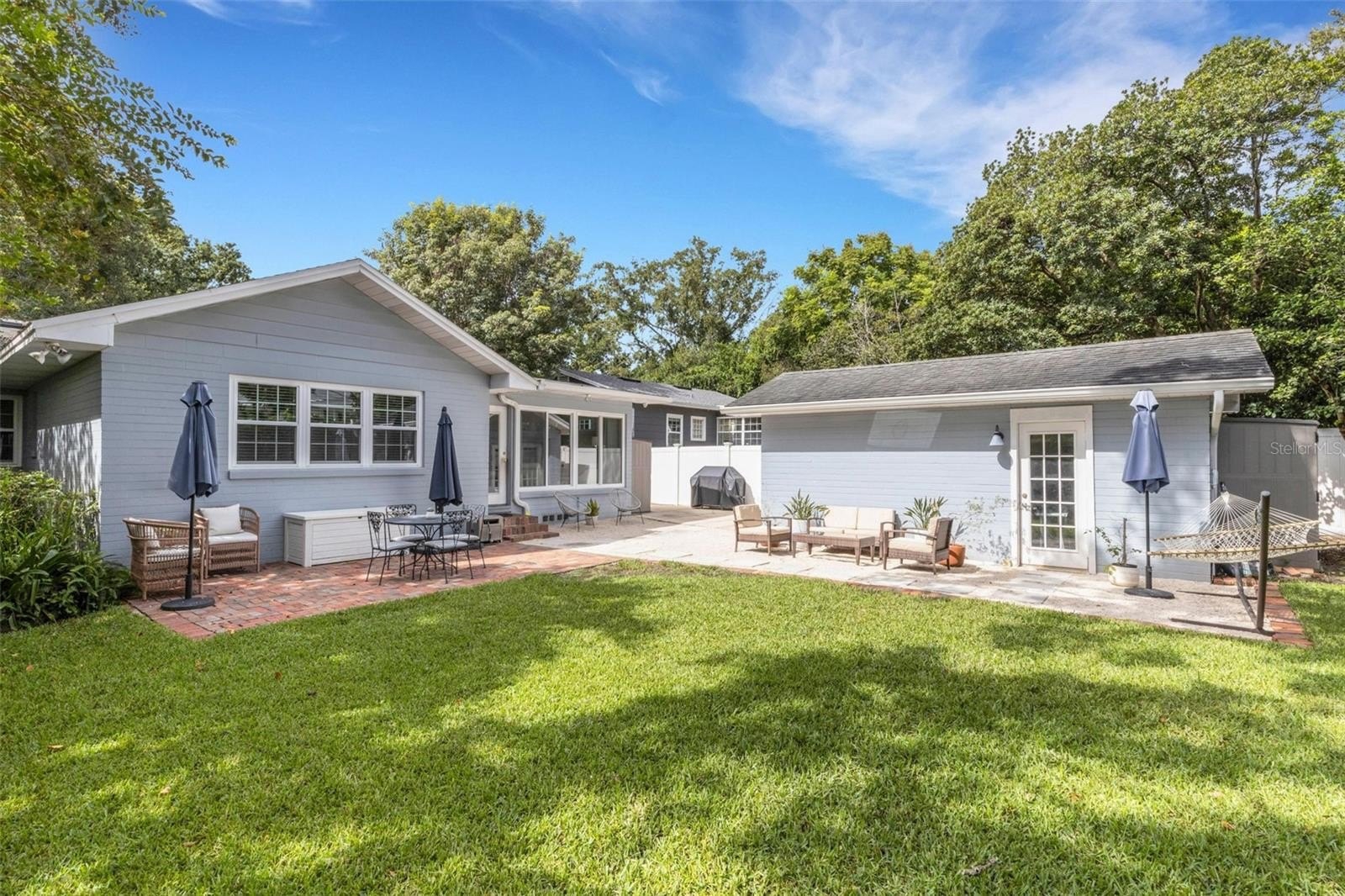 Outdoors, the entertainment-sized backyard is designed for Florida living—lush landscaping, a white privacy fence, and both a brick paver patio and a separate stone seating area offer multiple spots for entertaining. A she-shed/man cave with 252 sq ft plus A/C and electric is ideal for a home office, studio, or hobby space.