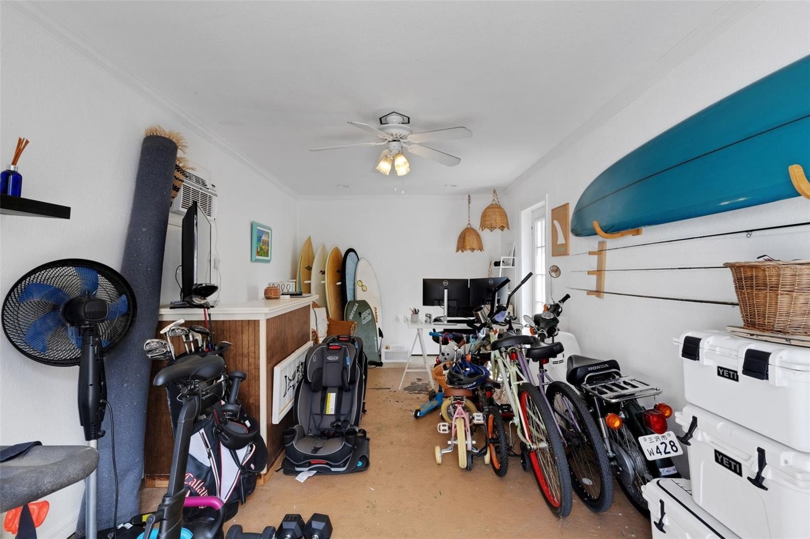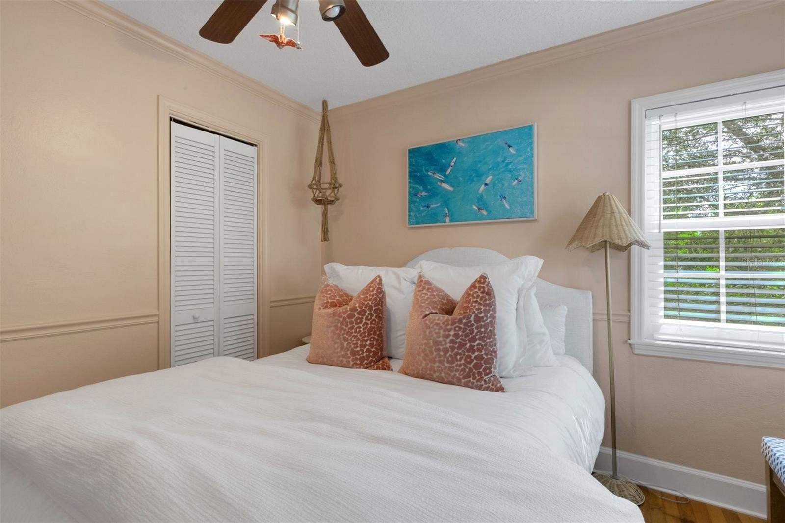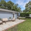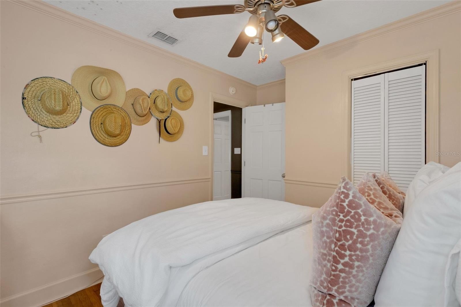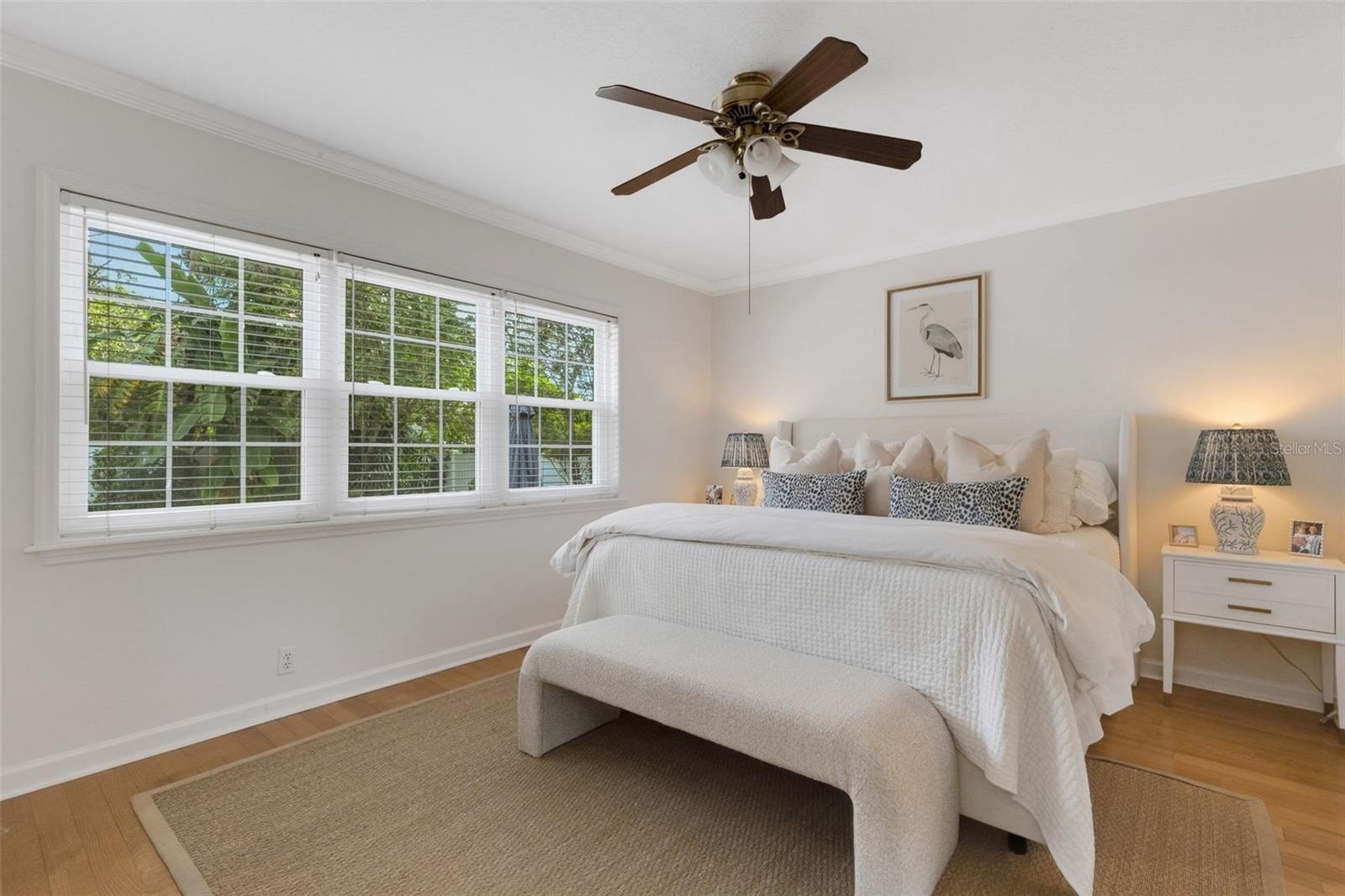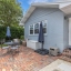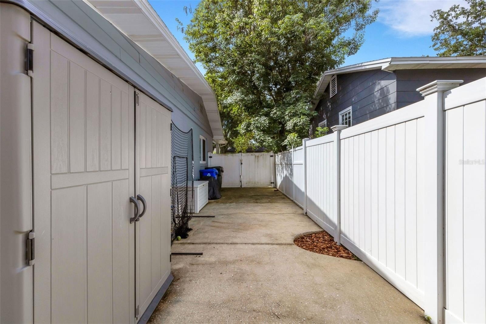Outdoors, the entertainment-sized backyard is designed for Florida living—lush landscaping, a white privacy fence, and both a brick paver patio and a separate stone seating area offer multiple spots for entertaining. A she-shed/man cave with 252 sq ft plus A/C and electric is ideal for a home office, studio, or hobby space.
