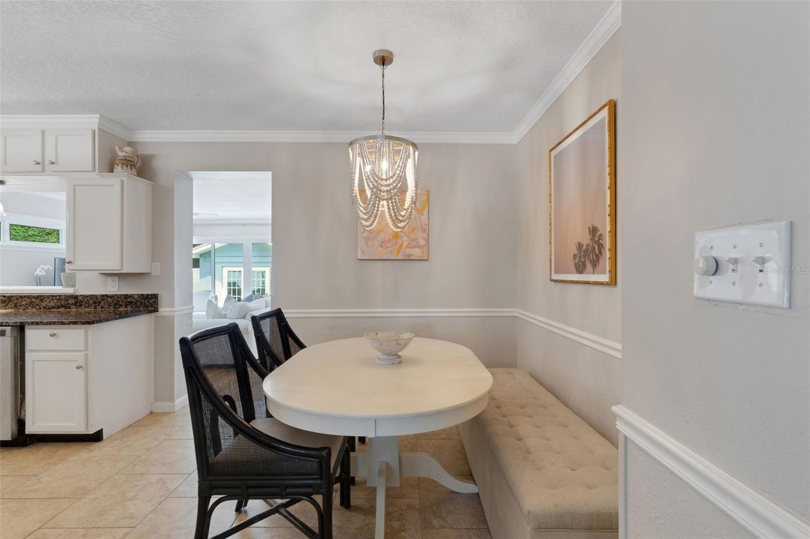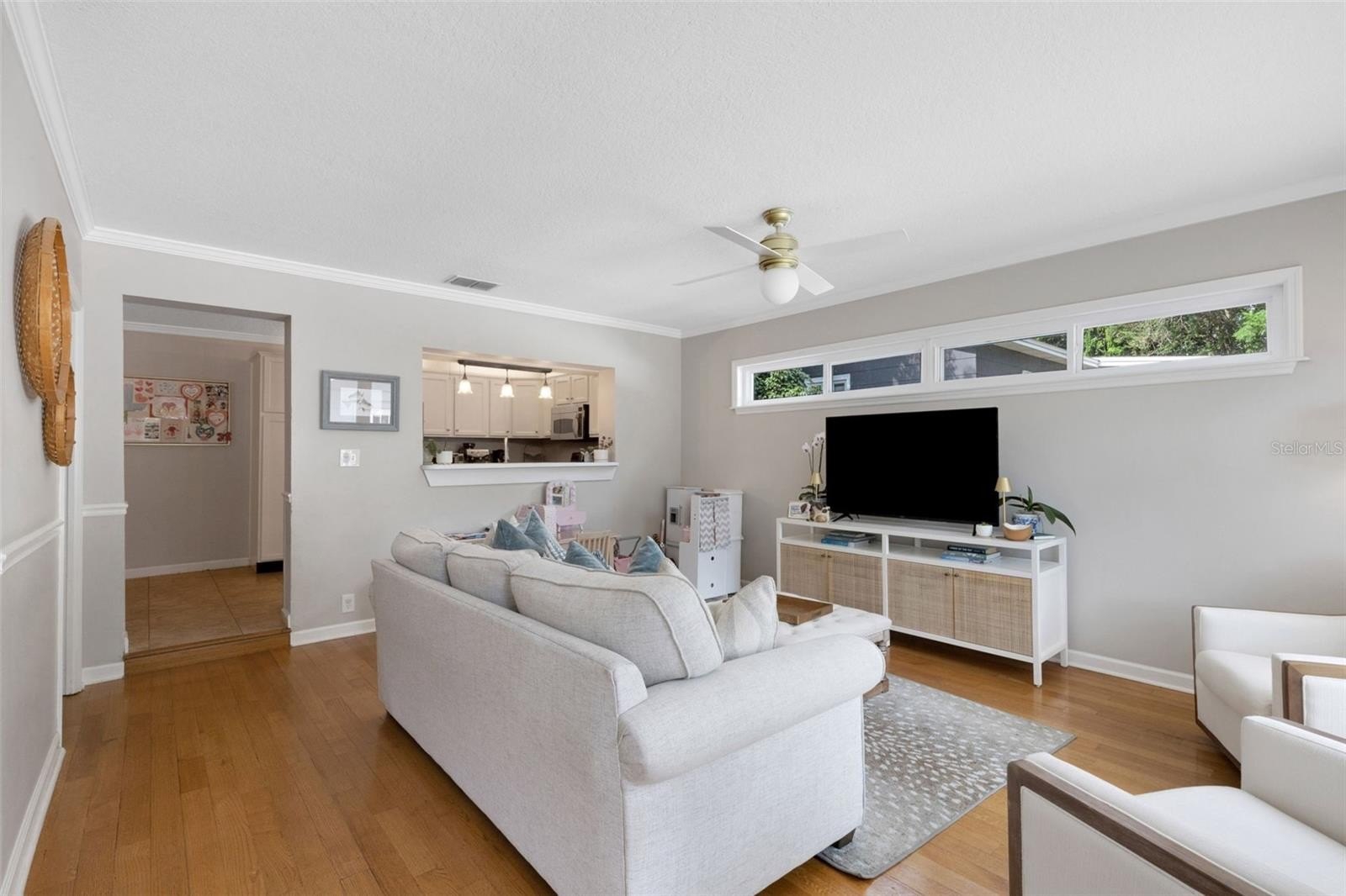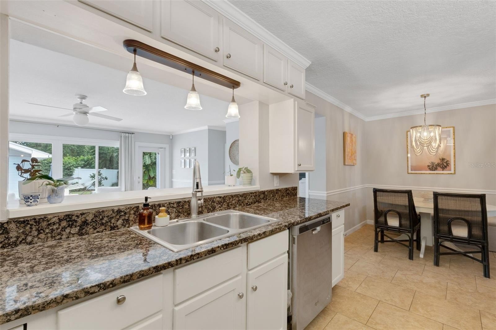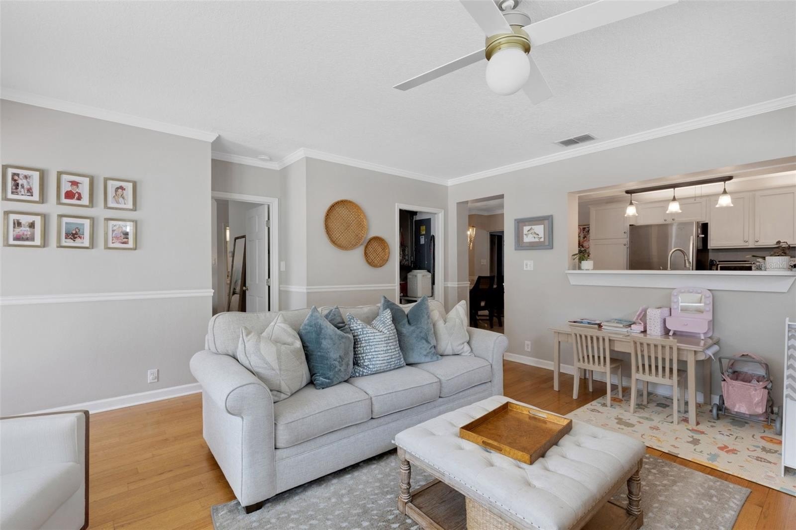 Offering 3 bedrooms and 2 baths with a desirable split layout, the home features a spacious great room, a formal living room, and a kitchen/dining combination perfect for gatherings. The updated kitchen shines with granite countertops, stainless steel appliances, and timeless details like crown moulding, chair rail, and gleaming wood floors.