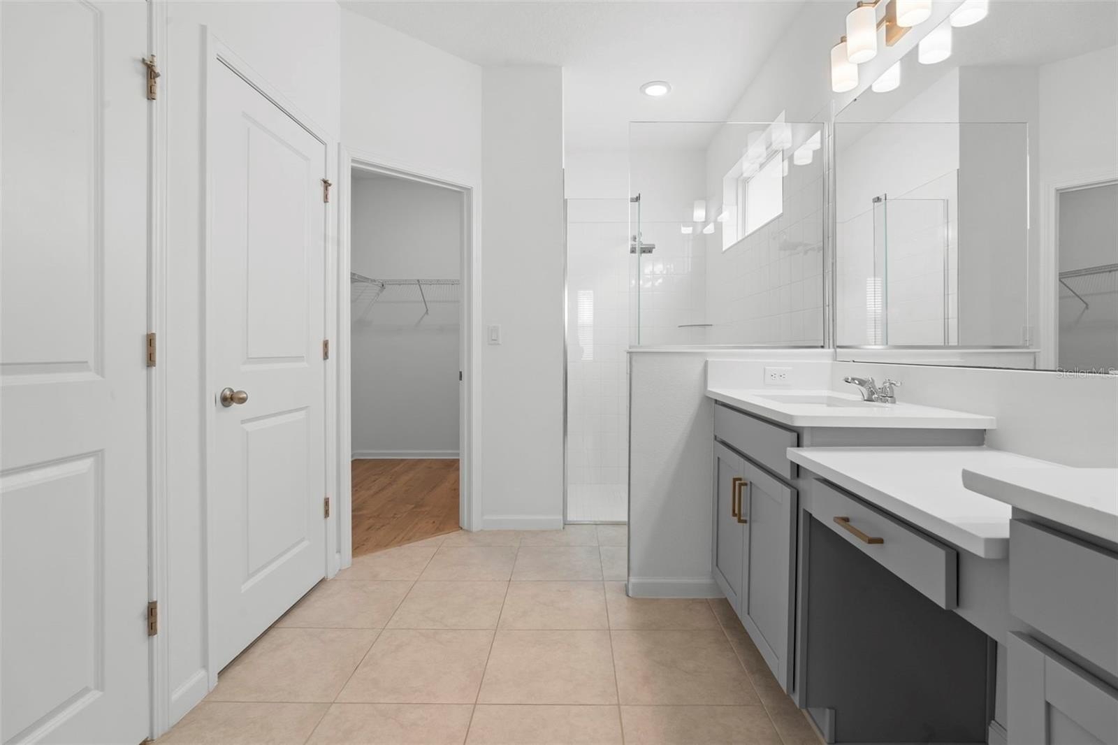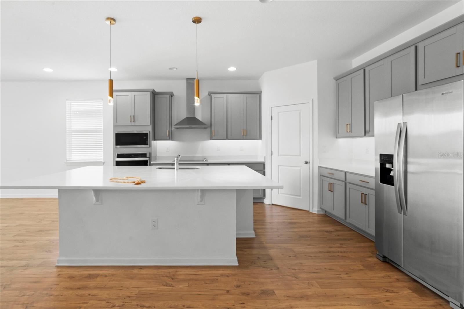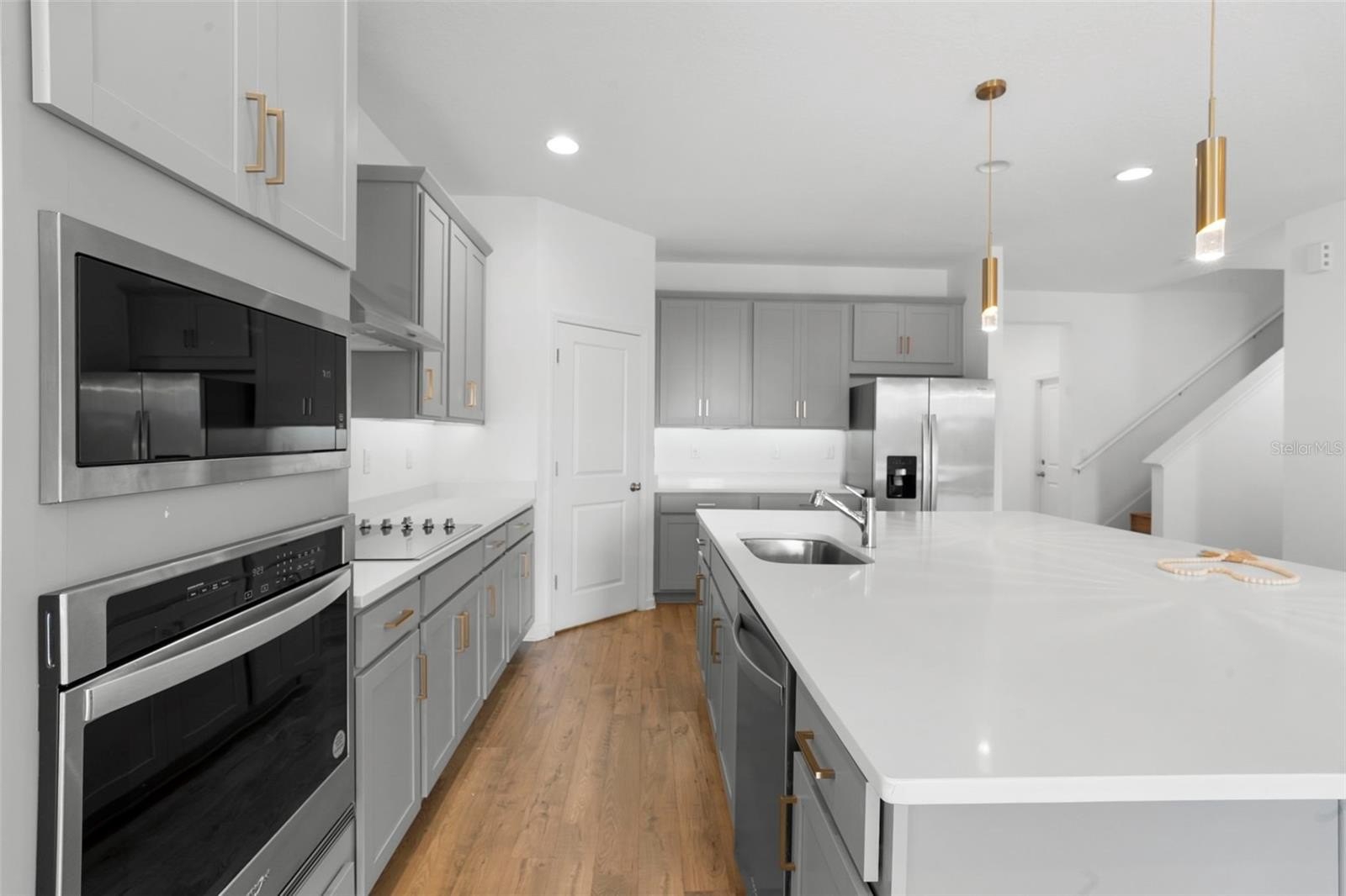 The thoughtfully designed floor plan is ideal for families, especially those with little ones. The main level features four spacious bedrooms, including a luxurious primary suite complete with dual walk-in closets and a beautifully appointed double-vanity bathroom. The home also offers two full bathrooms and one half-bath, a separate dining room, and a welcoming living area perfect for entertaining. The gourmet kitchen is a true highlight, featuring modern gray cabinetry, elegant quartz countertops, and an oversized island designed for family gatherings, holidays, and special occasions.