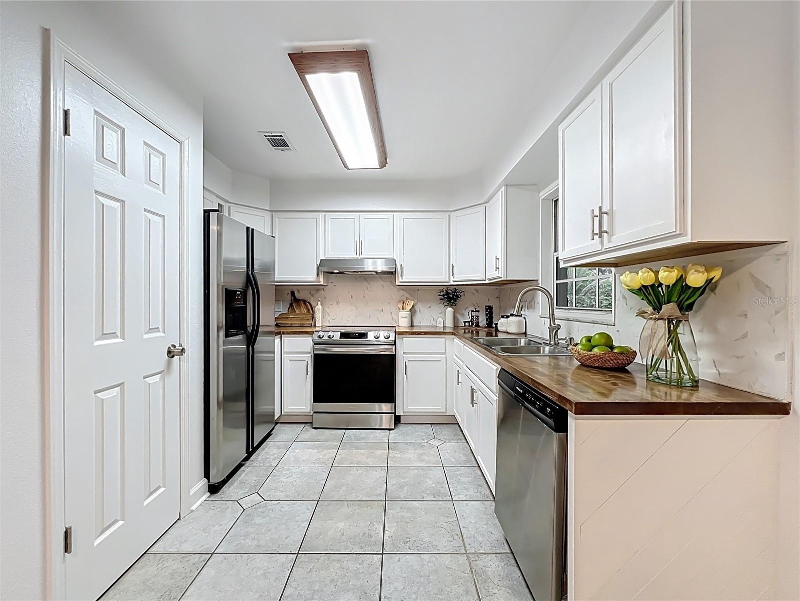 Inside, the home feels open and bright, with updates in all the right places. The kitchen features brand-new white shaker cabinets, butcher block countertops, a new dishwasher, and a spacious pantry, blending function with style. The split-bedroom floor plan provides privacy for everyone. The primary suite includes a walk-in closet and a private bathroom with a walk-in shower, while the two additional bedrooms offer generous closets, ceiling fans, and plenty of natural light.