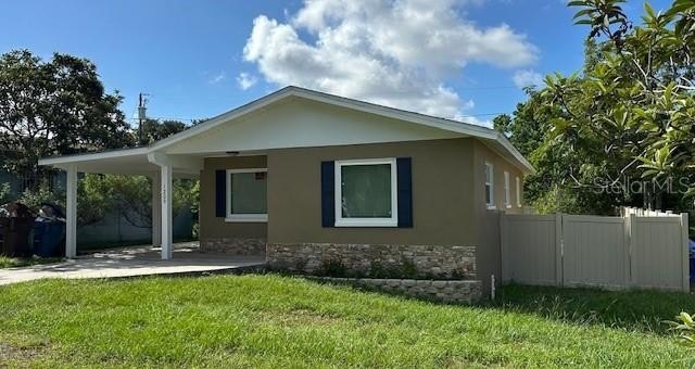 Outside, the home features a vinyl fenced yard that offers both privacy and security, along with a lower stone facade molding that enhances curb appeal, and gives the property a fresh new build look. Also, there is a single car-carport that provides that provides covered parking and convenience.