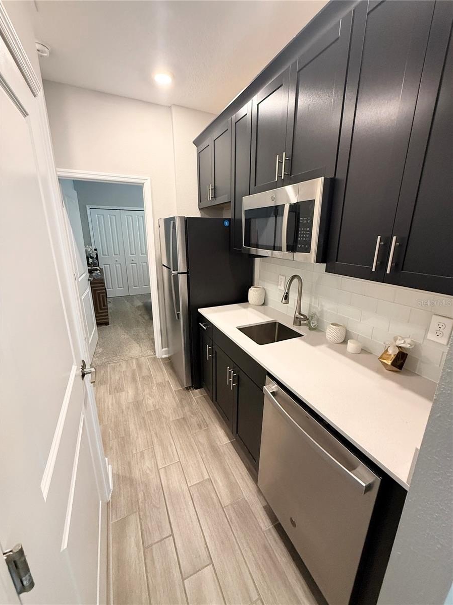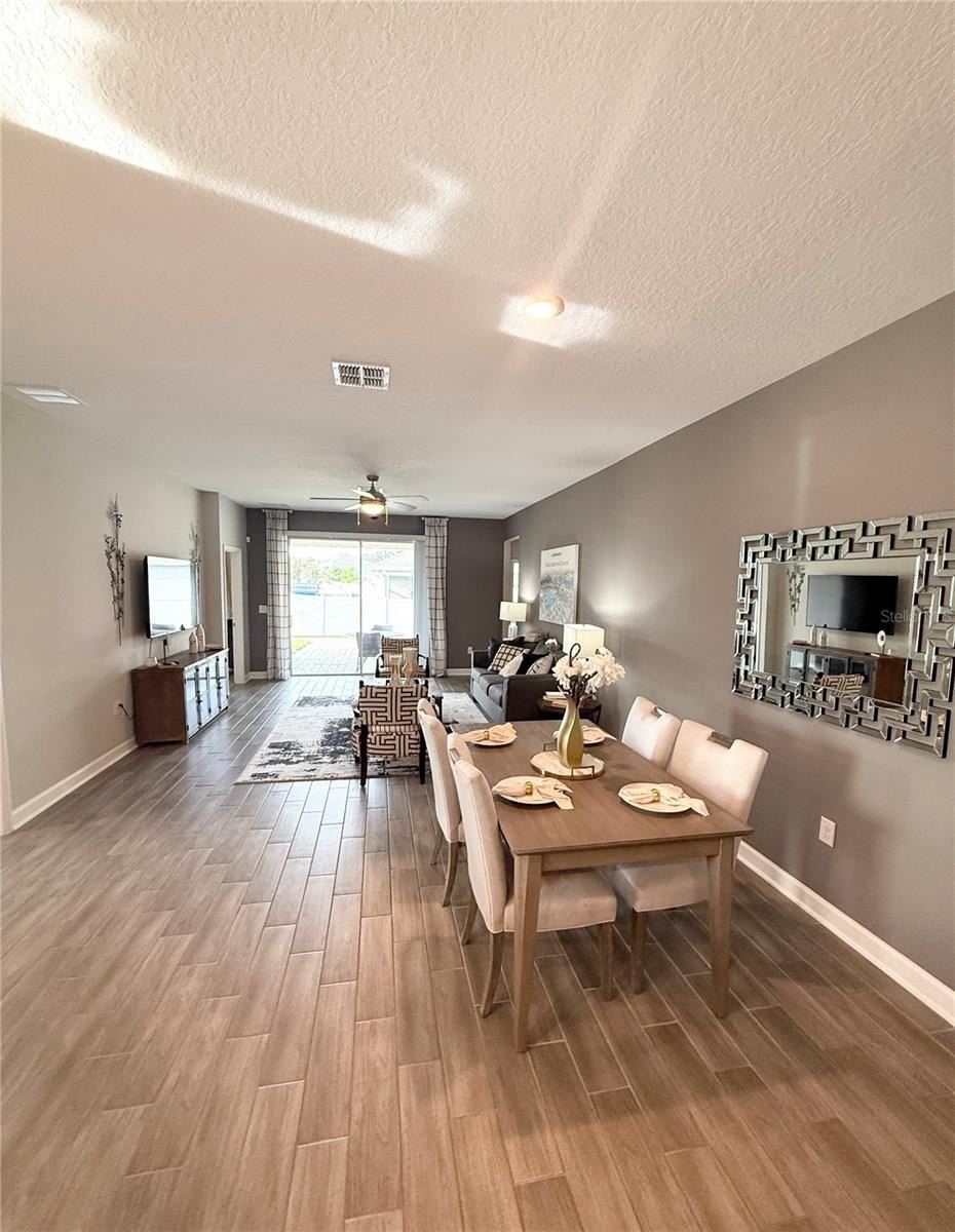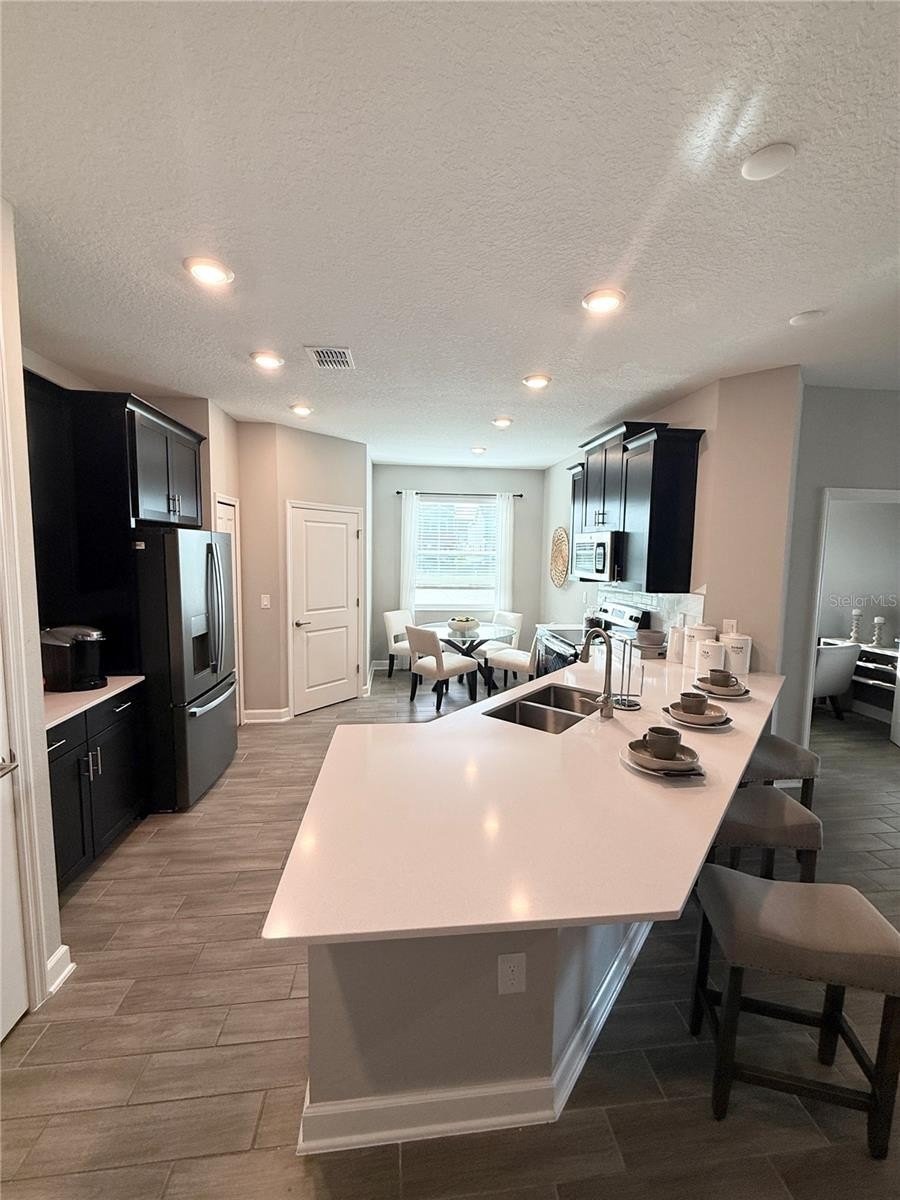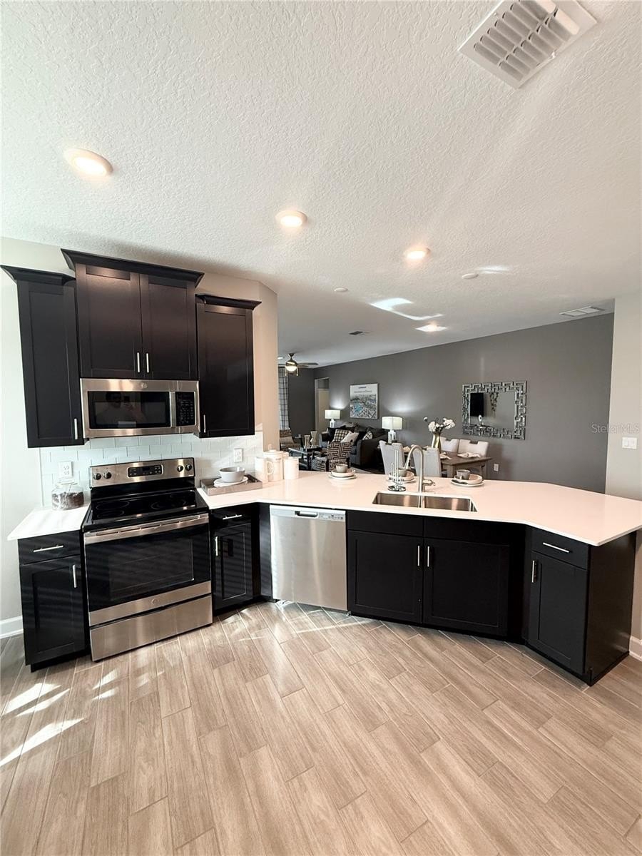 The main residence boasts an open-concept design that seamlessly connects the spacious kitchen, dining, and family areas—creating a natural hub for gathering and entertaining. The modern kitchen is equipped with brand-new stainless steel appliances, sleek quartz countertops, a wraparound breakfast bar, and abundant storage. A cozy nook just off the kitchen is perfect for casual meals, while sliding glass doors open to the covered patio, extending your living space outdoors.