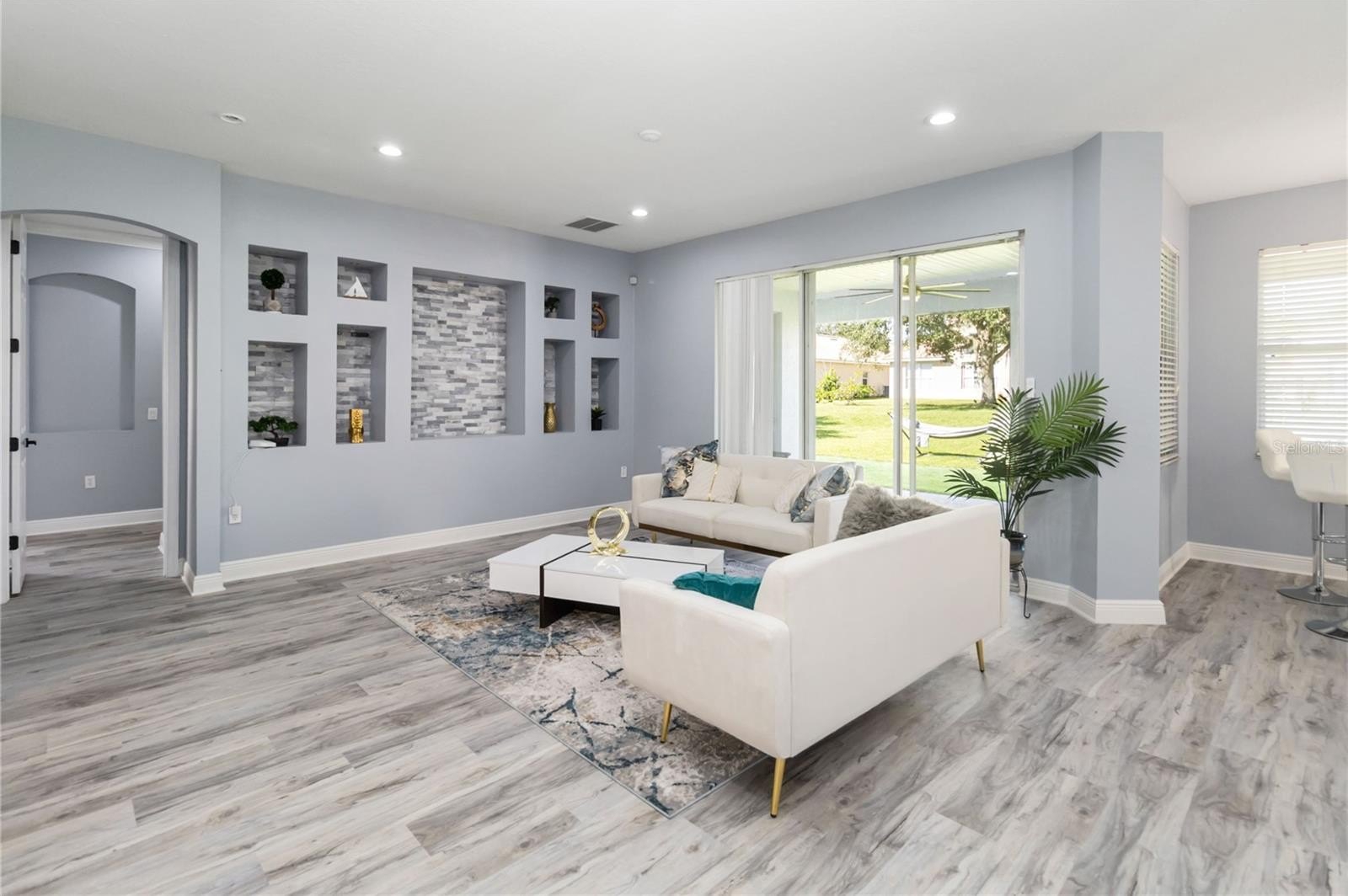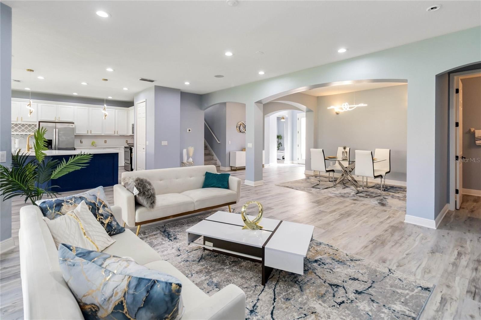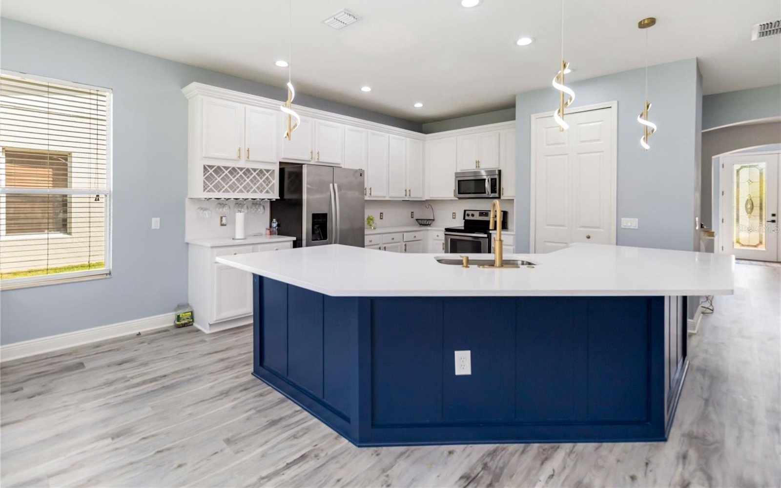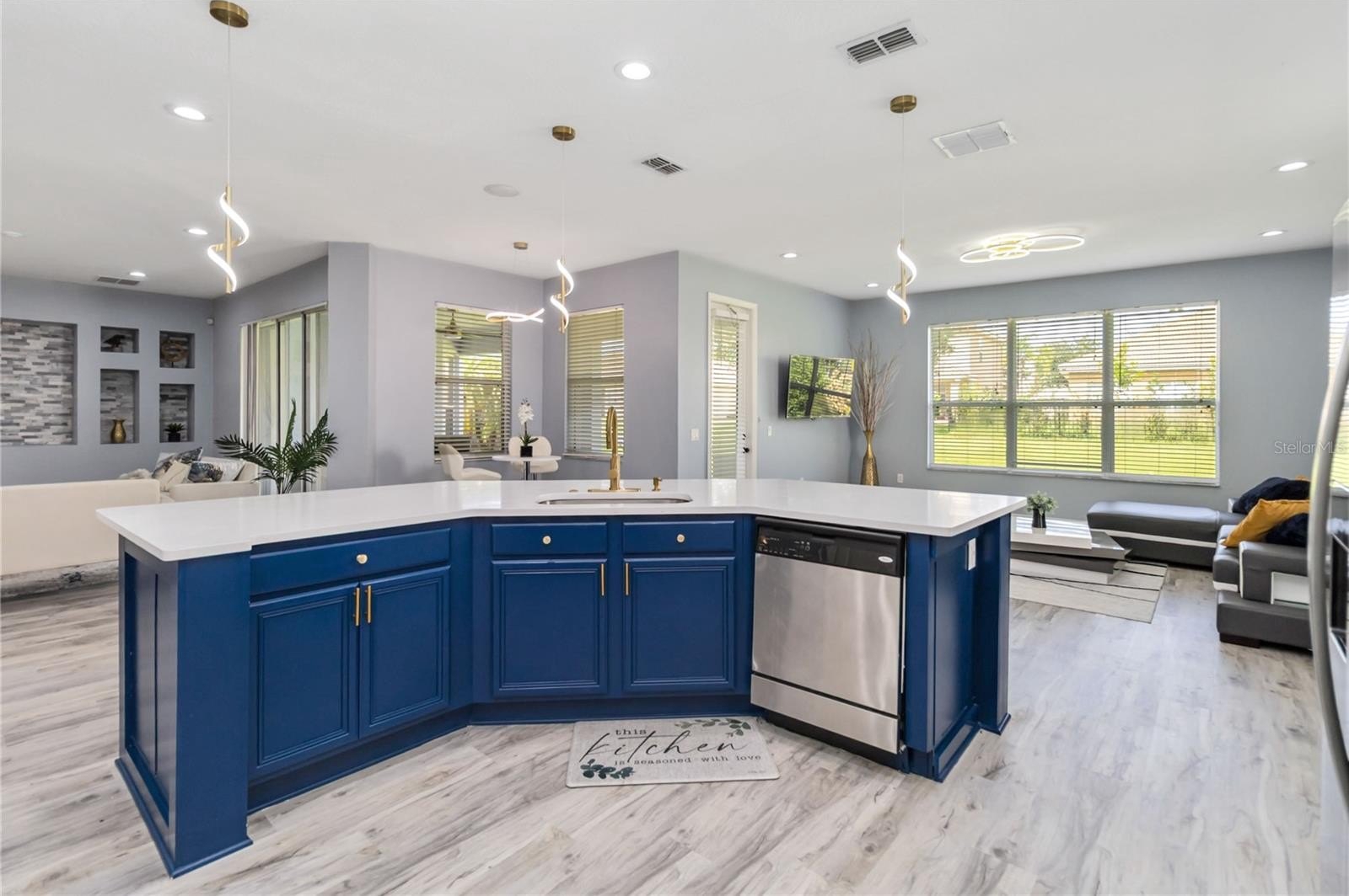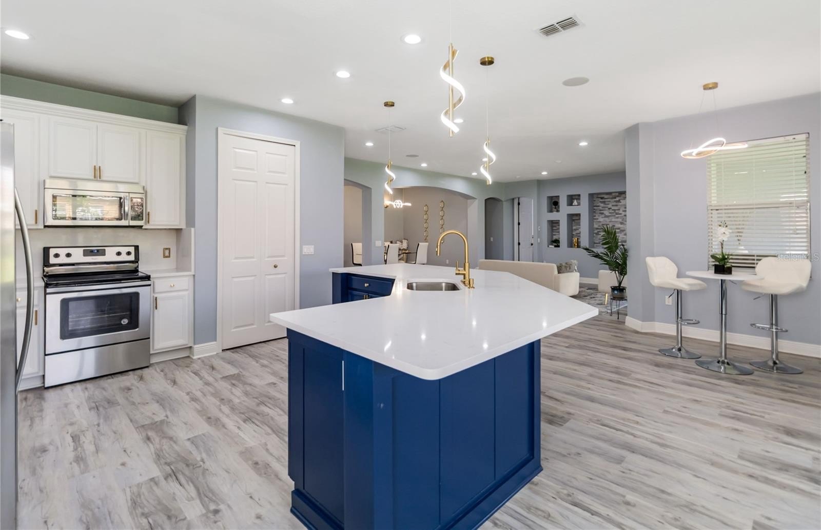 The home has been thoughtfully reimagined with an open floor plan that creates a seamless flow between living, dining, and entertaining spaces. At the heart of the home is a stunning kitchen, featuring a massive island with quartz countertops, custom cabinetry, and high-end finishes that balance sophistication with function.