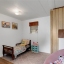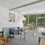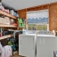 The screened patio leads to an extra storage area with washer/dryer hookups and built-in shelving—a great space for organization.