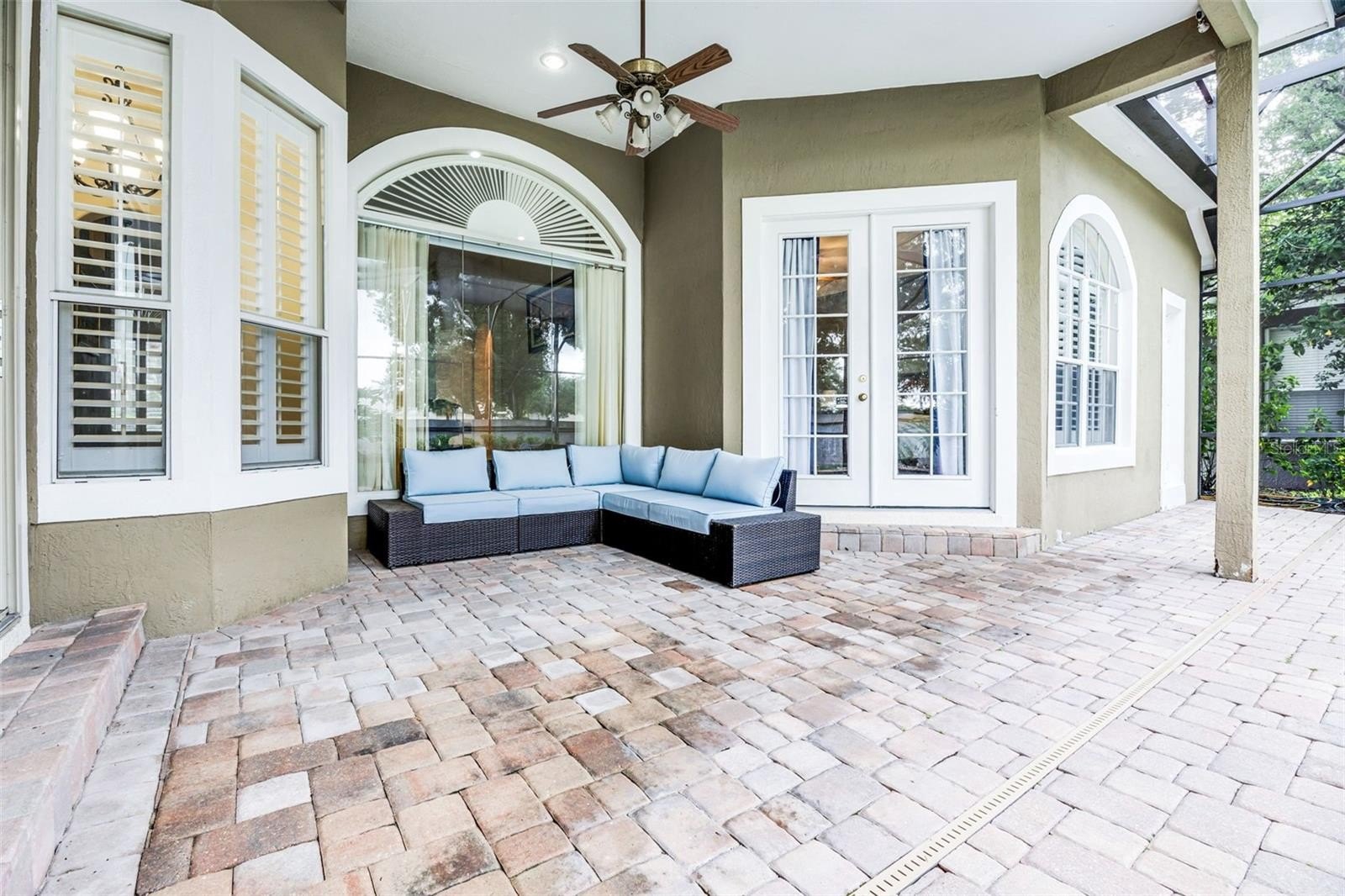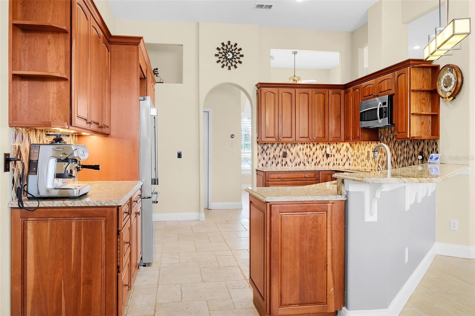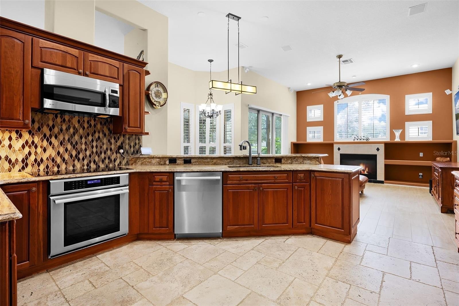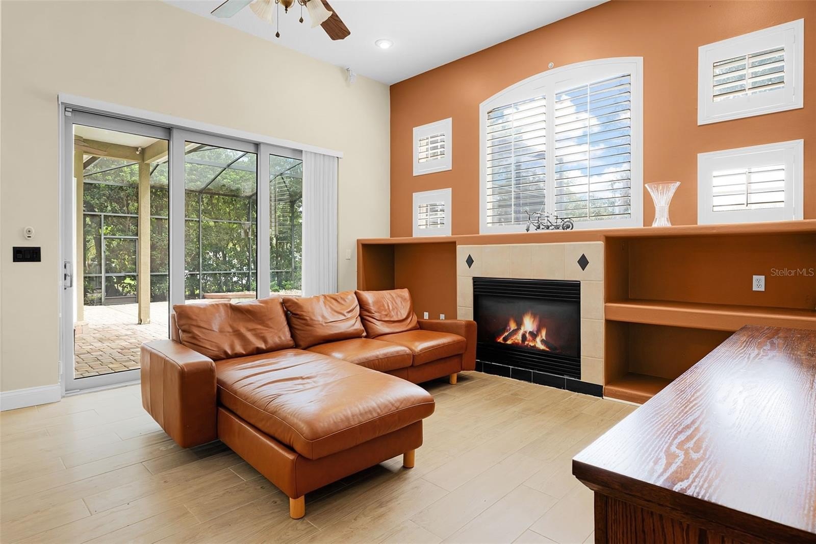 The expansive primary suite offers private access to the lanai and screened pool, with a luxurious spa-style bath featuring a jetted tub, walk-in shower, dual vanities, and a large walk-in closet. The chef’s kitchen includes stainless appliances, generous cabinet space, a breakfast nook, and views of the inviting family room, anchored by a cozy fireplace.