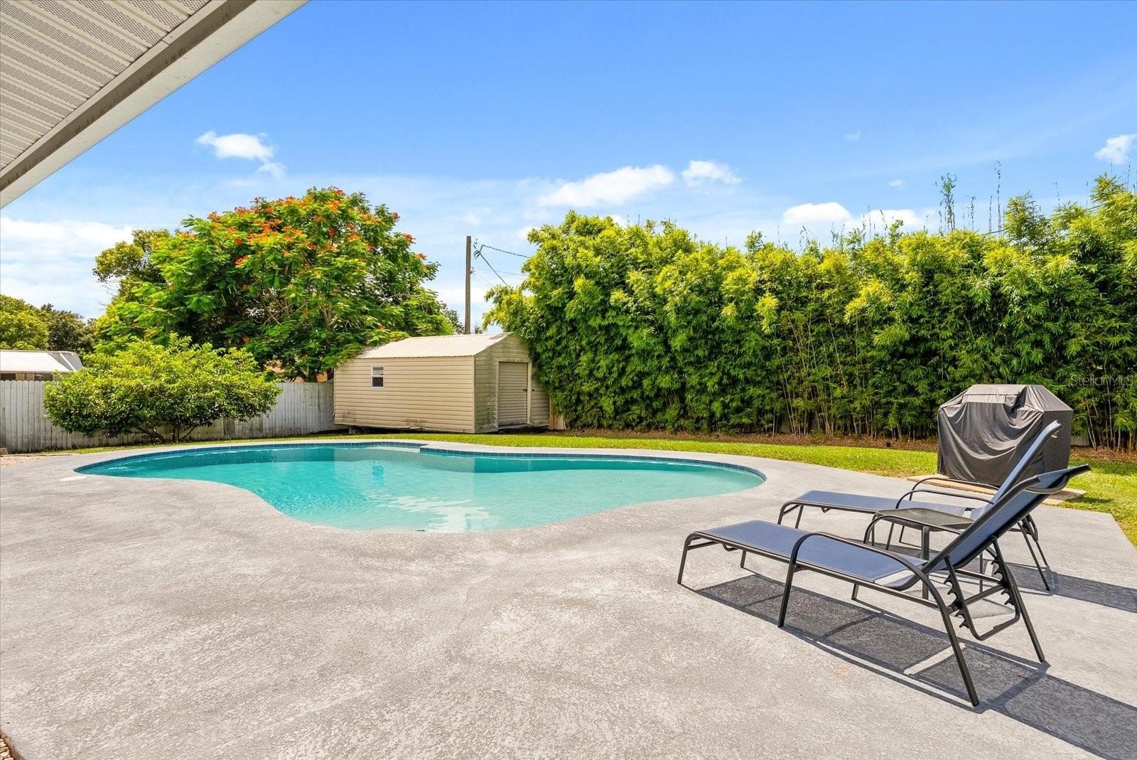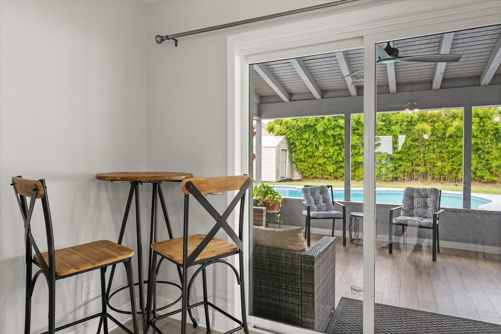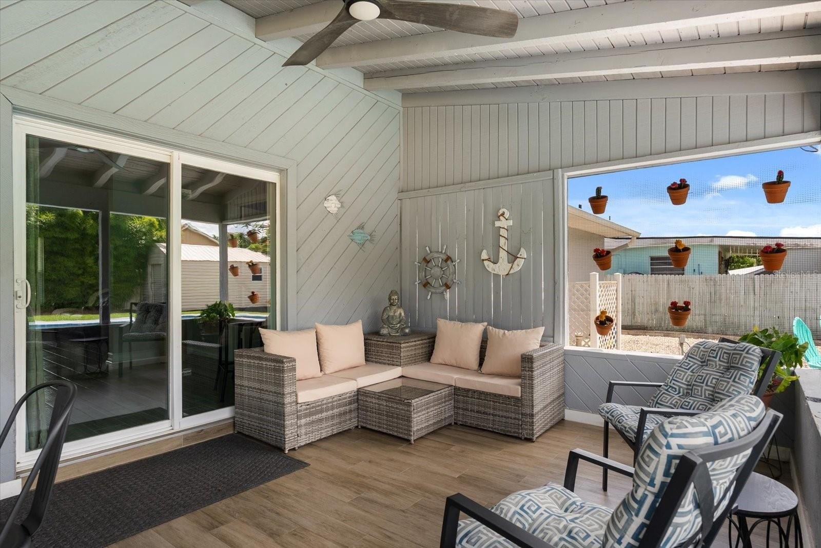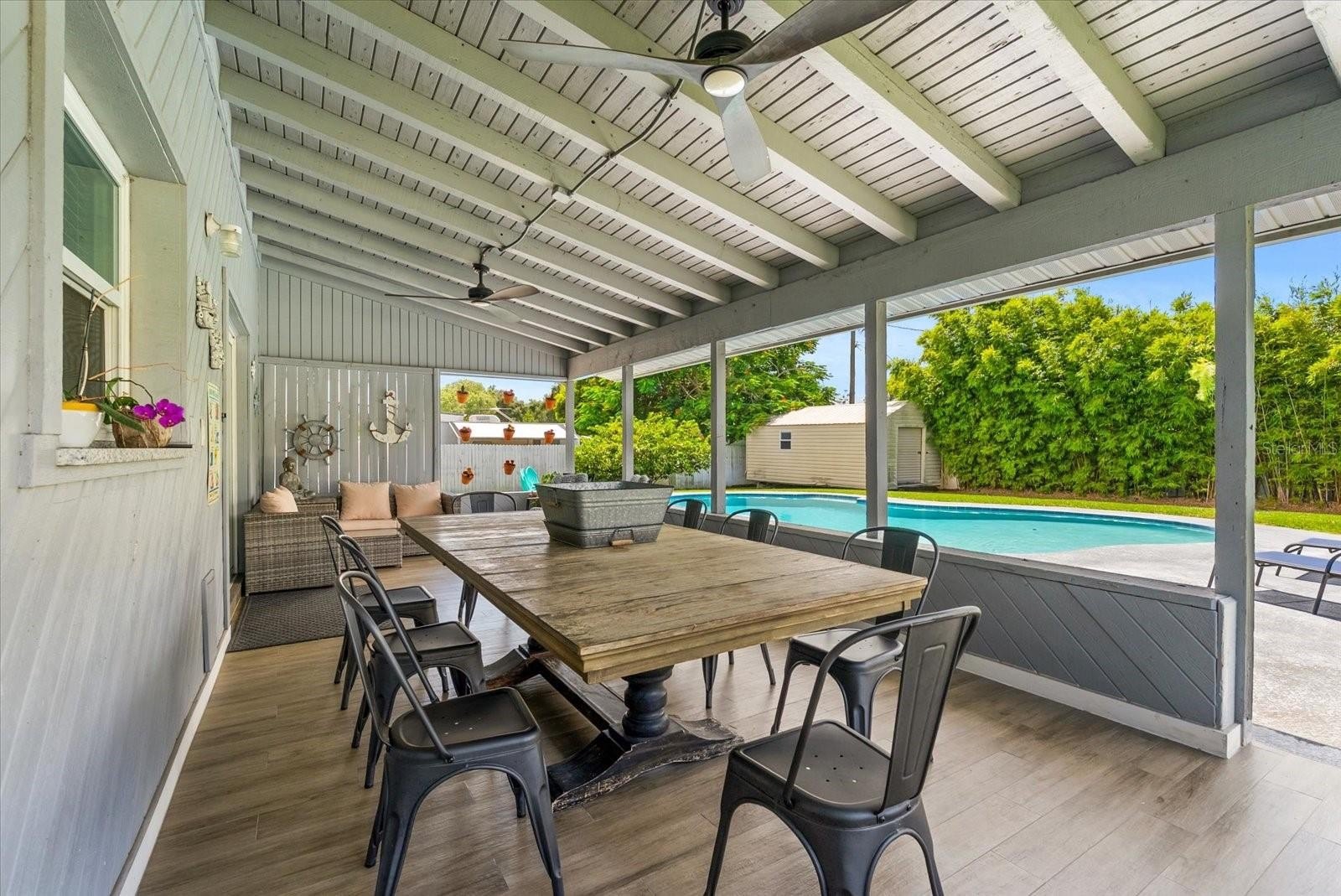 Sliding doors lead to a spacious lanai overlooking the sparkling pool and fully fenced backyard—an outdoor retreat ready for weekend barbecues or quiet evenings under the Florida sky. Recent updates give peace of mind, including a new roof (2021), A/C (2021), resurfaced pool deck (2024), new water heater (2025), fresh stucco and exterior paint (2025), and newer windows (2019).