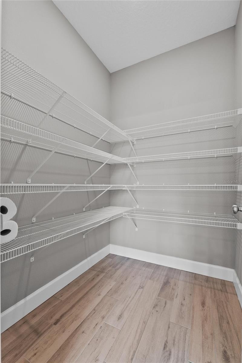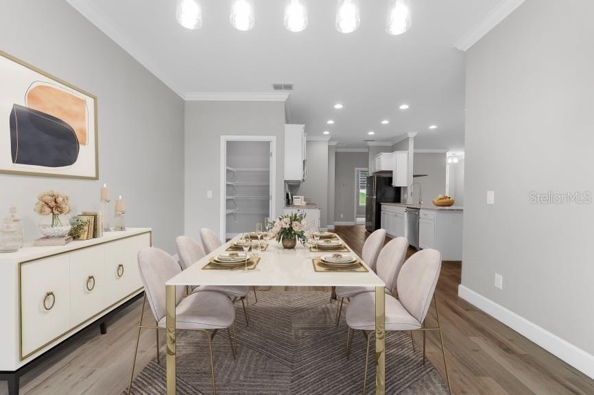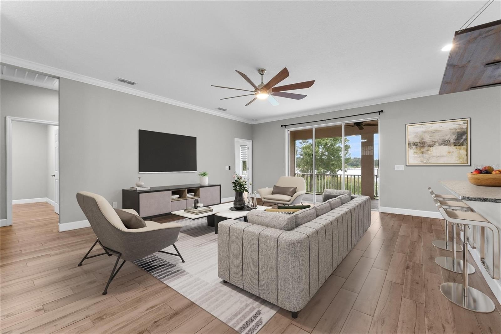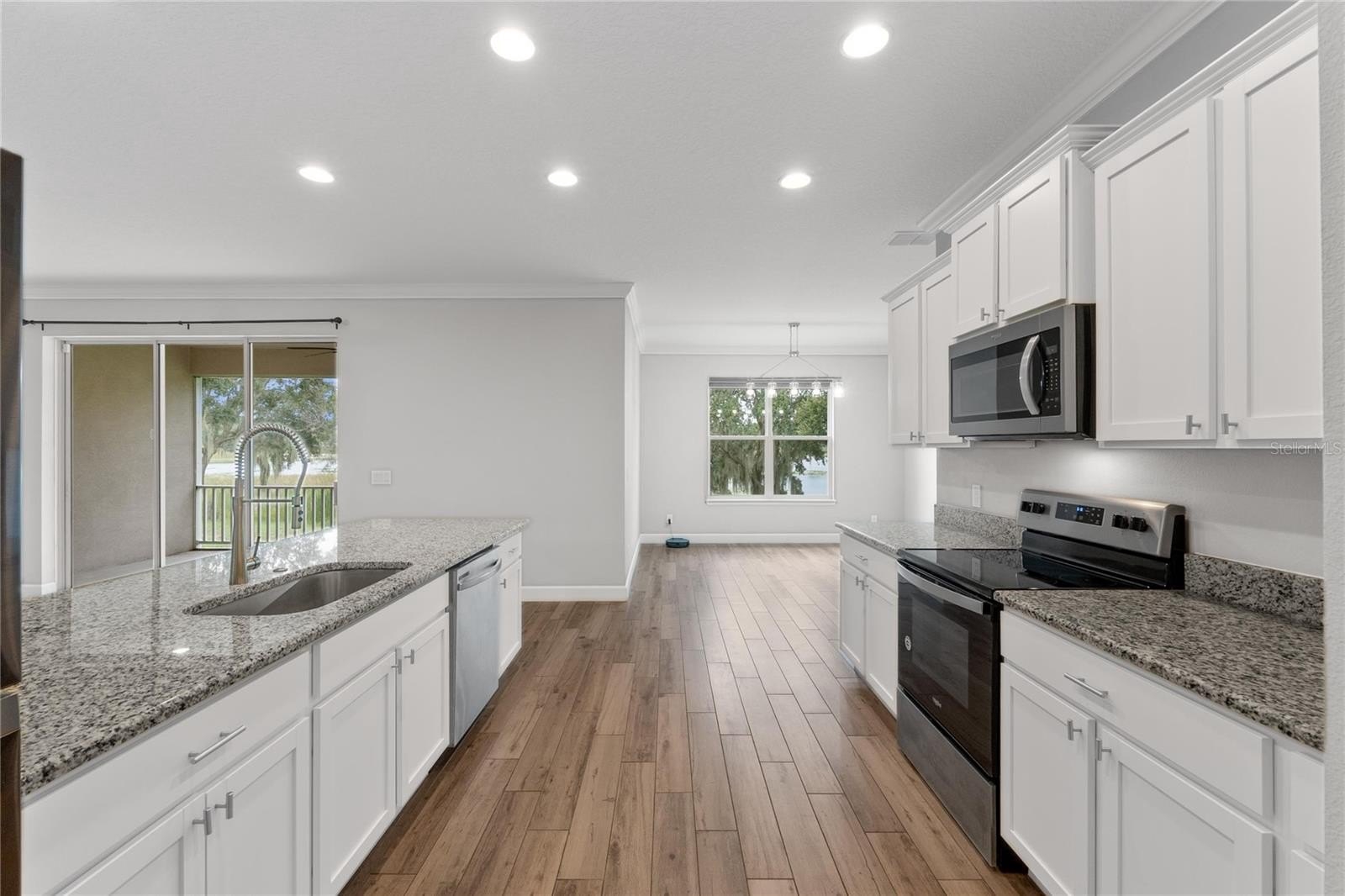 The split floor plan offers privacy in the primary suite while keeping the secondary bedrooms convenient for family or guests. A formal dining room overlooks Lake Eva, providing the perfect setting for memorable meals with a water view. The trifold sliding door showcases wide-open lake views and opens directly to the screened lanai, seamlessly blending indoor and outdoor lakefront living. The kitchen, bathrooms, and laundry room feature granite countertops. The kitchen is further enhanced with ample cabinetry, stainless steel appliances, a breakfast bar, and a large walk-in pantry. The open-concept design with abundant natural light ensures the lake remains the stunning focal point throughout the living and dining areas.