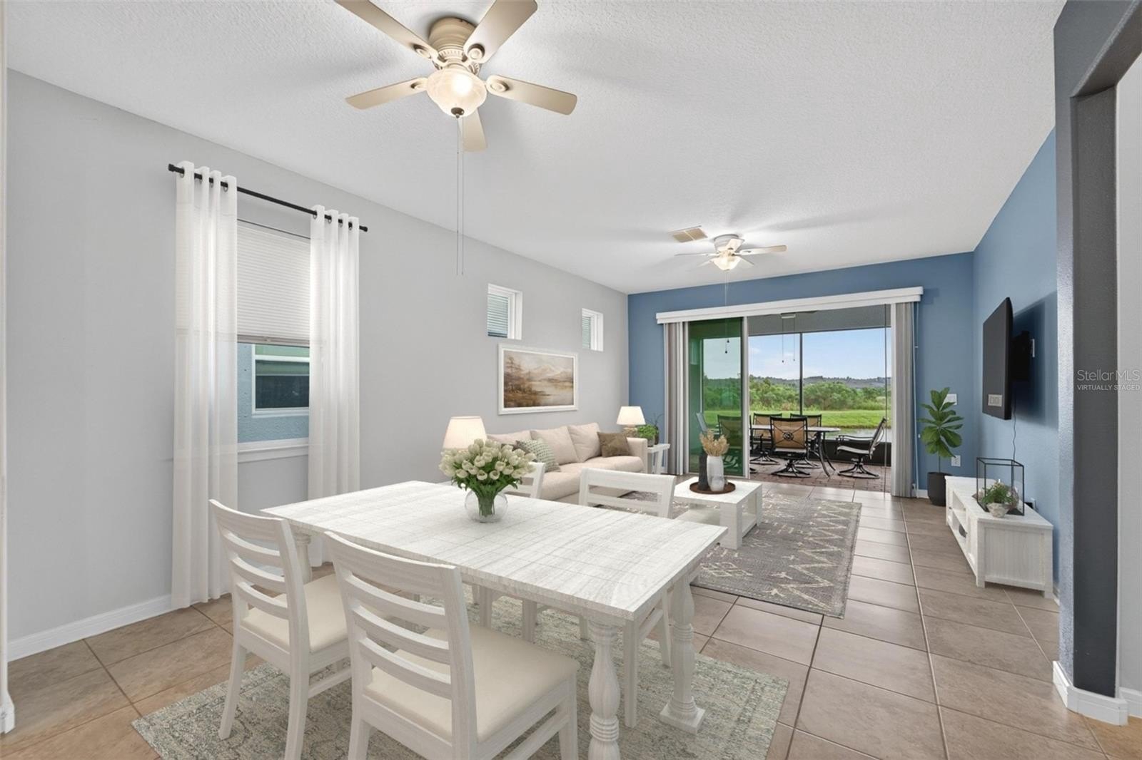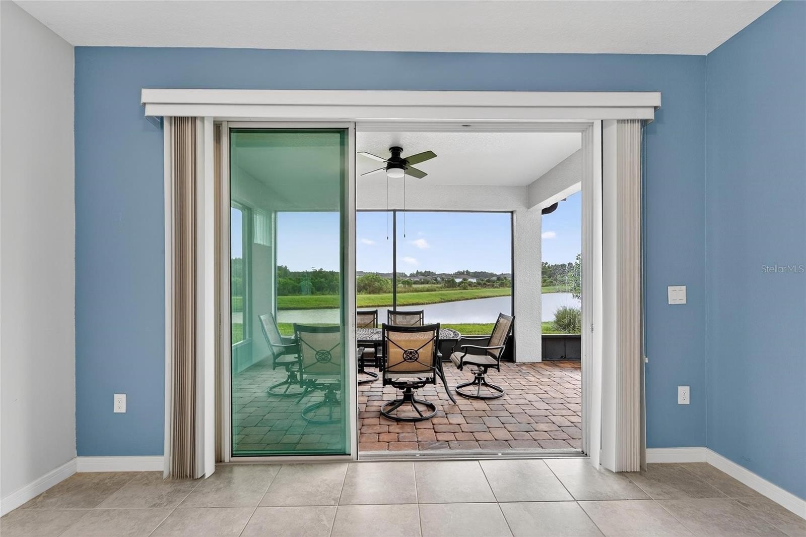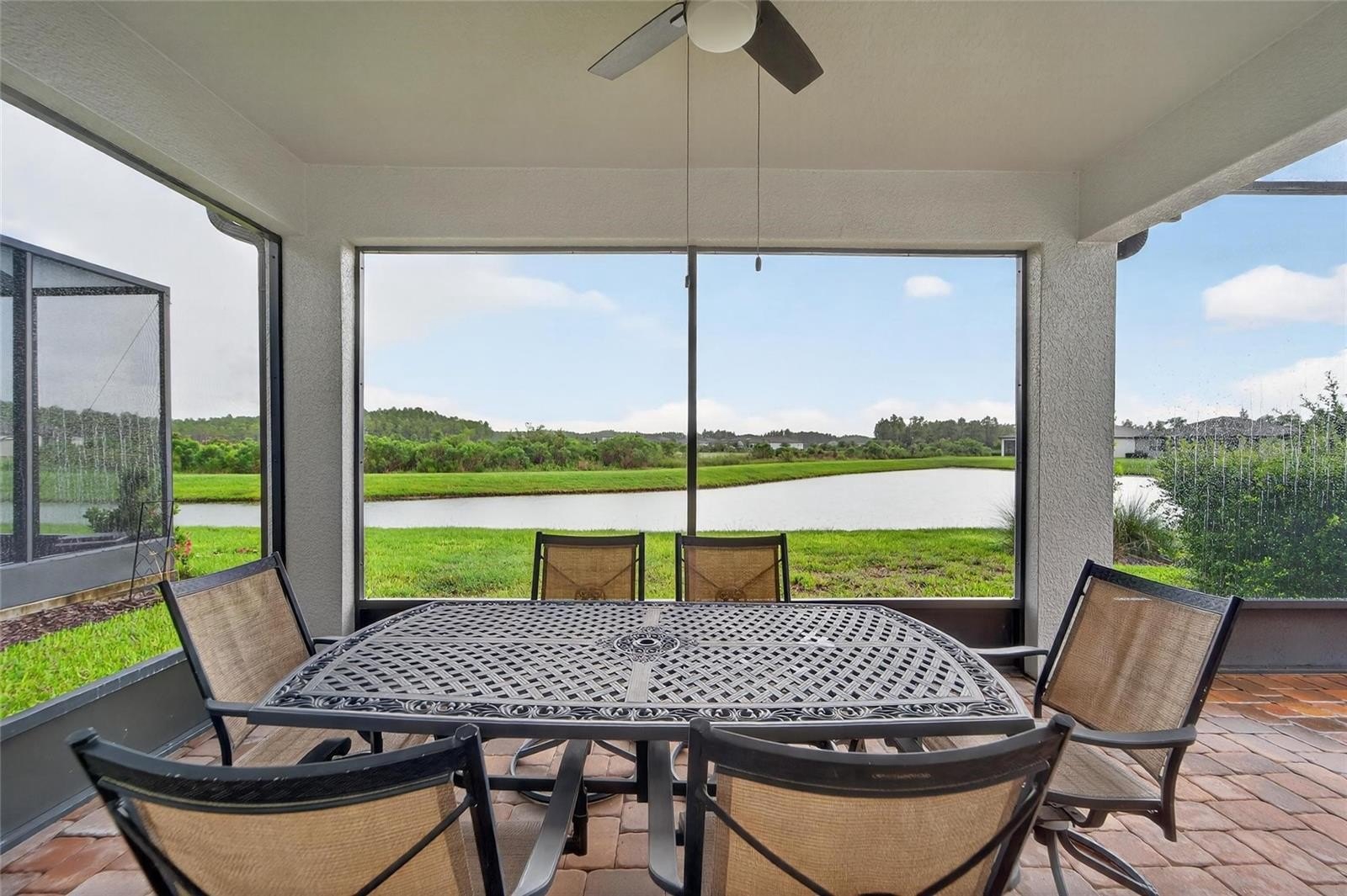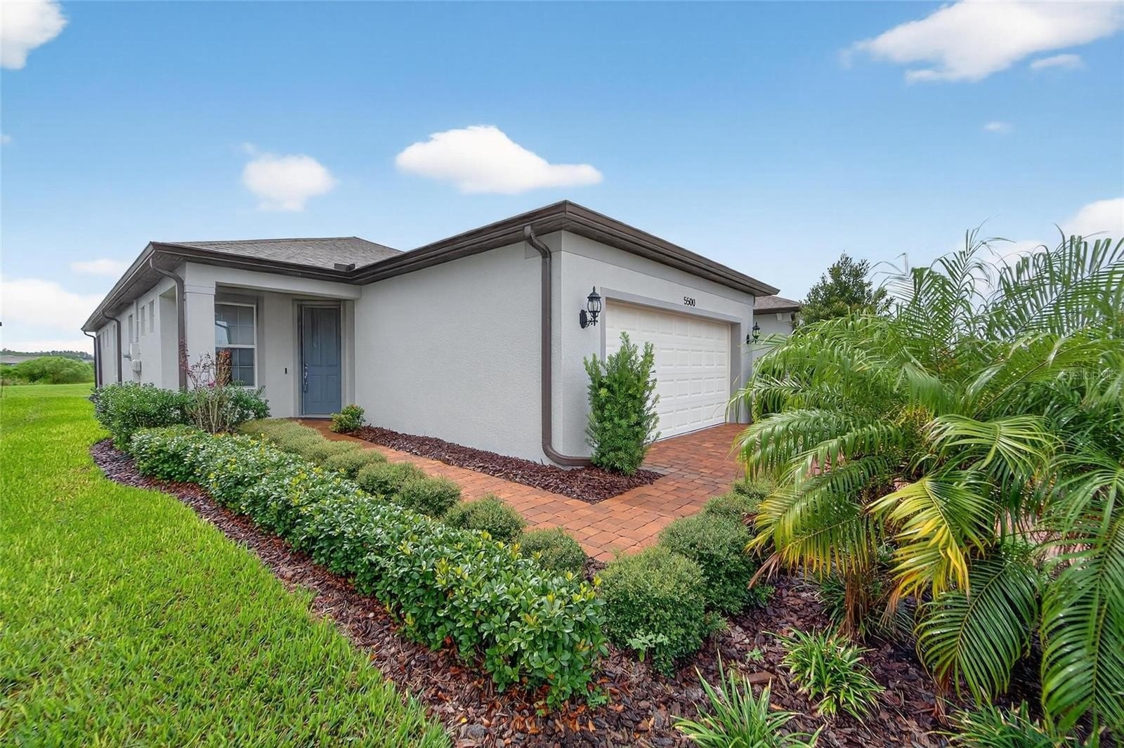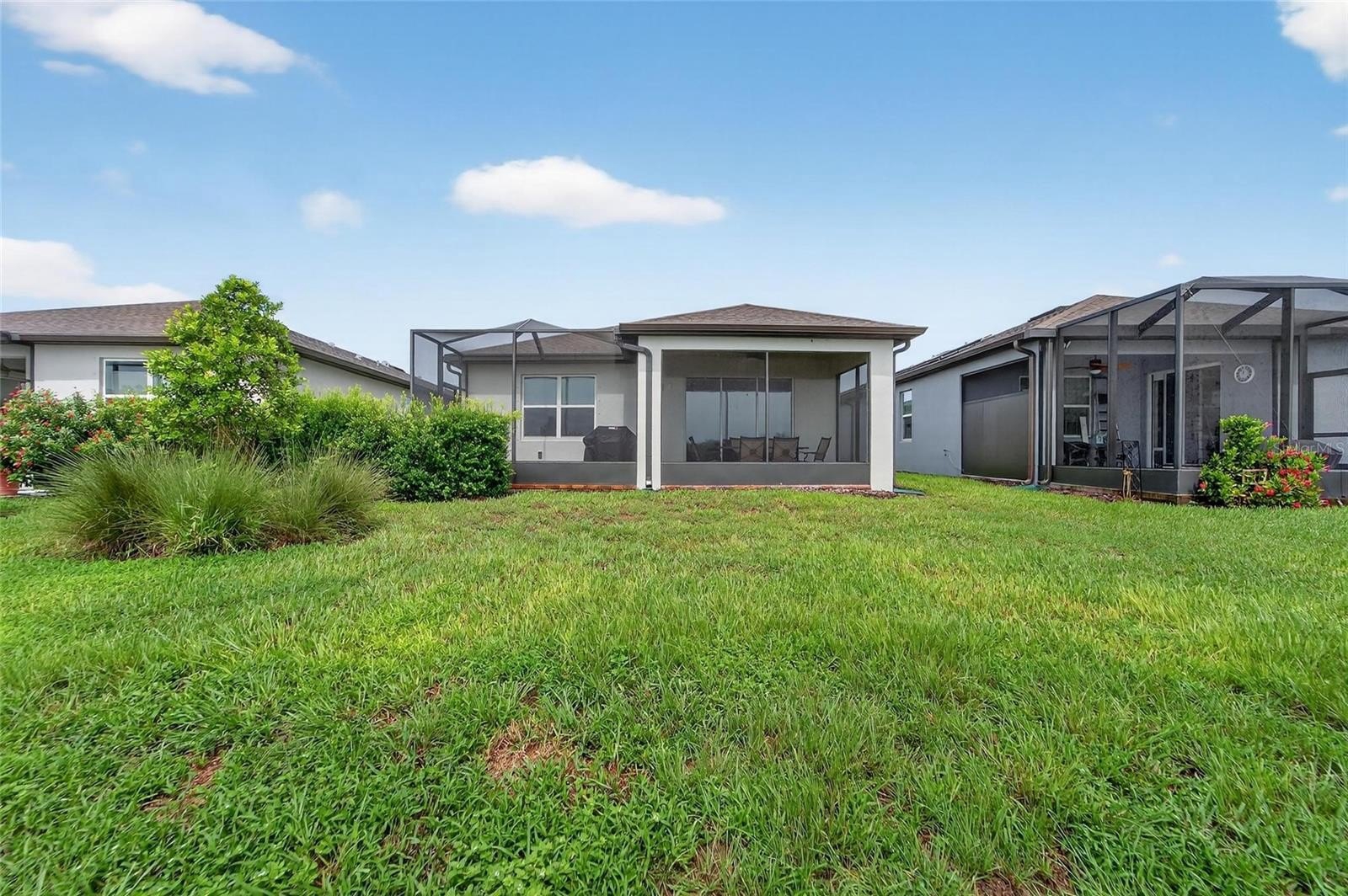 One or more photo(s) has been virtually staged. WATER VIEW! - Enjoy unwinding on your spacious screen enclosed lanai overlooking a tranquil pond. - There you will find a gas line stub, so you can use a natural gas grill. Life is good in this 55+ vibrant Del Webb Bexley community, where a full-time activities director ensures there’s always something fun to do. Step inside this 3 yr new home where just off the foyer you will discover a flex space—ideal for crafting, gaming or working at your desk. The open floor plan creates a roomy feel, perfect for entertaining guests while you cook in your modern kitchen, complete with Whirlpool Stainless Steel appliances, Granite countertops, a chevron tile backsplash, pendant lighting over the breakfast bar and elegant dark cabinetry. Coastal Blue accent walls add a refreshing touch throughout the home. At the front of the home, you’ll find a guest bedroom with a walk-in closet and a full bathroom, while the primary ensuite bedroom is tucked away at the back for maximum privacy. The primary bathroom boasts dual sinks, granite countertops, linen closet and a glass shower with bench and soap niche. Both bedrooms are carpeted, while the rest of the home features beautiful, upgraded large-format tile flooring. Storage is plentiful with a coat closet, linen closet and an extra-large primary suite walk-in closet. The inside laundry room includes a Whirlpool washer and dryer for your convenience. The epoxy finished two car garage has been extended by four feet, providing space for an extra-long SUV or additional storage. Your monthly HOA fee includes the use and maintenance of state-of-the-art amenities, landscaping within the common areas inside of the gates and maintenance of the landscape on your home site. In addition your monthly fee includes a broad internet and cable TV package. In this gated community the clubhouse features a fitness center, ball room, multi-purpose rooms, clubs, planned activities, a bistro and more. Outdoors you will enjoy bocce ball, pickle ball, tennis, a resort style zero entry heated pool, additional walking resistance pool, spa, community garden and even a dog park. Feel free to jump on your golf cart and drive to the Meridian Clubhouse where you will meet up with your new friends and neighbors!