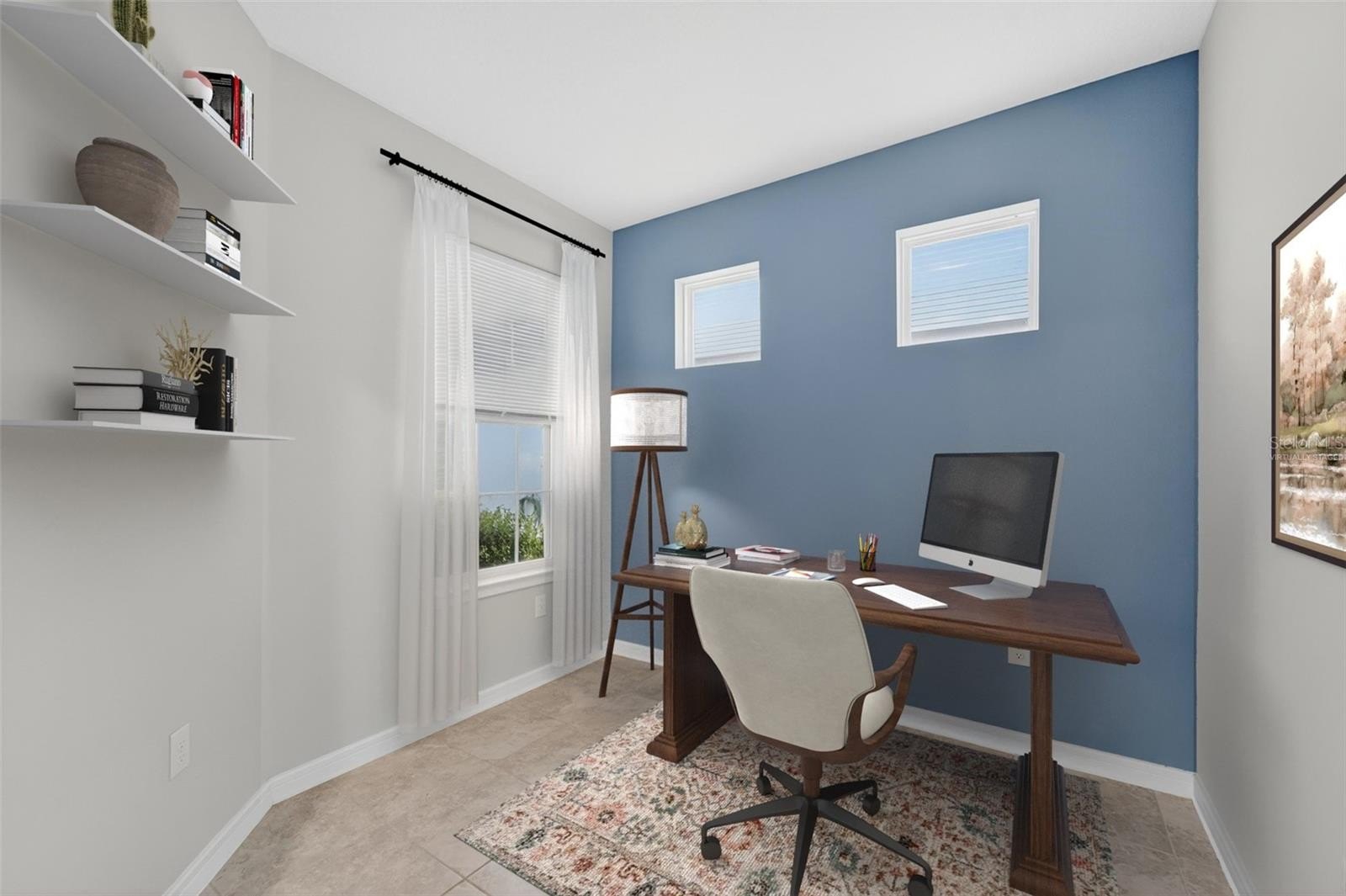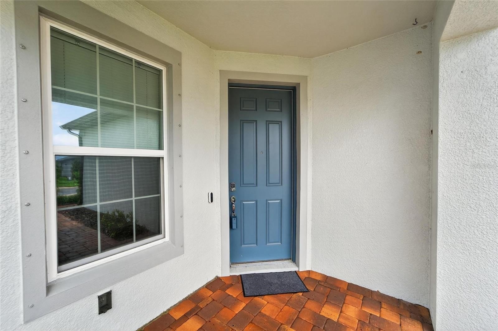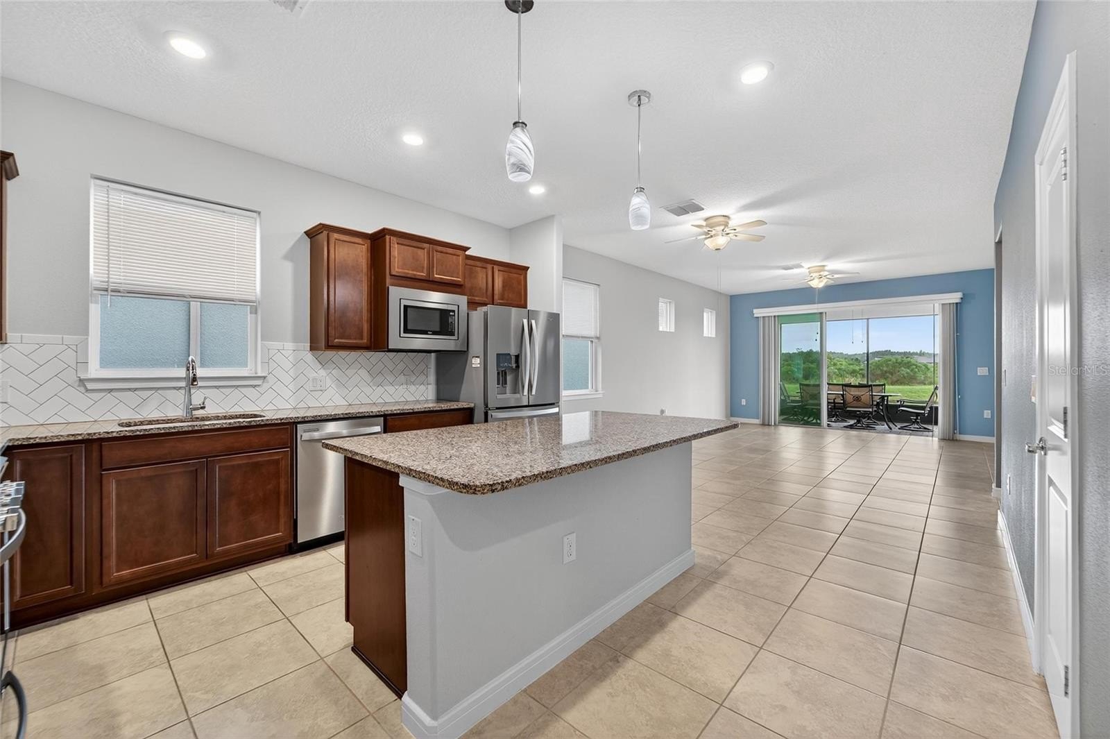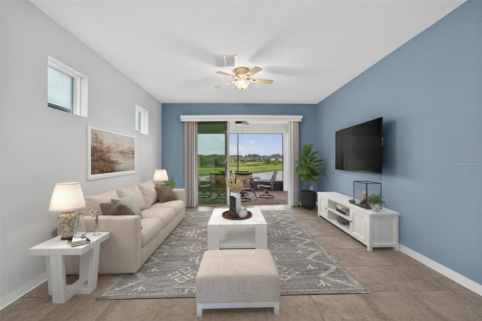 One or more photo(s) has been virtually staged. WATER VIEW! - Enjoy unwinding on your spacious screen enclosed lanai overlooking a tranquil pond. - There you will find a gas line stub, so you can use a natural gas grill. Life is good in this 55+ vibrant Del Webb Bexley community, where a full-time activities director ensures there’s always something fun to do. Step inside this 3 yr new home where just off the foyer you will discover a flex space—ideal for crafting, gaming or working at your desk. The open floor plan creates a roomy feel, perfect for entertaining guests while you cook in your modern kitchen, complete with Whirlpool Stainless Steel appliances, Granite countertops, a chevron tile backsplash, pendant lighting over the breakfast bar and elegant dark cabinetry. Coastal Blue accent walls add a refreshing touch throughout the home. At the front of the home, you’ll find a guest bedroom with a walk-in closet and a full bathroom, while the primary ensuite bedroom is tucked away at the back for maximum privacy. The primary bathroom boasts dual sinks, granite countertops, linen closet and a glass shower with bench and soap niche. Both bedrooms are carpeted, while the rest of the home features beautiful, upgraded large-format tile flooring. Storage is plentiful with a coat closet, linen closet and an extra-large primary suite walk-in closet. The inside laundry room includes a Whirlpool washer and dryer for your convenience. The epoxy finished two car garage has been extended by four feet, providing space for an extra-long SUV or additional storage. Your monthly HOA fee includes the use and maintenance of state-of-the-art amenities, landscaping within the common areas inside of the gates and maintenance of the landscape on your home site. In addition your monthly fee includes a broad internet and cable TV package. In this gated community the clubhouse features a fitness center, ball room, multi-purpose rooms, clubs, planned activities, a bistro and more. Outdoors you will enjoy bocce ball, pickle ball, tennis, a resort style zero entry heated pool, additional walking resistance pool, spa, community garden and even a dog park. Feel free to jump on your golf cart and drive to the Meridian Clubhouse where you will meet up with your new friends and neighbors!