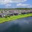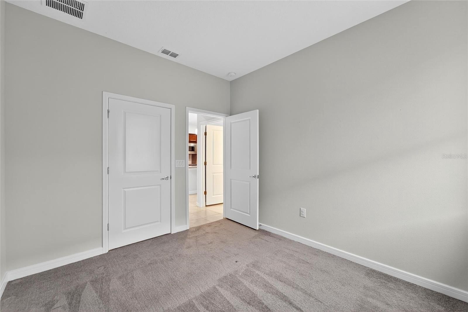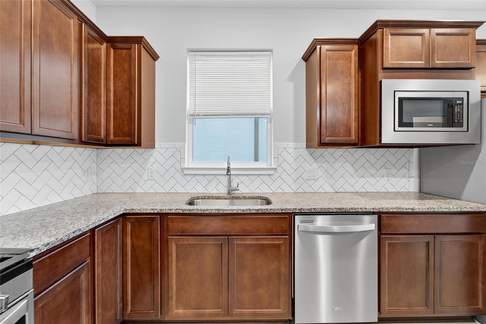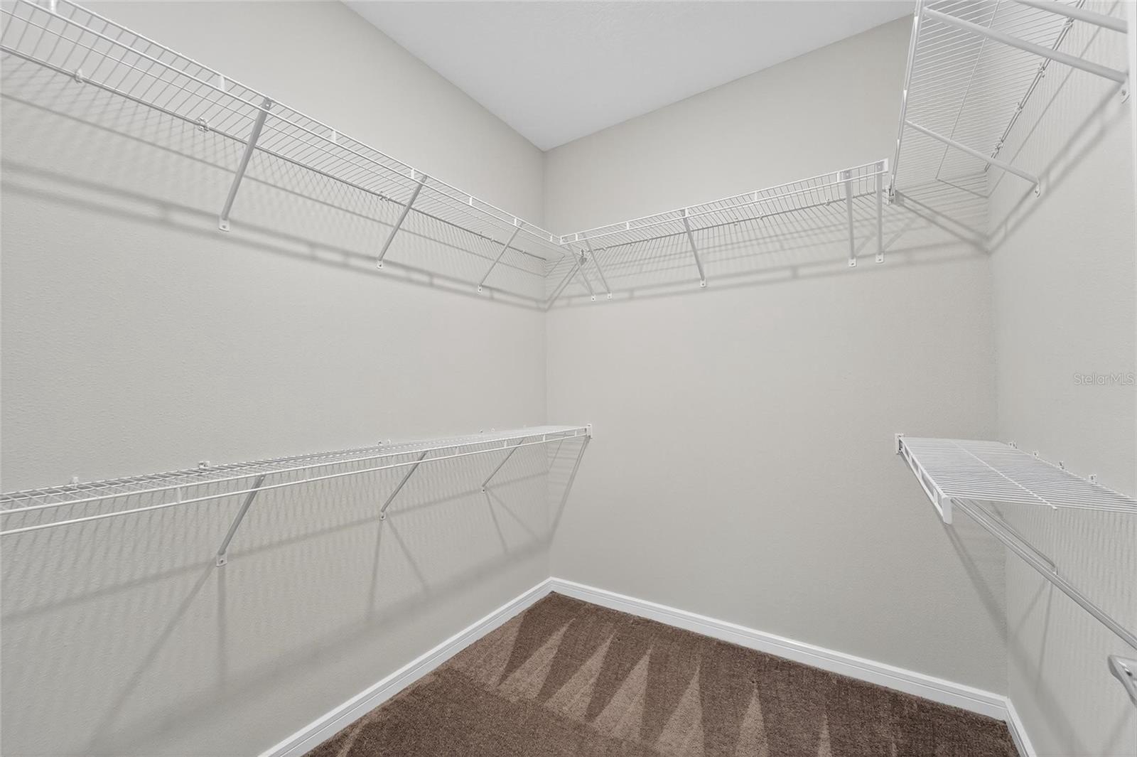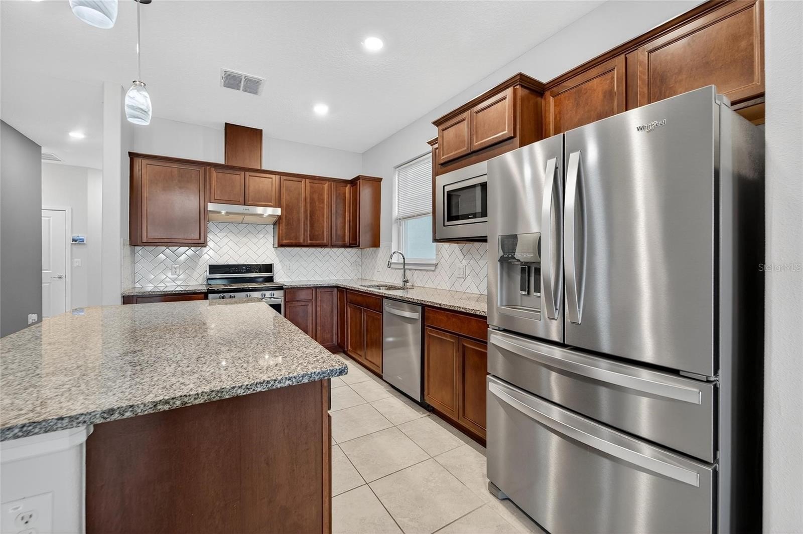 One or more photo(s) has been virtually staged. WATER VIEW! - Enjoy unwinding on your spacious screen enclosed lanai overlooking a tranquil pond. - There you will find a gas line stub, so you can use a natural gas grill. Life is good in this 55+ vibrant Del Webb Bexley community, where a full-time activities director ensures there’s always something fun to do. Step inside this 3 yr new home where just off the foyer you will discover a flex space—ideal for crafting, gaming or working at your desk. The open floor plan creates a roomy feel, perfect for entertaining guests while you cook in your modern kitchen, complete with Whirlpool Stainless Steel appliances, Granite countertops, a chevron tile backsplash, pendant lighting over the breakfast bar and elegant dark cabinetry. Coastal Blue accent walls add a refreshing touch throughout the home. At the front of the home, you’ll find a guest bedroom with a walk-in closet and a full bathroom, while the primary ensuite bedroom is tucked away at the back for maximum privacy. The primary bathroom boasts dual sinks, granite countertops, linen closet and a glass shower with bench and soap niche. Both bedrooms are carpeted, while the rest of the home features beautiful, upgraded large-format tile flooring. Storage is plentiful with a coat closet, linen closet and an extra-large primary suite walk-in closet. The inside laundry room includes a Whirlpool washer and dryer for your convenience. The epoxy finished two car garage has been extended by four feet, providing space for an extra-long SUV or additional storage. Your monthly HOA fee includes the use and maintenance of state-of-the-art amenities, landscaping within the common areas inside of the gates and maintenance of the landscape on your home site. In addition your monthly fee includes a broad internet and cable TV package. In this gated community the clubhouse features a fitness center, ball room, multi-purpose rooms, clubs, planned activities, a bistro and more. Outdoors you will enjoy bocce ball, pickle ball, tennis, a resort style zero entry heated pool, additional walking resistance pool, spa, community garden and even a dog park. Feel free to jump on your golf cart and drive to the Meridian Clubhouse where you will meet up with your new friends and neighbors!