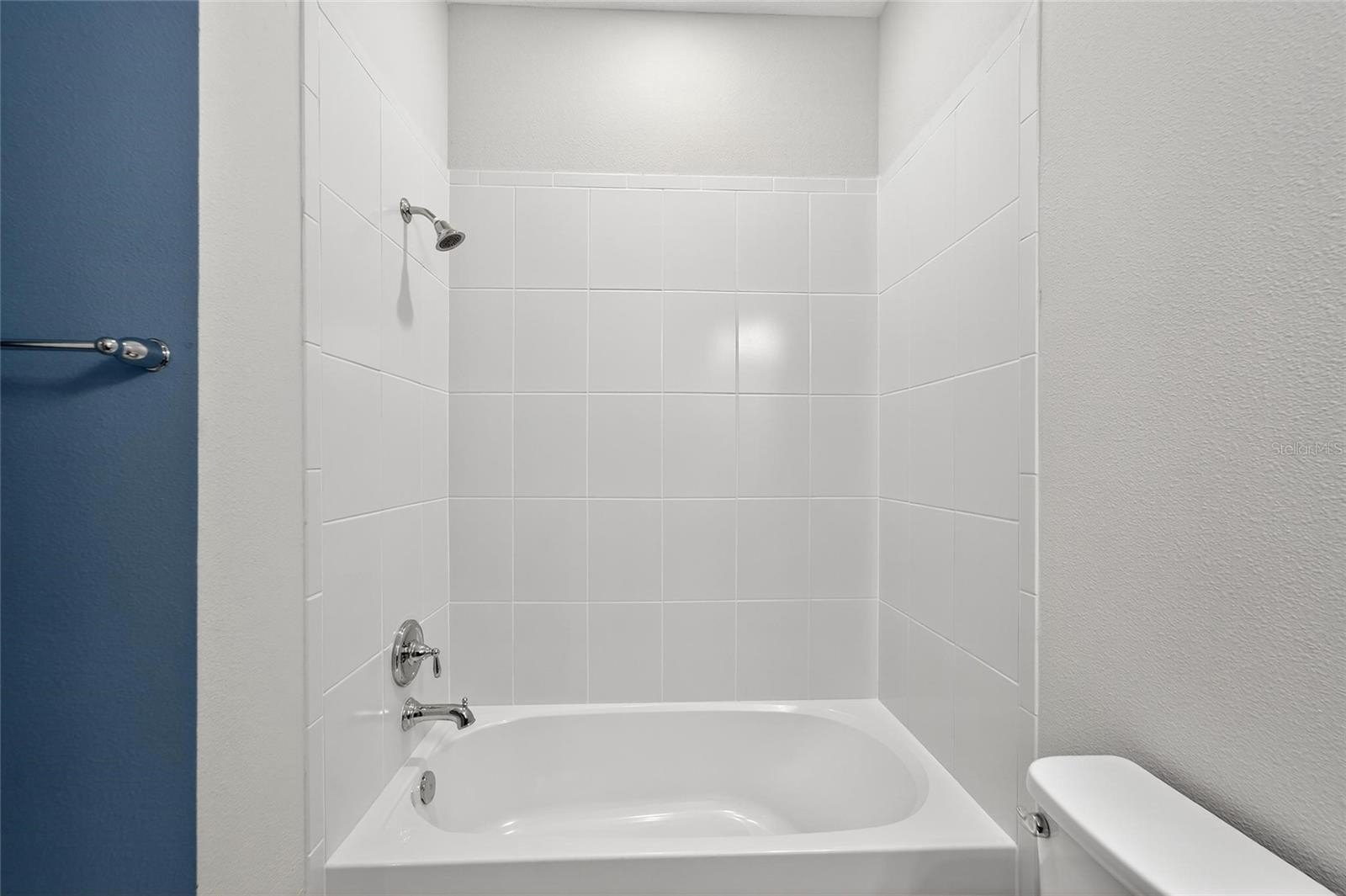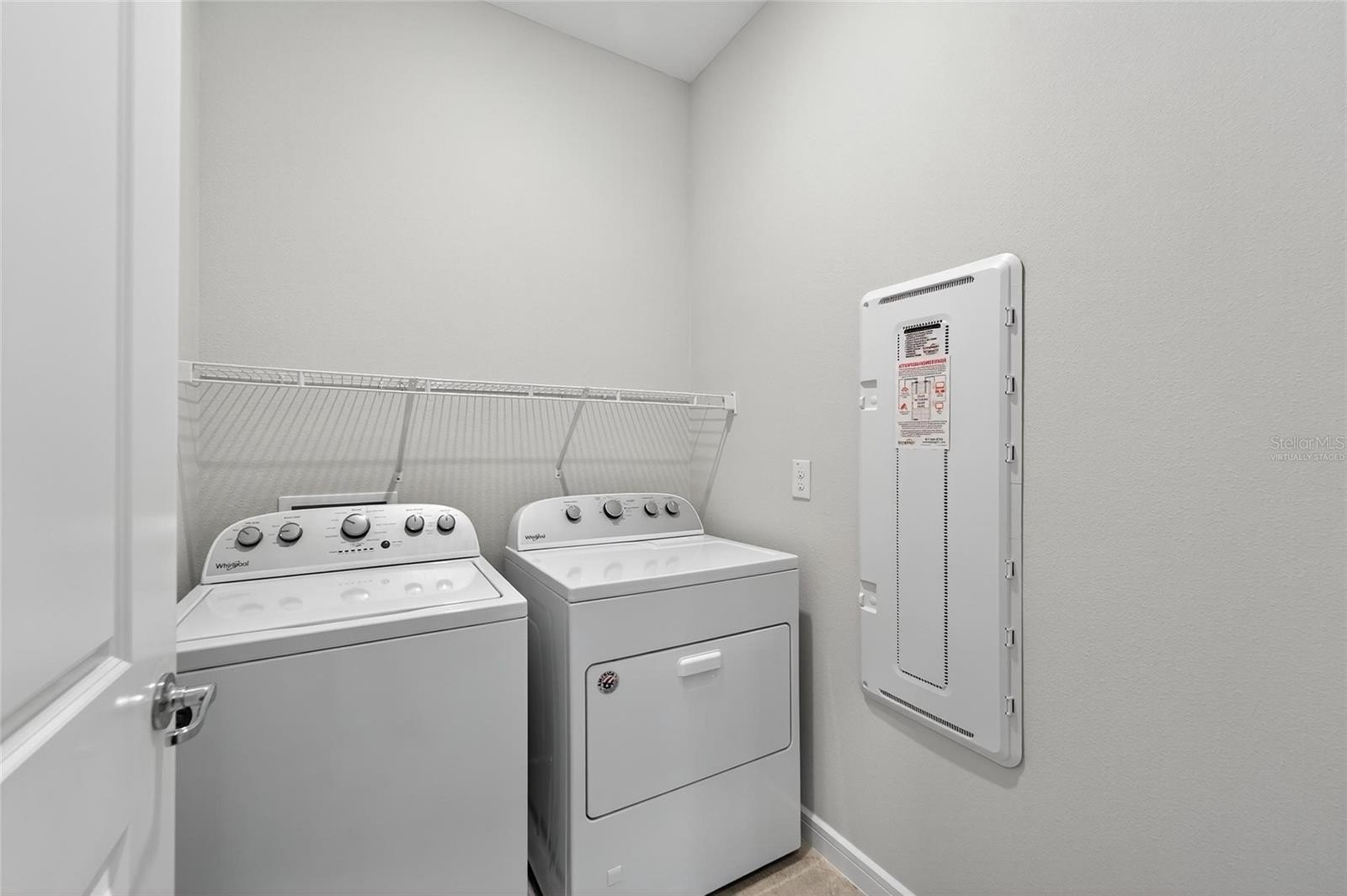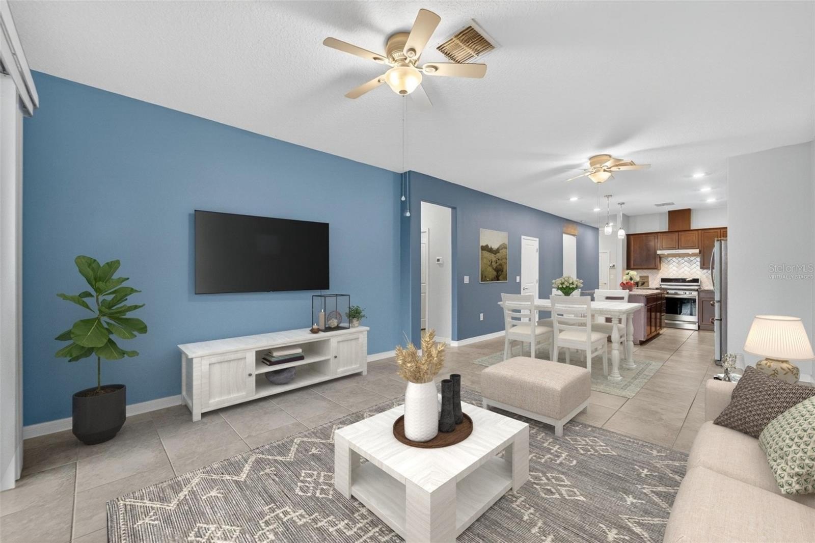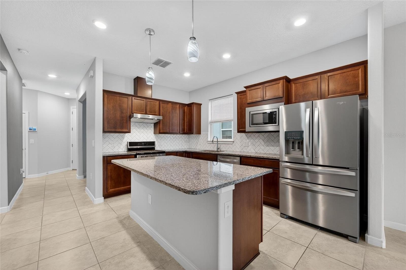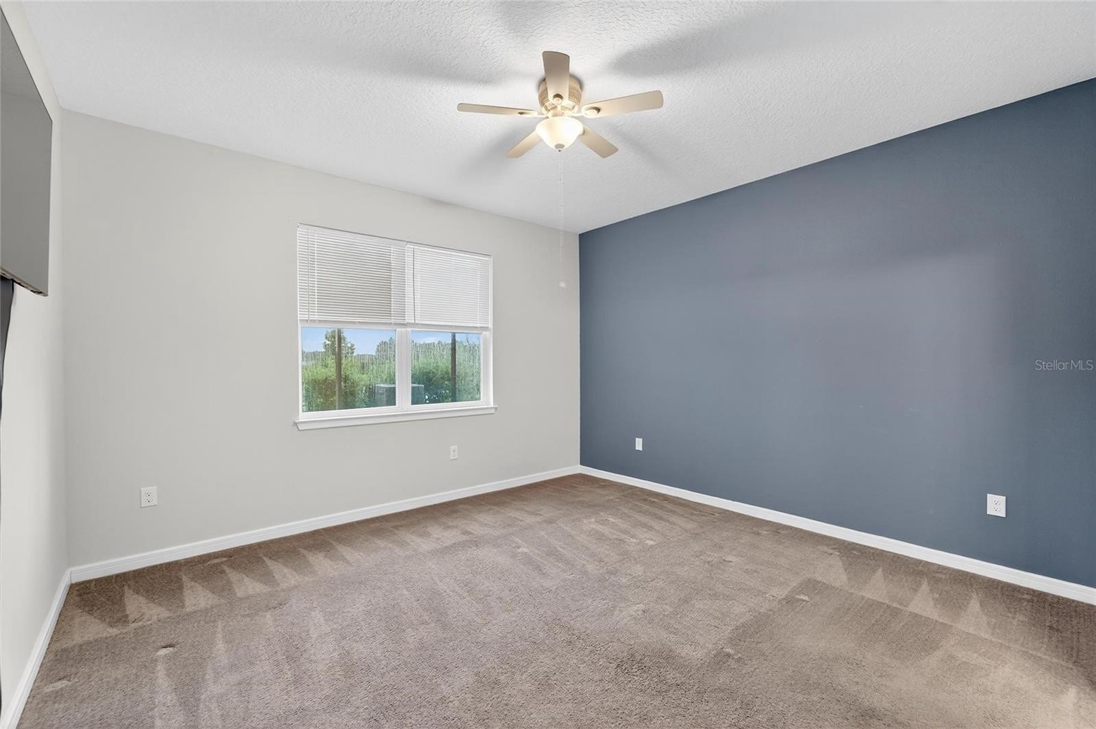 One or more photo(s) has been virtually staged. WATER VIEW! - Enjoy unwinding on your spacious screen enclosed lanai overlooking a tranquil pond. - There you will find a gas line stub, so you can use a natural gas grill. Life is good in this 55+ vibrant Del Webb Bexley community, where a full-time activities director ensures there’s always something fun to do. Step inside this 3 yr new home where just off the foyer you will discover a flex space—ideal for crafting, gaming or working at your desk. The open floor plan creates a roomy feel, perfect for entertaining guests while you cook in your modern kitchen, complete with Whirlpool Stainless Steel appliances, Granite countertops, a chevron tile backsplash, pendant lighting over the breakfast bar and elegant dark cabinetry. Coastal Blue accent walls add a refreshing touch throughout the home. At the front of the home, you’ll find a guest bedroom with a walk-in closet and a full bathroom, while the primary ensuite bedroom is tucked away at the back for maximum privacy. The primary bathroom boasts dual sinks, granite countertops, linen closet and a glass shower with bench and soap niche. Both bedrooms are carpeted, while the rest of the home features beautiful, upgraded large-format tile flooring. Storage is plentiful with a coat closet, linen closet and an extra-large primary suite walk-in closet. The inside laundry room includes a Whirlpool washer and dryer for your convenience. The epoxy finished two car garage has been extended by four feet, providing space for an extra-long SUV or additional storage. Your monthly HOA fee includes the use and maintenance of state-of-the-art amenities, landscaping within the common areas inside of the gates and maintenance of the landscape on your home site. In addition your monthly fee includes a broad internet and cable TV package. In this gated community the clubhouse features a fitness center, ball room, multi-purpose rooms, clubs, planned activities, a bistro and more. Outdoors you will enjoy bocce ball, pickle ball, tennis, a resort style zero entry heated pool, additional walking resistance pool, spa, community garden and even a dog park. Feel free to jump on your golf cart and drive to the Meridian Clubhouse where you will meet up with your new friends and neighbors!