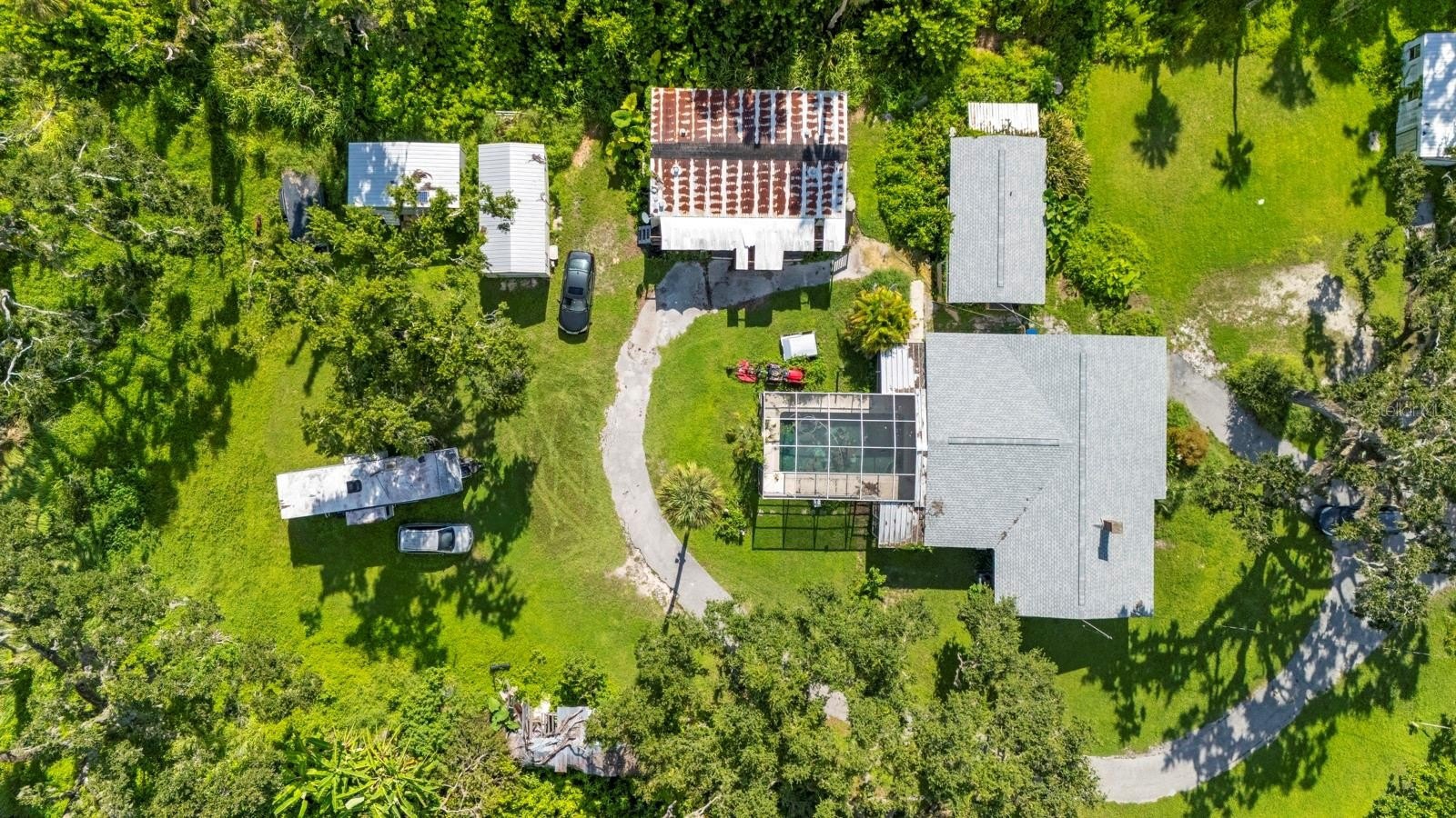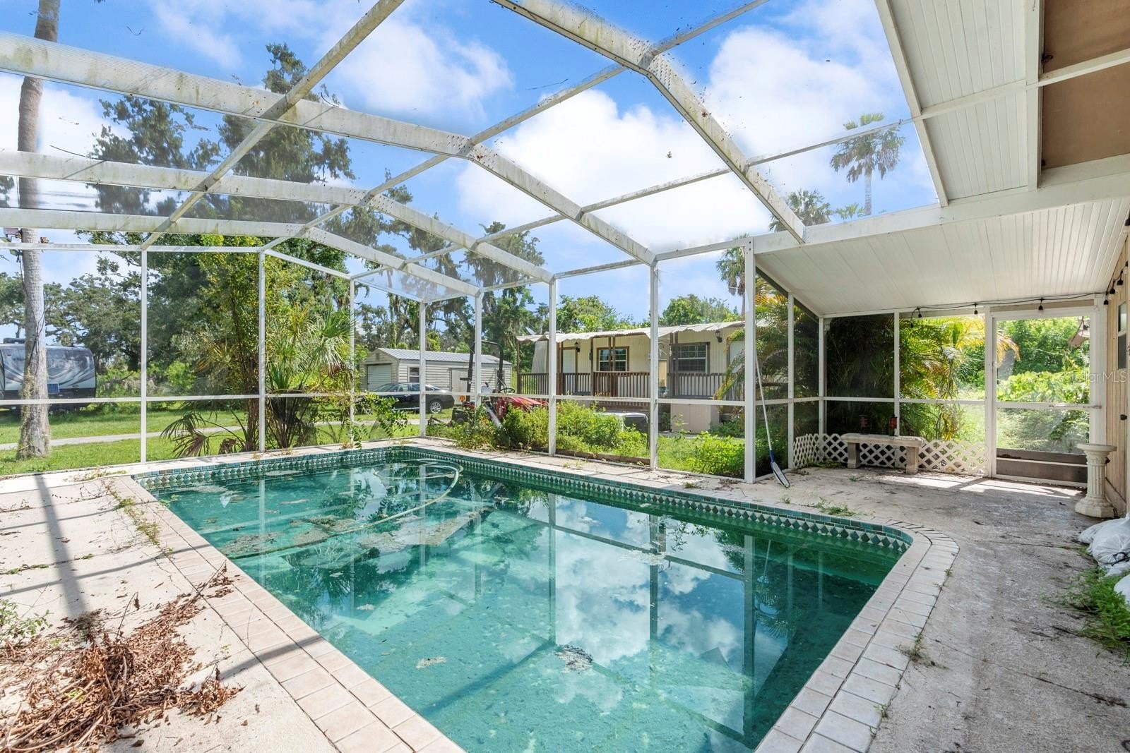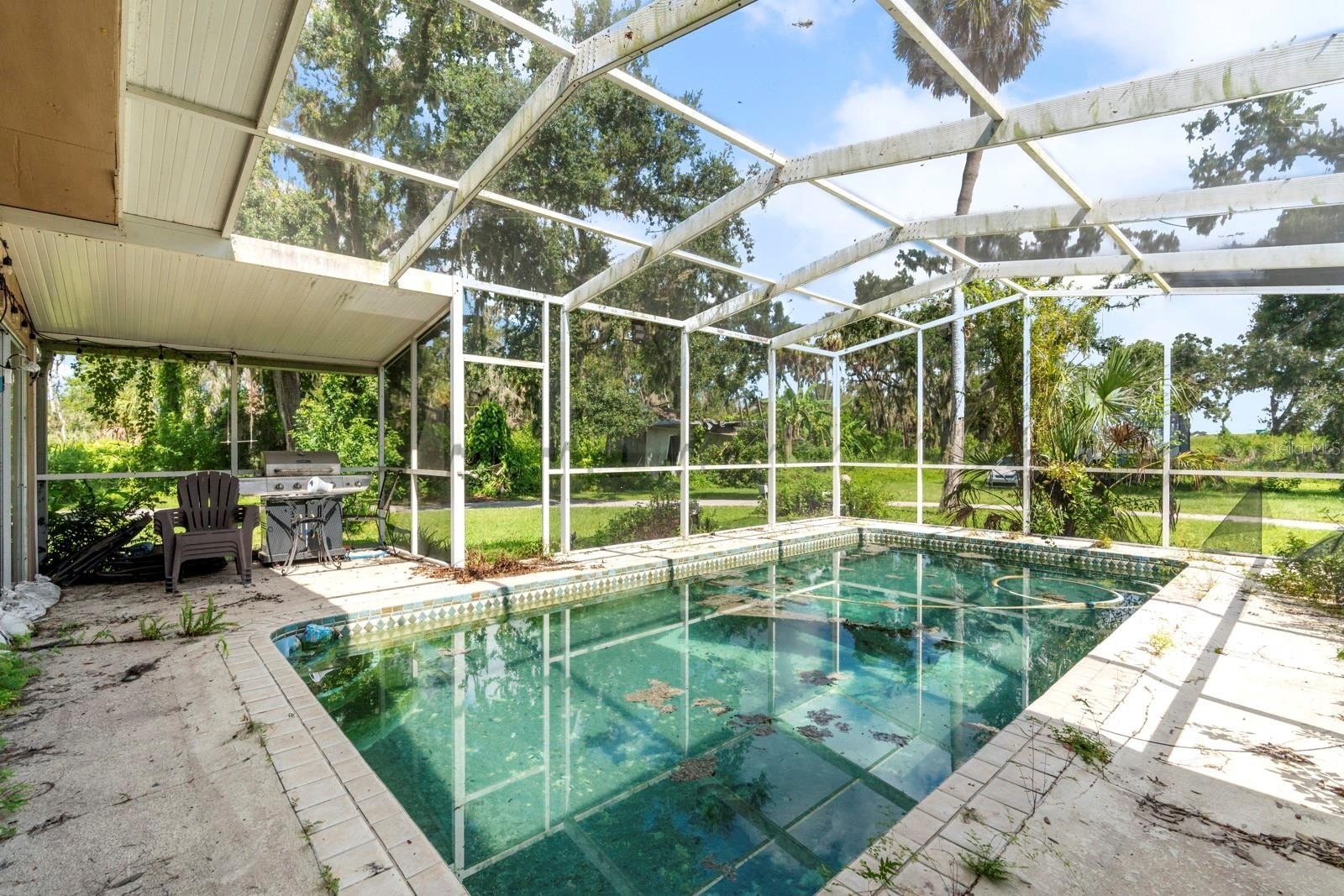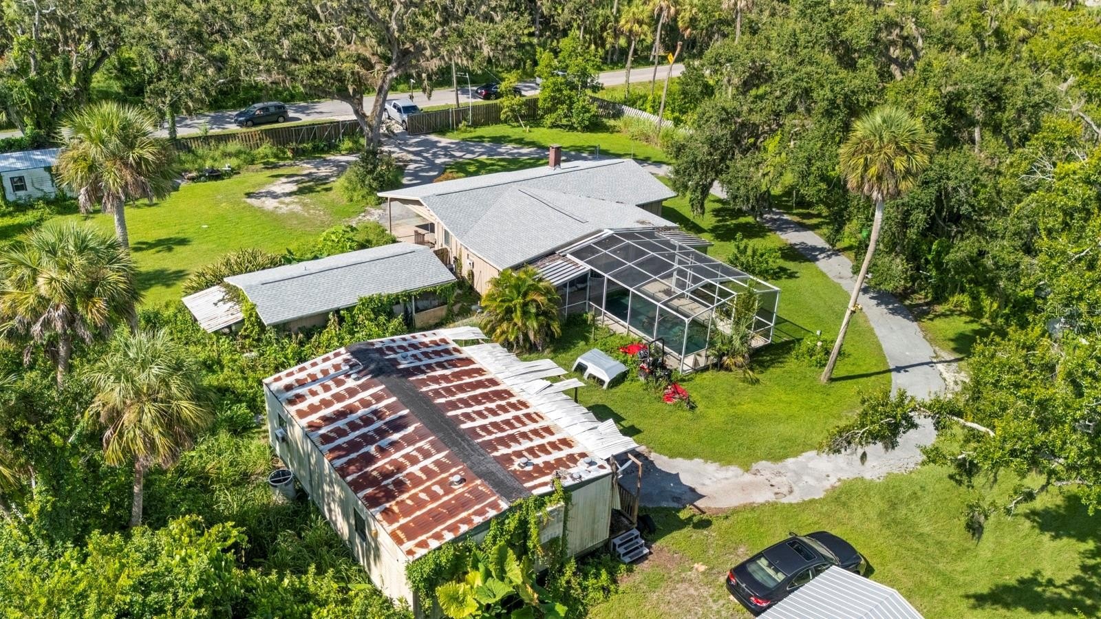 This charming 3-bedroom, 2-bath pool home offers both space and versatility, along with a studio guest house and two stand-alone buildings. The main home features an enclosed lanai transformed into a spacious family/Florida room overlooking the screened pool, plus an additional bedroom and bath. Major updates include a roof replaced in 2022, a 2-year-old A/C system, a new septic system in 2024, and a water pump replaced in 2025. With some TLC, this property could truly shine!