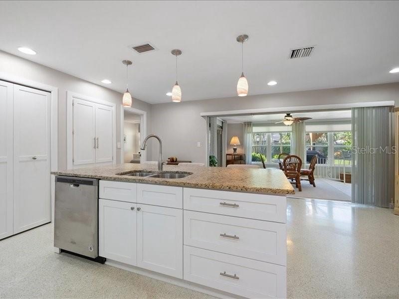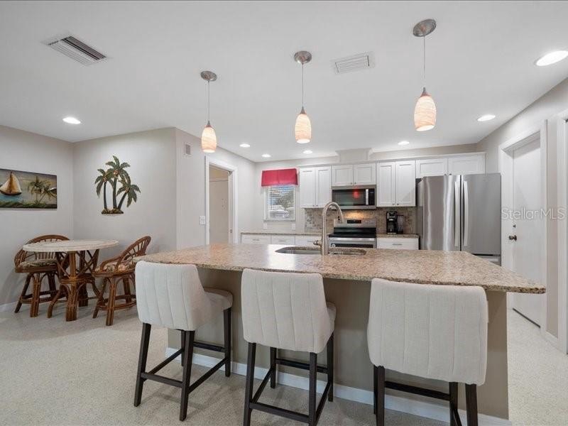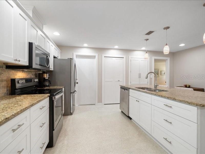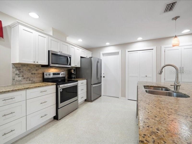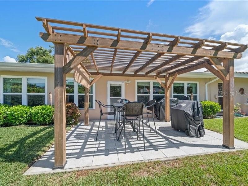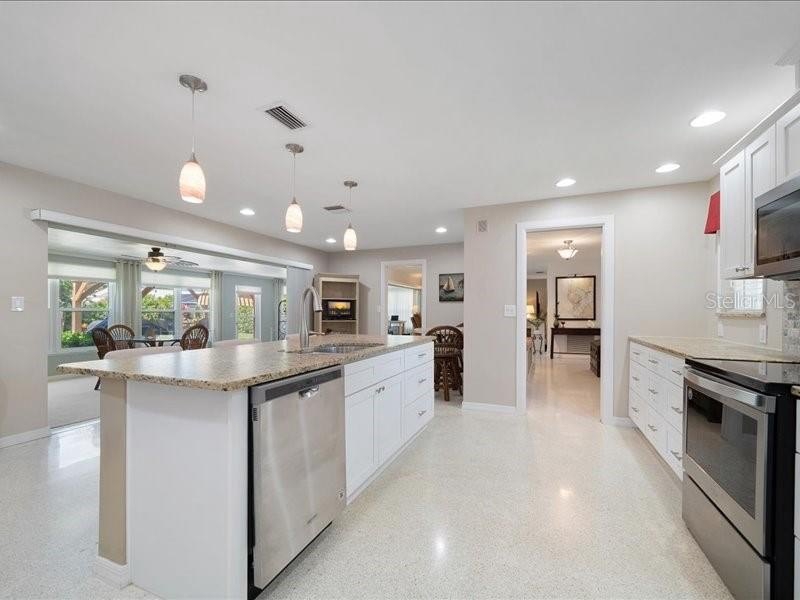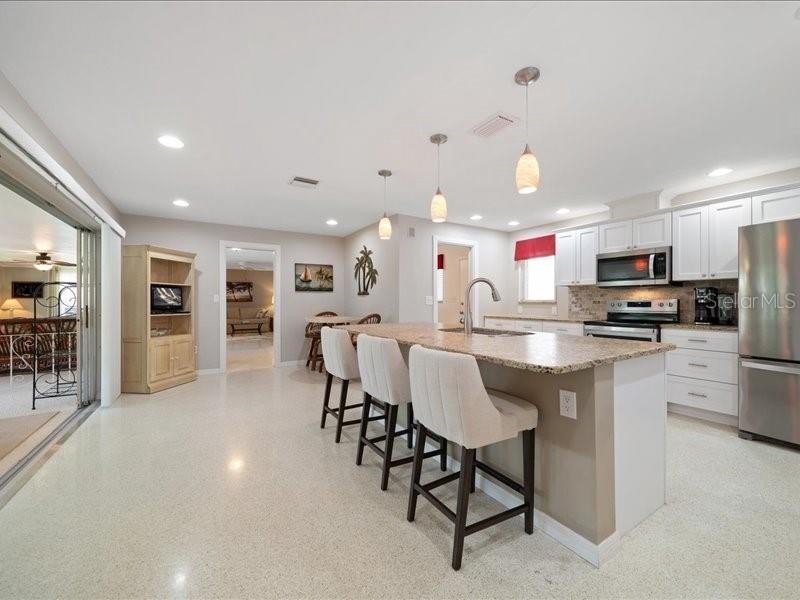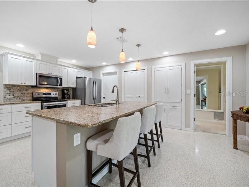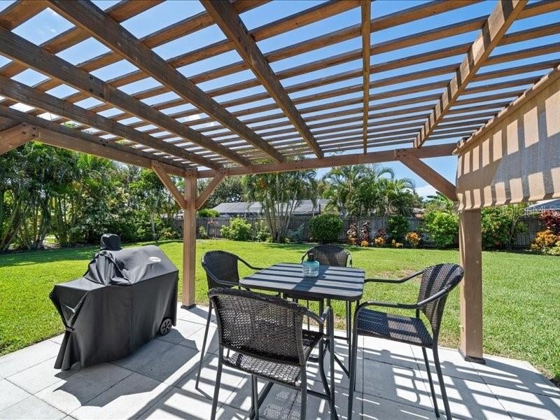 Inside, the home has been thoughtfully updated with contemporary finishes, a bright and airy feel, and plenty of space for both family and guests. With three comfortable large bedrooms and two stylish bathrooms. All bedrooms have shades and stylish curtains. Primary room offers a large walk in closet and an updated en suite bathroom. A second walk in closet in the hallway. White Soft close kitchen cabinets and drawers with 2 wall pantries. All stainless steel appliances. Leather textured granite countertops and island with a breakfast bar. Indoor, large Laundry room with a sink that was added by current owner. A beautiful pergola welcomes you to the backyard and provides shade. Beautiful light and bright terrazzo floors in all common areas. Two car garage, new hurricane enforced garage door with garage opener. Epoxy garage flooring, tons of storage cabinets and work areas. The home electrical and AC duct work have been also updated and a whole house air filtration system is installed. New roofs, AC, hot water heater, windows. All updates are from 2020 or newer. Over 100k in updates makes this the ideal home to just move in and start enjoying from day one.