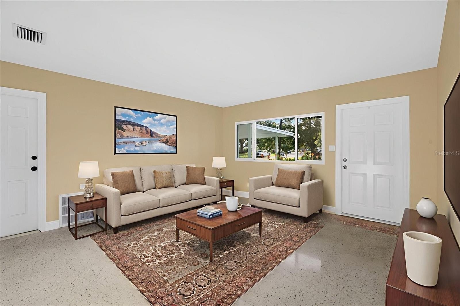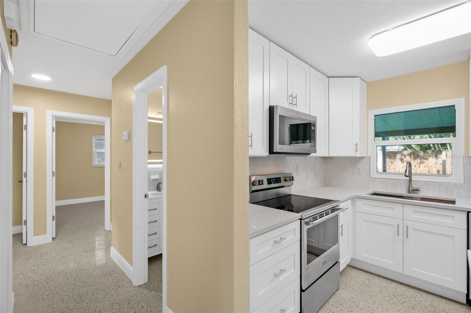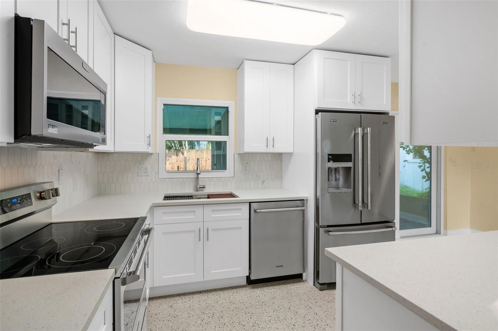 The home features a customized kitchen with brand-new stainless steel appliances and quartz countertops, hurricane-impact windows and slider, and restored terrazzo flooring accented by elegant 5-inch baseboards. Fresh paint, new doors throughout, all-new ductwork, and a brand-new driveway add to the appeal, giving the home a fresh, like-new feel.