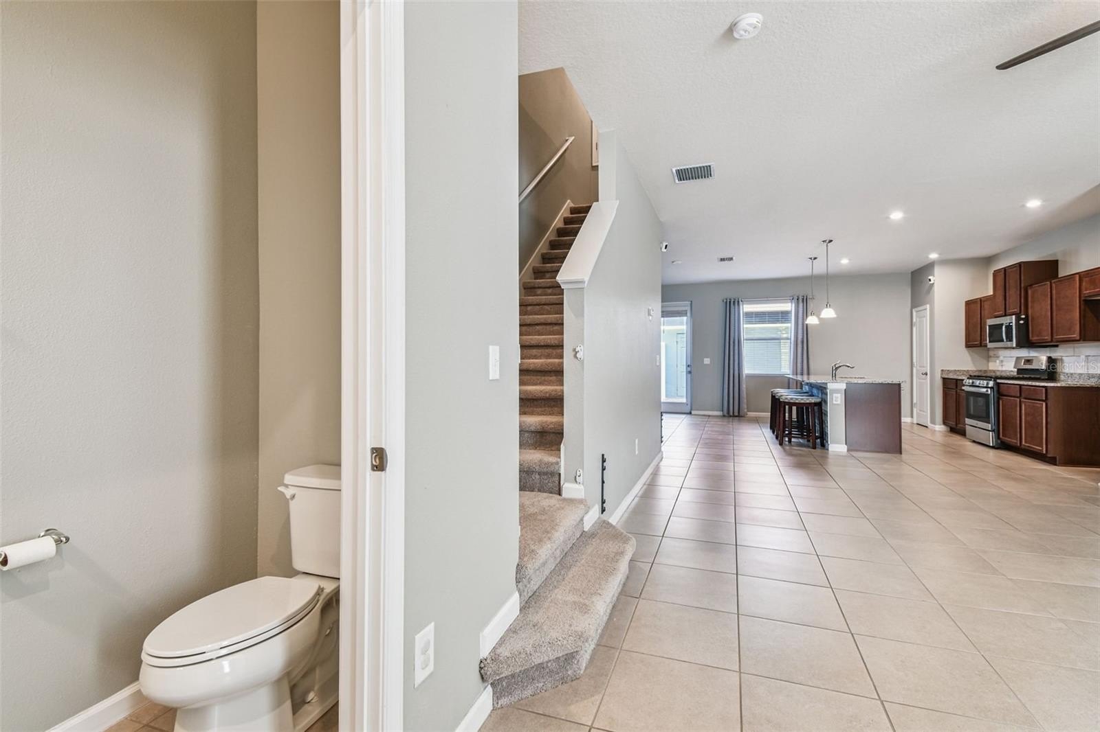 Step inside to discover an open-concept main floor designed for modern living. The spacious living and dining areas flow seamlessly together, creating an ideal space for entertaining or relaxing with family. A conveniently located half bath adds functionality, while the heart of the home—the stunning chef’s kitchen—boasts stainless steel appliances, a gas stove, 42-inch upper cabinets, granite countertops, a stylish farmhouse-style backsplash, and a large island with a weathered wood front that brings rustic charm and practicality.