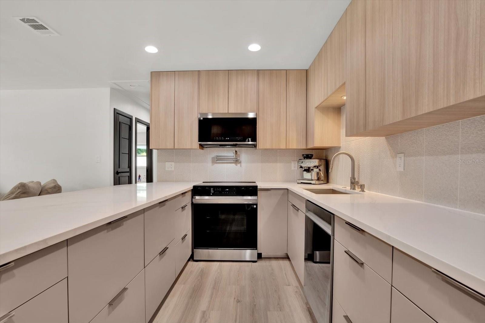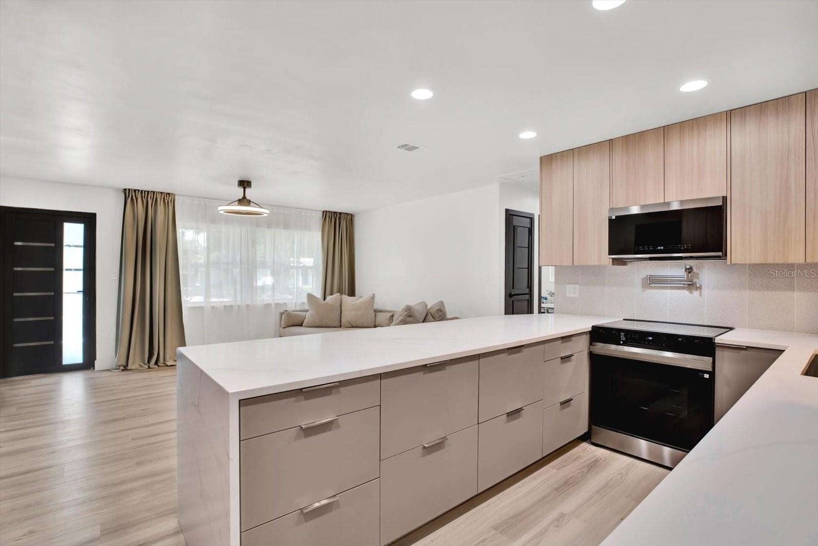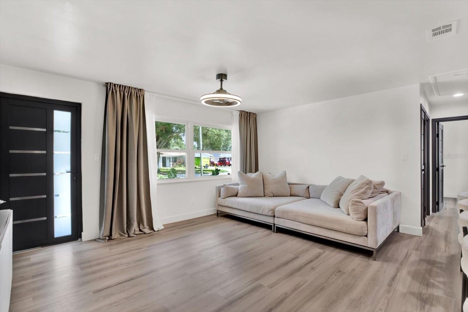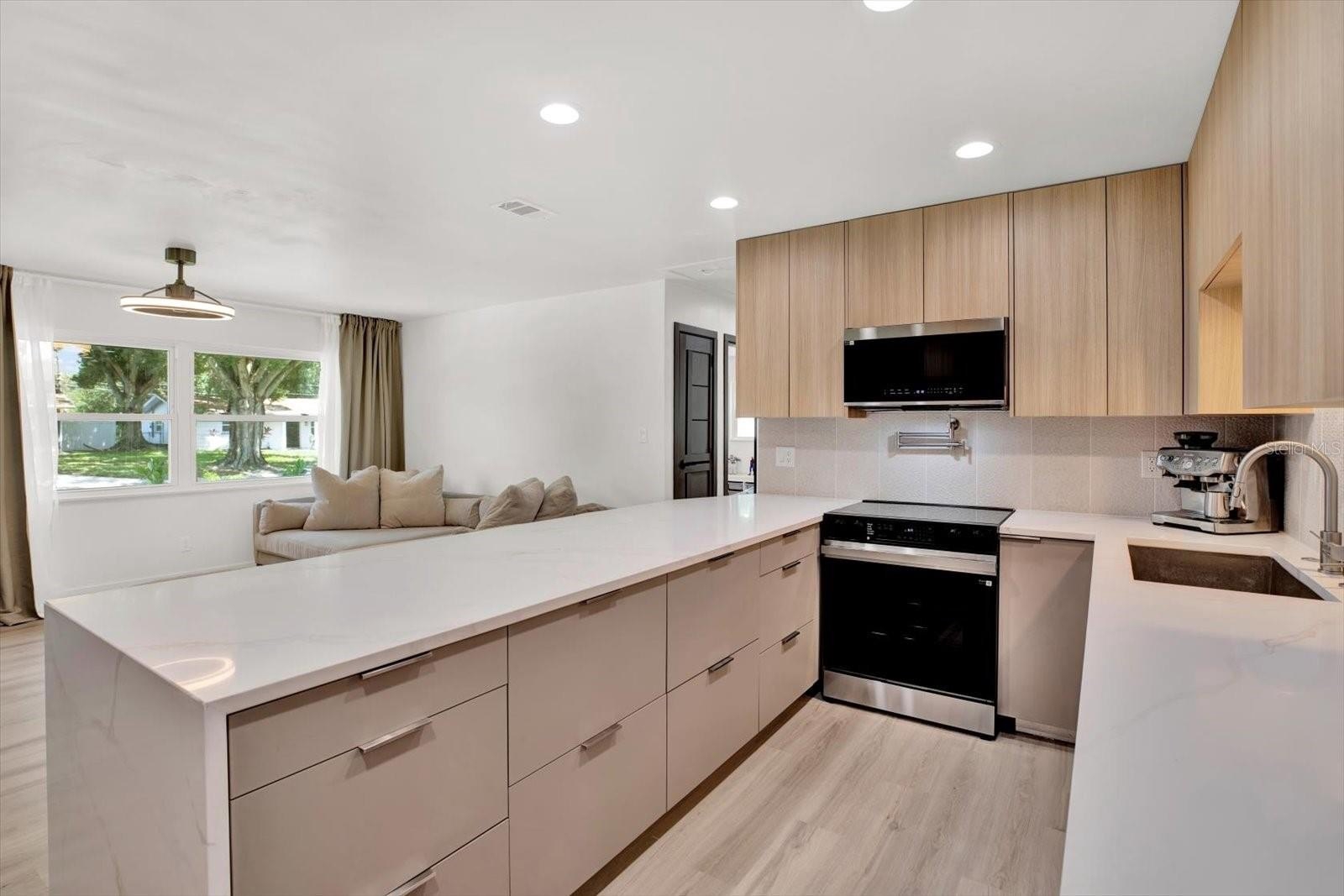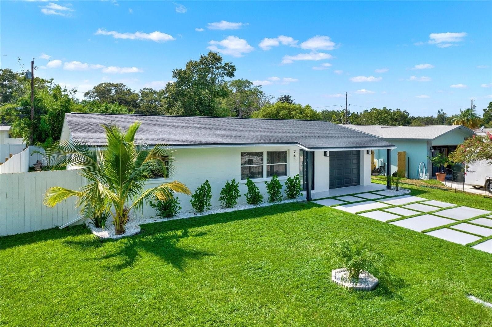 Welcome to your completely renovated 3-bedroom, 2-bathroom home with a 1-car garage, situated in a prime Largo neighborhood with NO HOA and located in a NON-FLOOD zone. This property has been meticulously upgraded with a focus on modern design and high-end finishes. The gourmet kitchen is a chef's dream, featuring European-style soft-close cabinets, Samsung Bespoke appliances, a stunning quartz waterfall countertop, and a stylish tile backsplash. Indulge in spa-like experiences in the luxurious bathrooms, boasting granite vanities, LED mirrors, custom tiled showers with frameless glass doors, and European-style dual flush toilets. Throughout the home, you'll find luxurious laminate flooring and smooth, modern walls, achieved by removing popcorn ceilings and professionally leveling and painting the surfaces. This home is smart home-ready, equipped with an EV charger in the garage, a Nest thermostat, and a fingerprint lock on the exterior side door for added security and convenience. Step outside to discover your outdoor oasis, transformed with new landscaping including palm trees, and a freshly painted exterior using Benjamin Moore paint. Enjoy the convenience of an extended driveway, artificial grass accents, and a new wooden fence for privacy. Experience peace of mind with a new roof flapper, updated electrical with GFCI outlets, new plumbing, and efficient LED lighting throughout. Perfectly positioned just a quick drive from beaches, parks, local shops, and dining, this home offers easy, low-maintenance Florida living in a great location. Words hardly express the extent of this home's transformation. To truly appreciate its beauty and comfort, a visit is essential! Don't miss the chance to own this exceptional property!