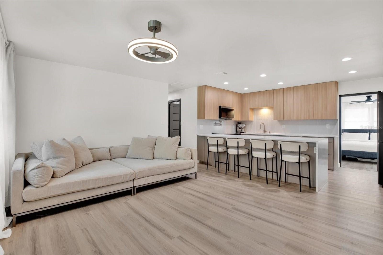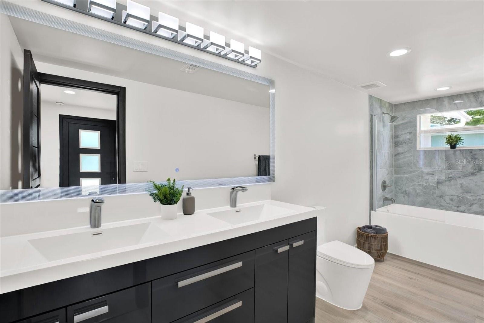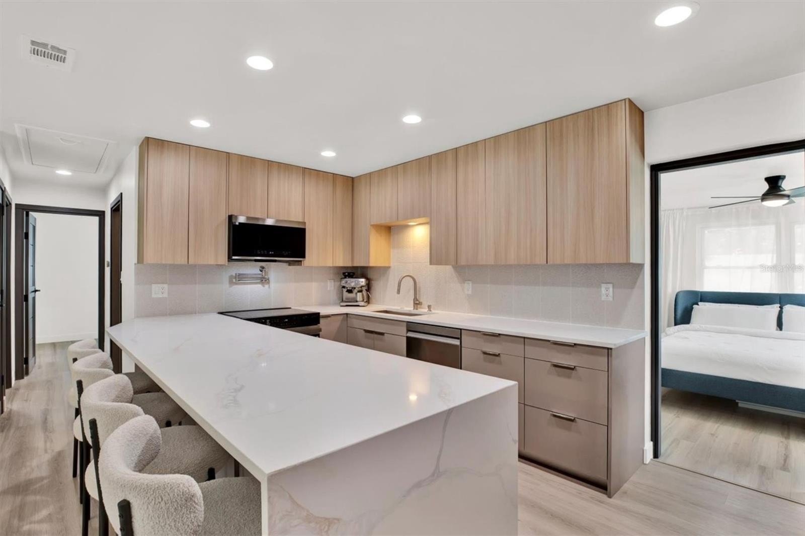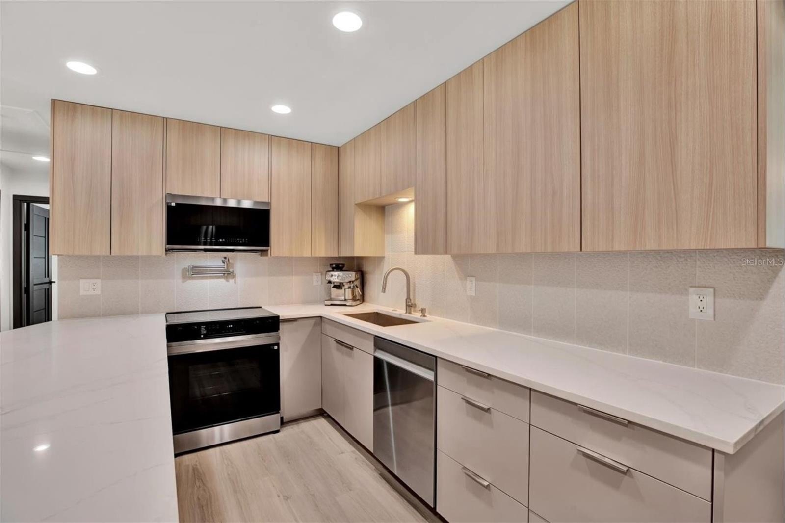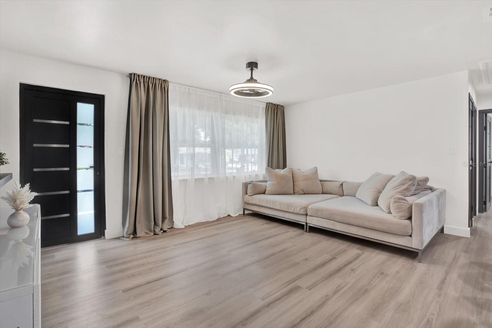 Welcome to your completely renovated 3-bedroom, 2-bathroom home with a 1-car garage, situated in a prime Largo neighborhood with NO HOA and located in a NON-FLOOD zone. This property has been meticulously upgraded with a focus on modern design and high-end finishes. The gourmet kitchen is a chef's dream, featuring European-style soft-close cabinets, Samsung Bespoke appliances, a stunning quartz waterfall countertop, and a stylish tile backsplash. Indulge in spa-like experiences in the luxurious bathrooms, boasting granite vanities, LED mirrors, custom tiled showers with frameless glass doors, and European-style dual flush toilets. Throughout the home, you'll find luxurious laminate flooring and smooth, modern walls, achieved by removing popcorn ceilings and professionally leveling and painting the surfaces. This home is smart home-ready, equipped with an EV charger in the garage, a Nest thermostat, and a fingerprint lock on the exterior side door for added security and convenience. Step outside to discover your outdoor oasis, transformed with new landscaping including palm trees, and a freshly painted exterior using Benjamin Moore paint. Enjoy the convenience of an extended driveway, artificial grass accents, and a new wooden fence for privacy. Experience peace of mind with a new roof flapper, updated electrical with GFCI outlets, new plumbing, and efficient LED lighting throughout. Perfectly positioned just a quick drive from beaches, parks, local shops, and dining, this home offers easy, low-maintenance Florida living in a great location. Words hardly express the extent of this home's transformation. To truly appreciate its beauty and comfort, a visit is essential! Don't miss the chance to own this exceptional property!