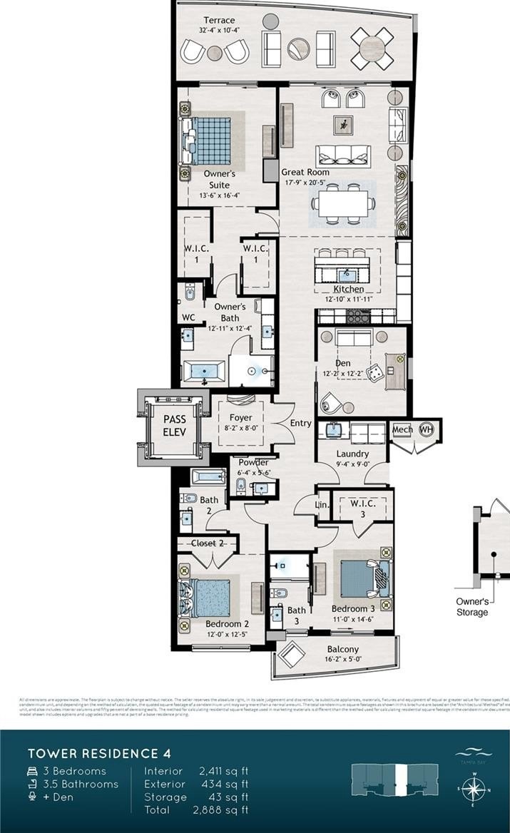 One or more photo(s) has been virtually staged. Under Construction. Introducing AQUA at Westshore Yacht Club on the grounds of the exclusive gated waterfront community in South Tampa. Residence #904 a 3 bedroom, 3.5 bath plus a den with 2,411 Sq. Ft and an additional East facing terrace accessed from the 3rd bedroom. Westshore Yacht Club’s newest residential tower: standing 17 floors, offering 77 luxurious condominium residences with sweeping sunset views and sunrise city views. Secure fob private elevator that opens into your private entry foyer. Interiors boast the finest finishes such as Italkraft premium cabinetry, quartz waterfall countertops, large format porcelain tile, Sub-Zero and Wolf appliances with induction stove top. Wide-open sun filled living and dining rooms with floor to ceiling windows and sliders accessing the West facing terrace, offering amazing sunset and Bay views. Generously sized Owner’s Suite enjoys 2 walk-in closets, spa-inspired Owner’s bath with large walk-in-shower and freestanding soaking tub, private lavatory enclosure, 2 separate vanity locations with premium fixtures. Amenity rich, the building features a rooftop sky pool with bay views and private cabanas, with breathtaking views of Old Tampa Bay, plus a 3rd floor pool with spa, outdoor grilling station and lounge area. Spacious and elegantly appointed club room with conversational seating areas, sports lounge and billiard area and private dining room. State of the art golf simulator, theater with plush seating, private offices, children’s playroom and 2 fully furnished guest suites. Bay Front fitness center on the 17th floor with yoga and spin room. Climate controlled storage for each residence on the same level. Residents and guests will be welcomed by valet attendant under the covered porte-cochere entrance leading to the residential lobby, with signature ceremonial staircase that leads to the second floor lounge library. 24/7 staffed lobby, on site property manager and service personnel ensure an effortless lifestyle. Westshore Yacht Club is South Tampa’s premier unique Gated waterfront community, boasting the exclusive members-only Bay Club and Marina, 149 boat slips, two resort style swimming pools, outside Tiki Bar, and indoor fine dining, 806 Sunset bar, Day Spa, fitness center, community, and dog parks. All this and only 30 minutes to the beaches, 15 minutes to downtown Tampa and St. Petersburg, as well as Tampa and St. Pete Airports, and all the restaurants & shopping Tampa Bay has to offer.
