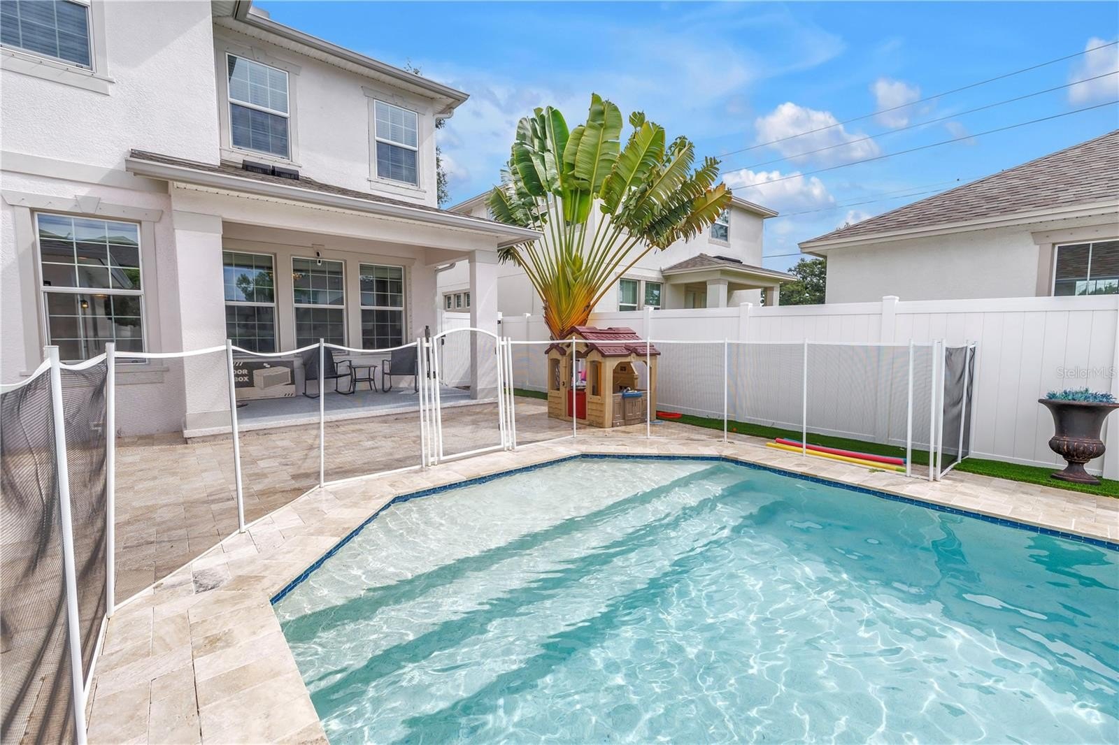 Venture upstairs to find three well-sized bedrooms, providing ample space for family and guests, along with a versatile bonus living area ideal for play, relaxation, or even a cozy home theater. Need a quiet workspace? Look no further than the private office located on the first floor, perfect for remote work or creative endeavors. Step outside to your own personal oasis! The beautifully designed outdoor area features a sparkling saltwater pool surrounded by beautiful pavers, making it the perfect retreat for sunny Florida days. The covered patio is an excellent spot for lounging and entertaining, equipped with a built-in outdoor grill for delightful alfresco dining all year round. Enjoy privacy with a tasteful white vinyl fence enclosing the yard. Additional highlights include a large pantry off the kitchen, a two-car detached garage, and an irrigation system keeping your outdoor space lush and inviting. Located in a non-flood zone, this property stands out in St. Petersburg for its unique setting—surrounded by other newer constructed homes, it offers a sense of community and modern living that can be hard to find.