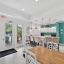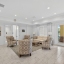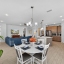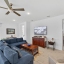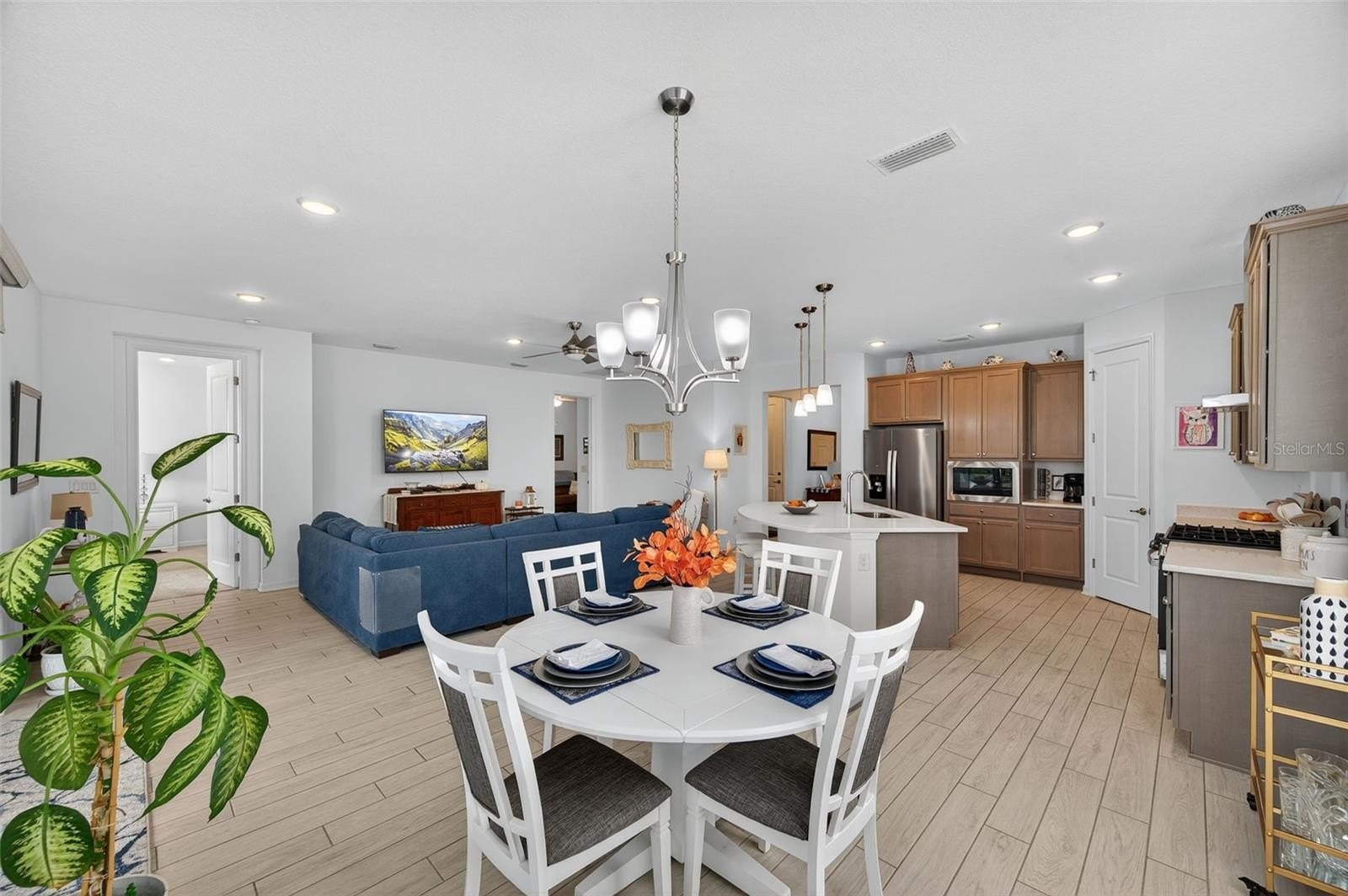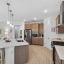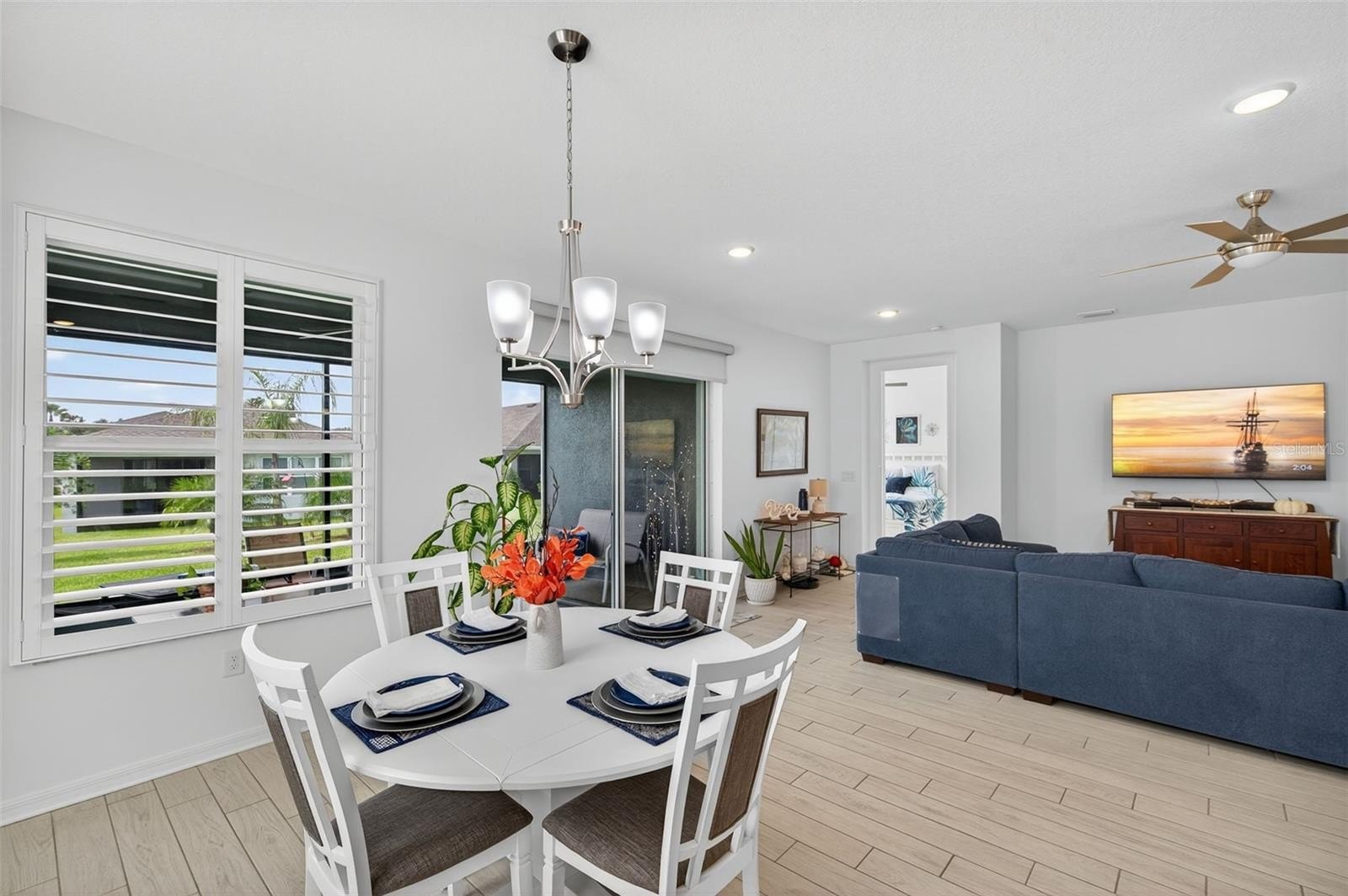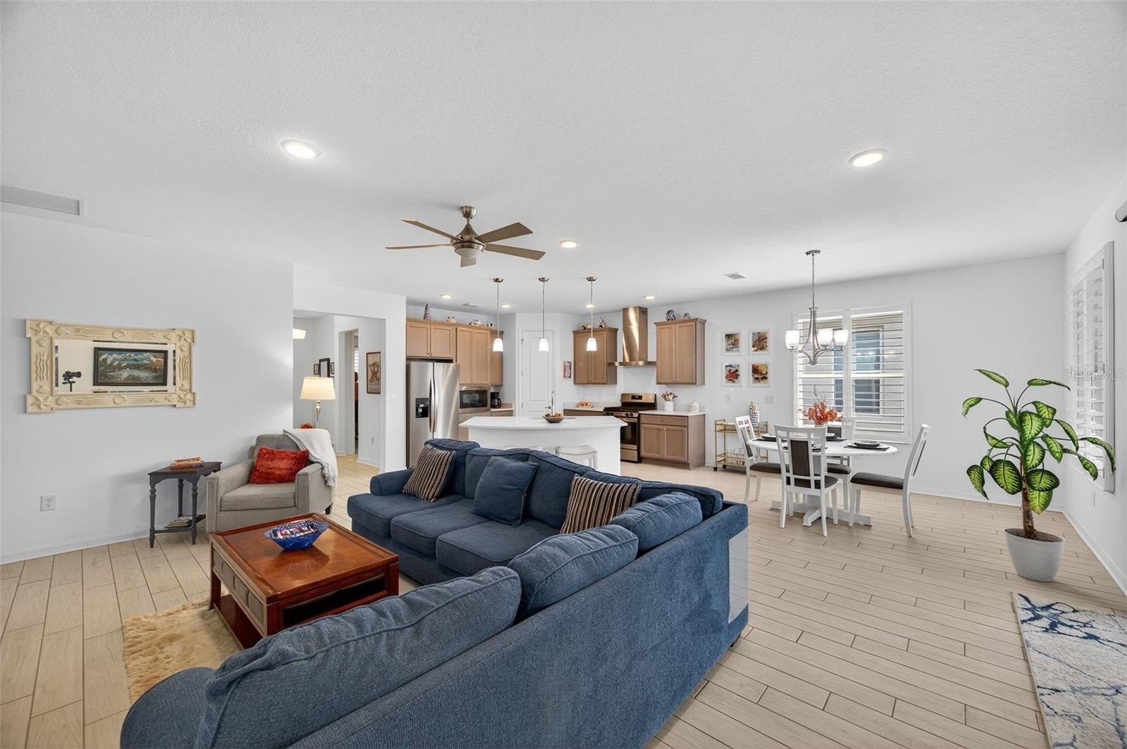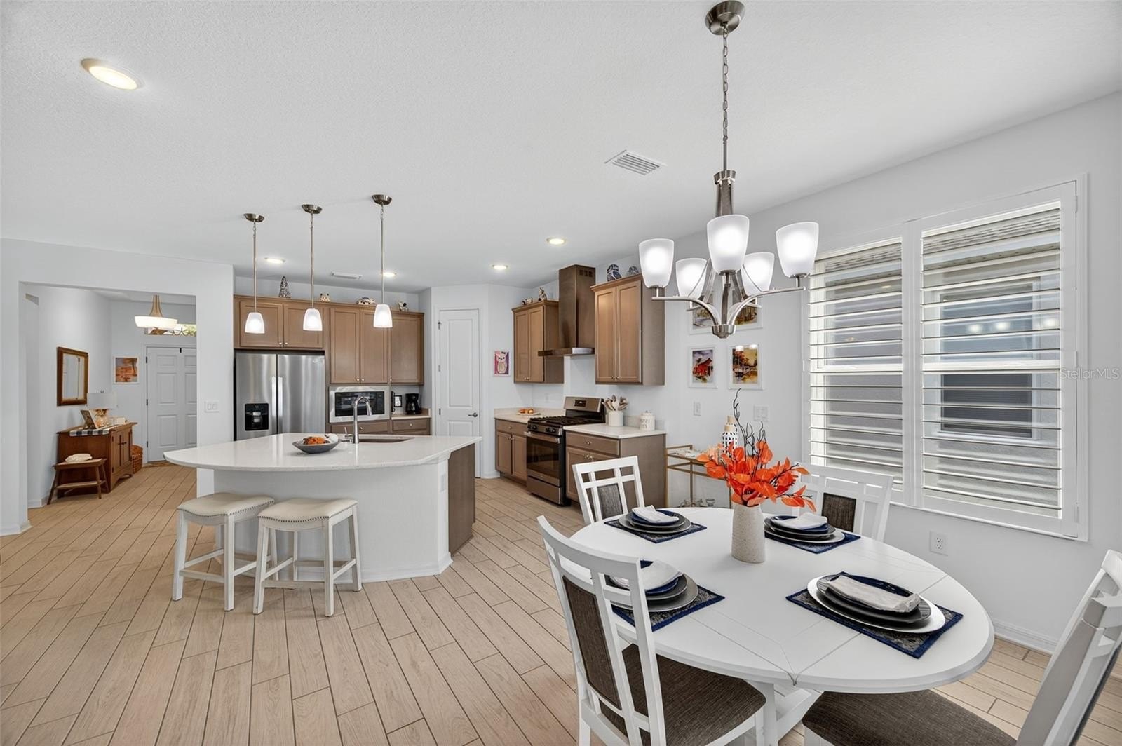 Inside, soaring ceilings and tall doors immediately create a sense of spaciousness. The open-concept design blends the kitchen, dining, and great room into a bright, inviting space. The kitchen is both stylish and practical, with stainless steel appliances, quartz countertops, a gas stove, and a generous island for meals, prep, or conversation. Plantation shutters frame the windows, adding a timeless touch to every room.