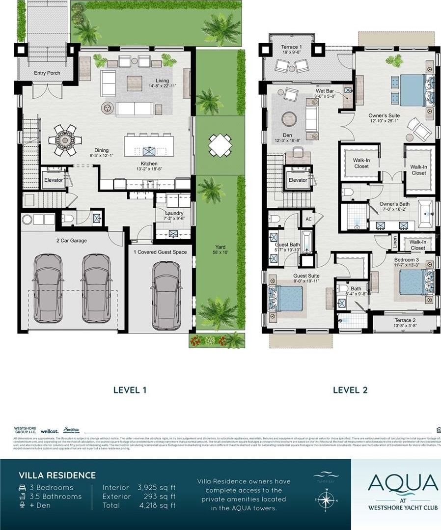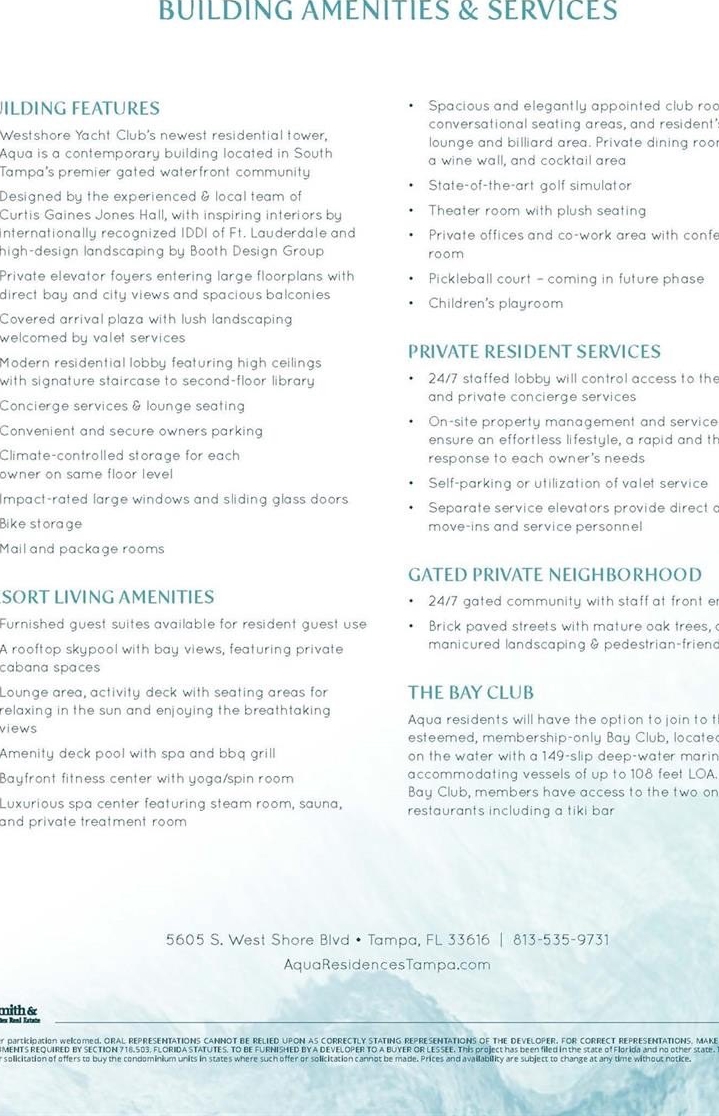 The Villas offer a one-of-a-kind experience with access to Amenity-rich AQUA Condo towers: a rooftop sky-pool with breathtaking Sunset views to the west and sunrises to the East over downtown Tampa; A 3rd floor pool with hot tub; outdoor grilling station with Cabanas; A spacious and elegantly appointed club room with conversational seating areas, sports lounge, billiard area and private dining room; State-of-the art golf simulator; theater with plush seating; children’s playroom; and 2 fully furnished guest suites, as well as private offices. Relax in the luxurious spa center featuring steam room, sauna and private treatment rooms. The17th floor fitness center overlooks Tampa Bay, with yoga /spin room. Valet attendant under the porte-cochere lobby entrance. 24/7 staffed lobby, on site property manager and service personnel.