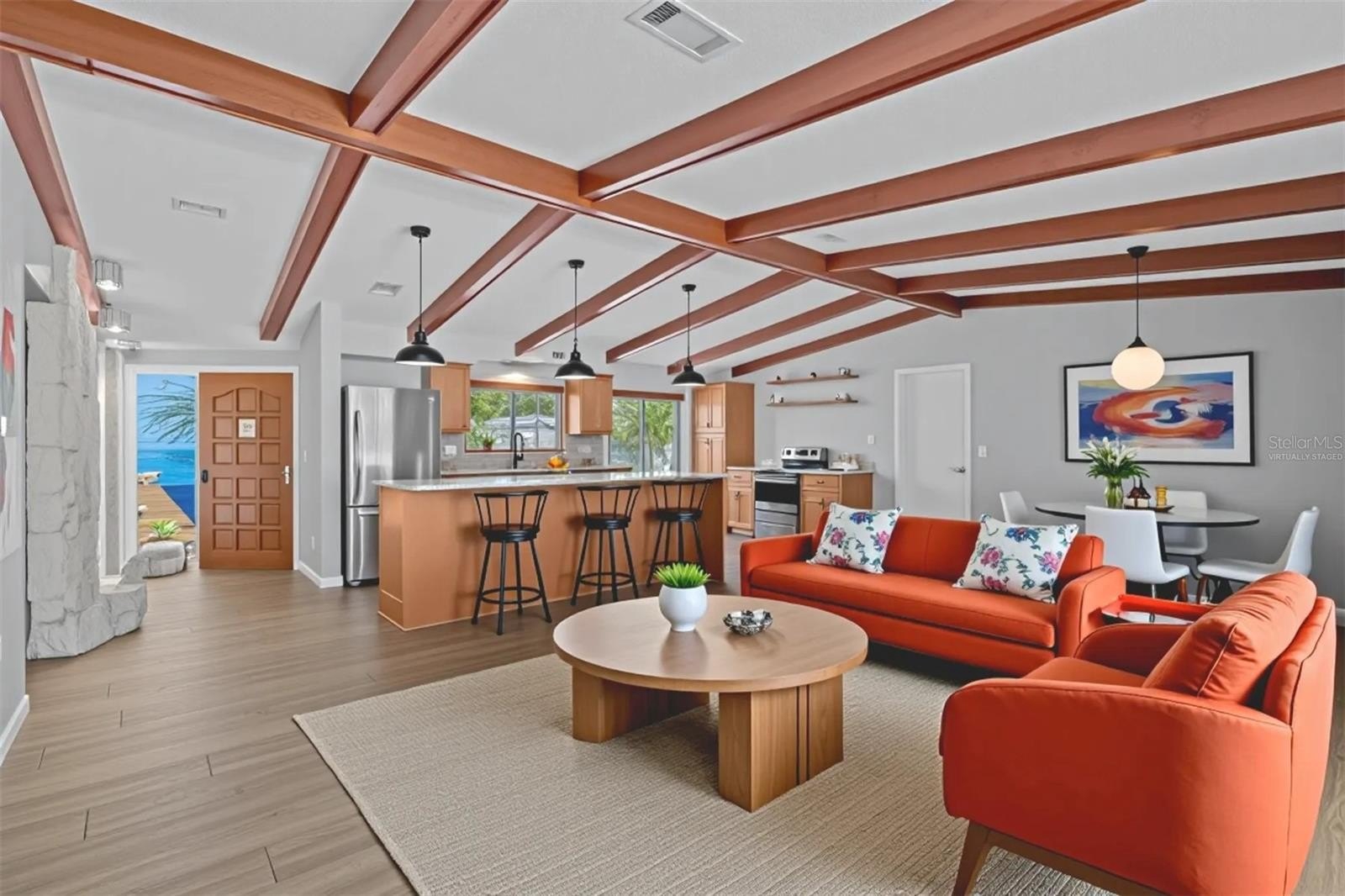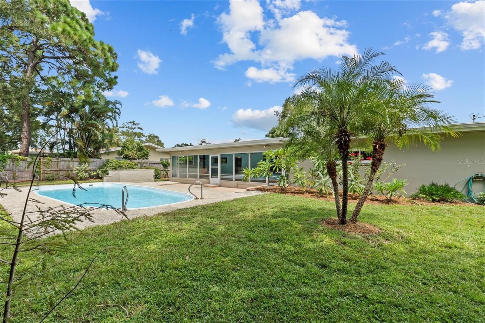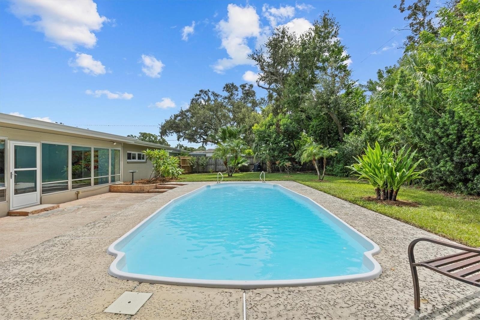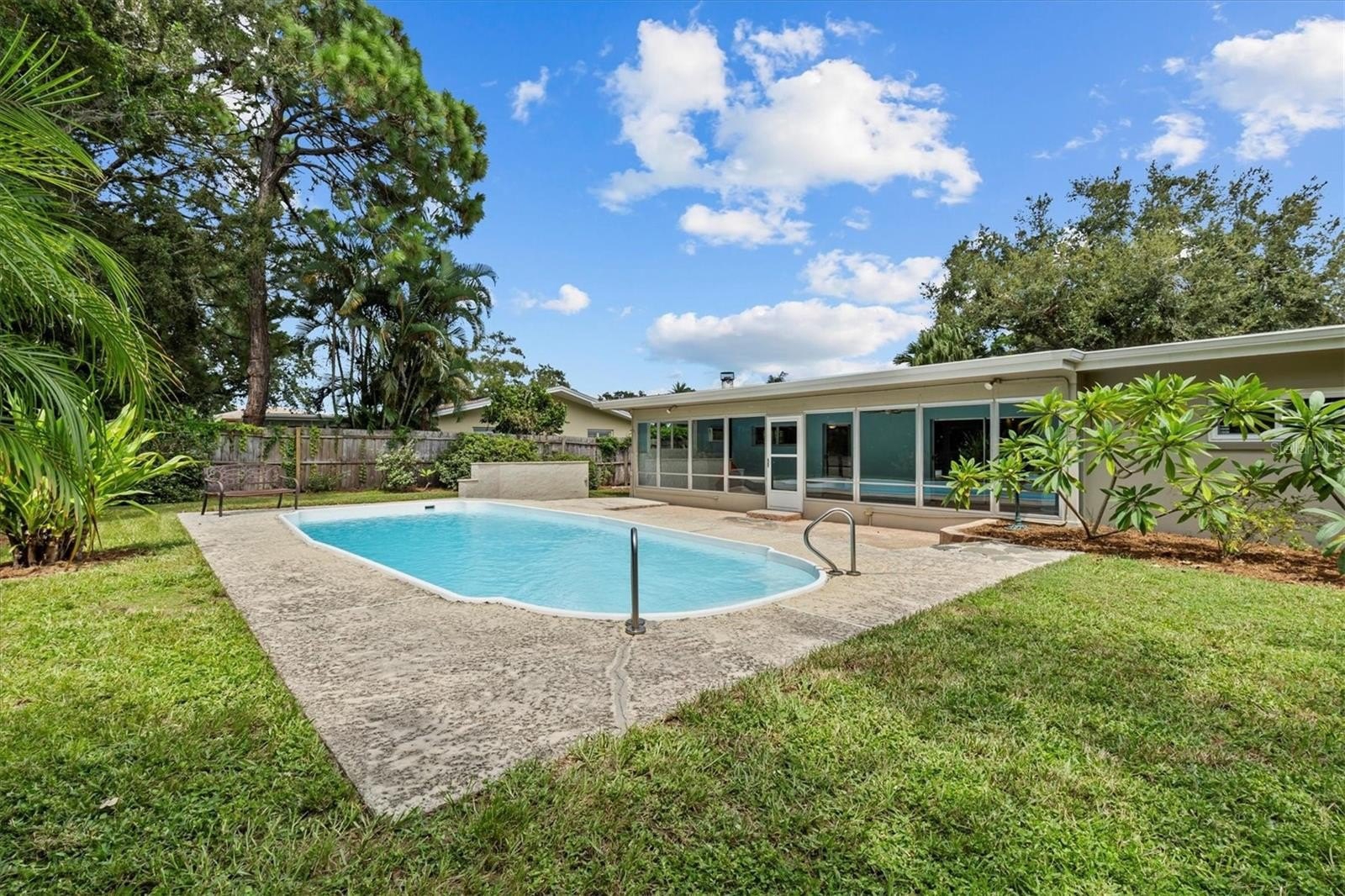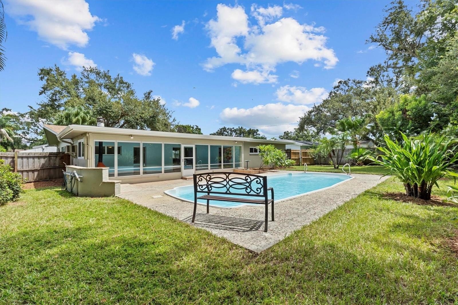 You don’t need to live in downtown Dunedin to enjoy the ultimate walkable lifestyle. Nestled in Fairway Estates, this residence is just steps from the Pinellas Trail, an 18-hole championship golf course and clubhouse, and the region’s premier visual arts and education center. Nearby, a community center with library, fitness studio & classes, Olympic size pool, tennis and pickleball courts, and picturesque parks ensure endless opportunities for recreation, festivals, and nature exploration—all without ever getting in your car. The optional HOA offers the freedom of no deed restrictions, along with an active calendar of family friendly gatherings. Peace of mind comes with a newer roof and HVAC system, hurricane-rated windows and doors, and X flood zone status that helps keep insurance affordable. Inside, you’ll find an open-concept great room and chef’s kitchen designed for entertaining, with soaring vaulted ceilings, dramatic exposed beams, and luxury plank flooring. European-style wood cabinetry, sleek stainless appliances, oversized island with entertainment bar, and gleaming granite countertops. Host with style in the expansive 35’ x 14’ enclosed lanai, complete with a cozy fireplace and the potential for additional climate-controlled living. The Owner’s Suite is a true retreat with direct lanai access, and a spa-inspired ensuite with updated vanity and mid-century modern sunken tub/shower. Two additional bedrooms share an updated ceramic tile bath, also with a timeless sunken tub/shower. Original mid-century terrazzo floors grace all bedrooms. Step outside to your private backyard oasis with a sparkling in-ground pool. The fully fenced yard provides both privacy and security for kids and pets alike. Homes in Fairway Estates are highly sought-after and rarely available. Don’t miss the chance to claim this exceptional lifestyle—schedule your private tour today.