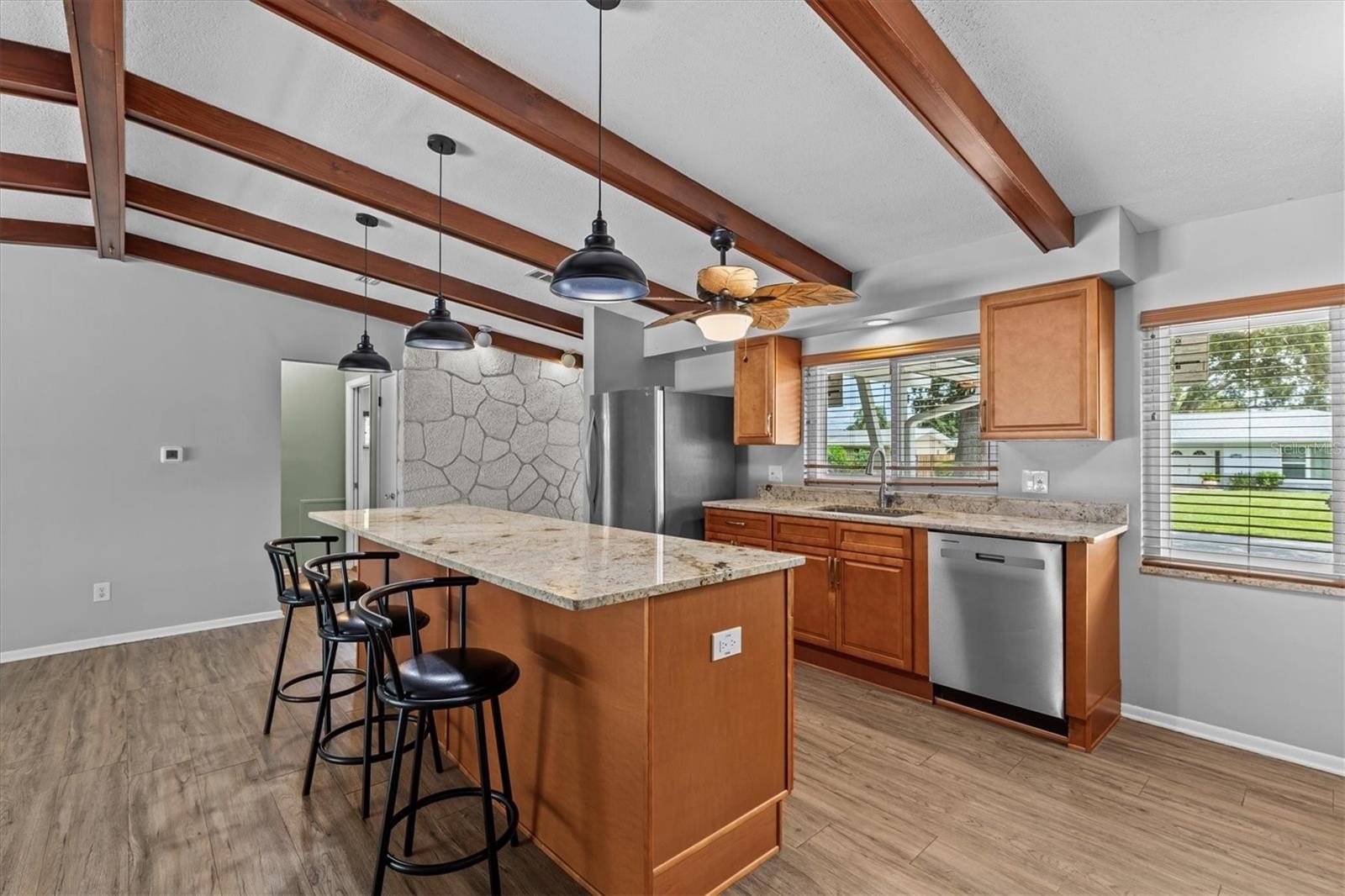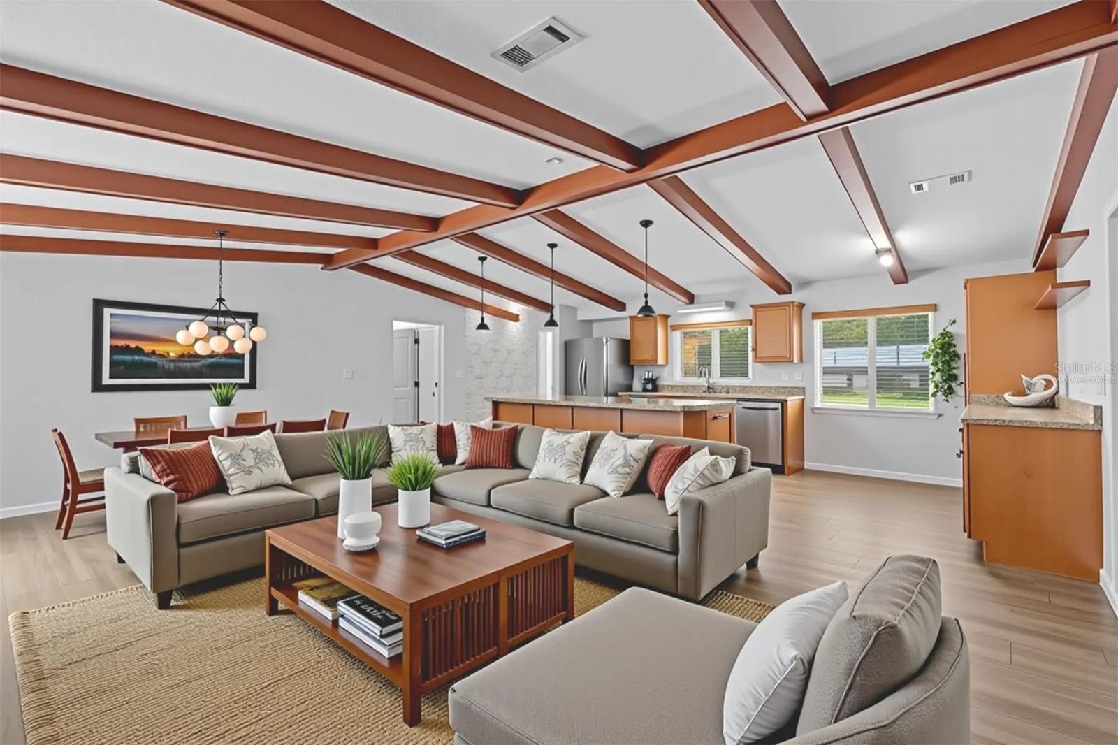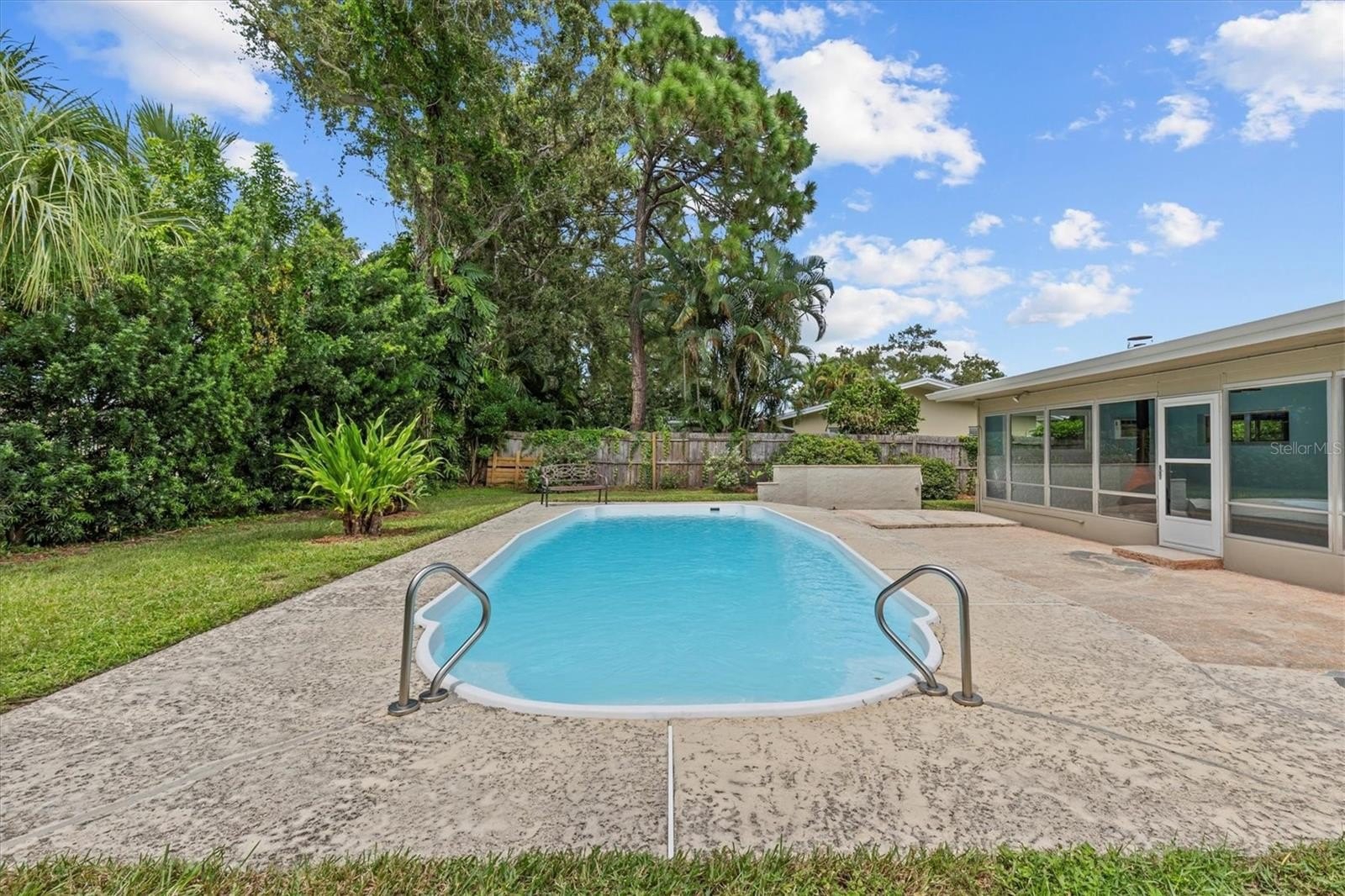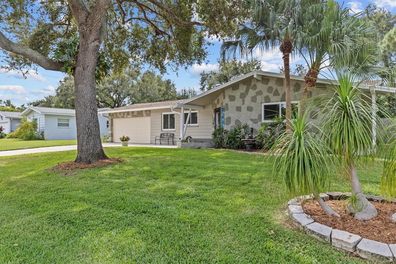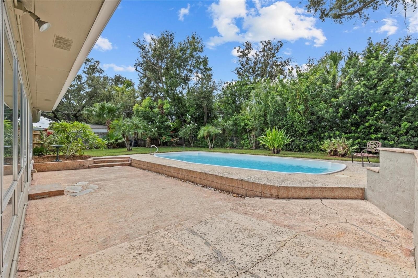 You don’t need to live in downtown Dunedin to enjoy the ultimate walkable lifestyle. Nestled in Fairway Estates, this residence is just steps from the Pinellas Trail, an 18-hole championship golf course and clubhouse, and the region’s premier visual arts and education center. Nearby, a community center with library, fitness studio & classes, Olympic size pool, tennis and pickleball courts, and picturesque parks ensure endless opportunities for recreation, festivals, and nature exploration—all without ever getting in your car. The optional HOA offers the freedom of no deed restrictions, along with an active calendar of family friendly gatherings. Peace of mind comes with a newer roof and HVAC system, hurricane-rated windows and doors, and X flood zone status that helps keep insurance affordable. Inside, you’ll find an open-concept great room and chef’s kitchen designed for entertaining, with soaring vaulted ceilings, dramatic exposed beams, and luxury plank flooring. European-style wood cabinetry, sleek stainless appliances, oversized island with entertainment bar, and gleaming granite countertops. Host with style in the expansive 35’ x 14’ enclosed lanai, complete with a cozy fireplace and the potential for additional climate-controlled living. The Owner’s Suite is a true retreat with direct lanai access, and a spa-inspired ensuite with updated vanity and mid-century modern sunken tub/shower. Two additional bedrooms share an updated ceramic tile bath, also with a timeless sunken tub/shower. Original mid-century terrazzo floors grace all bedrooms. Step outside to your private backyard oasis with a sparkling in-ground pool. The fully fenced yard provides both privacy and security for kids and pets alike. Homes in Fairway Estates are highly sought-after and rarely available. Don’t miss the chance to claim this exceptional lifestyle—schedule your private tour today.