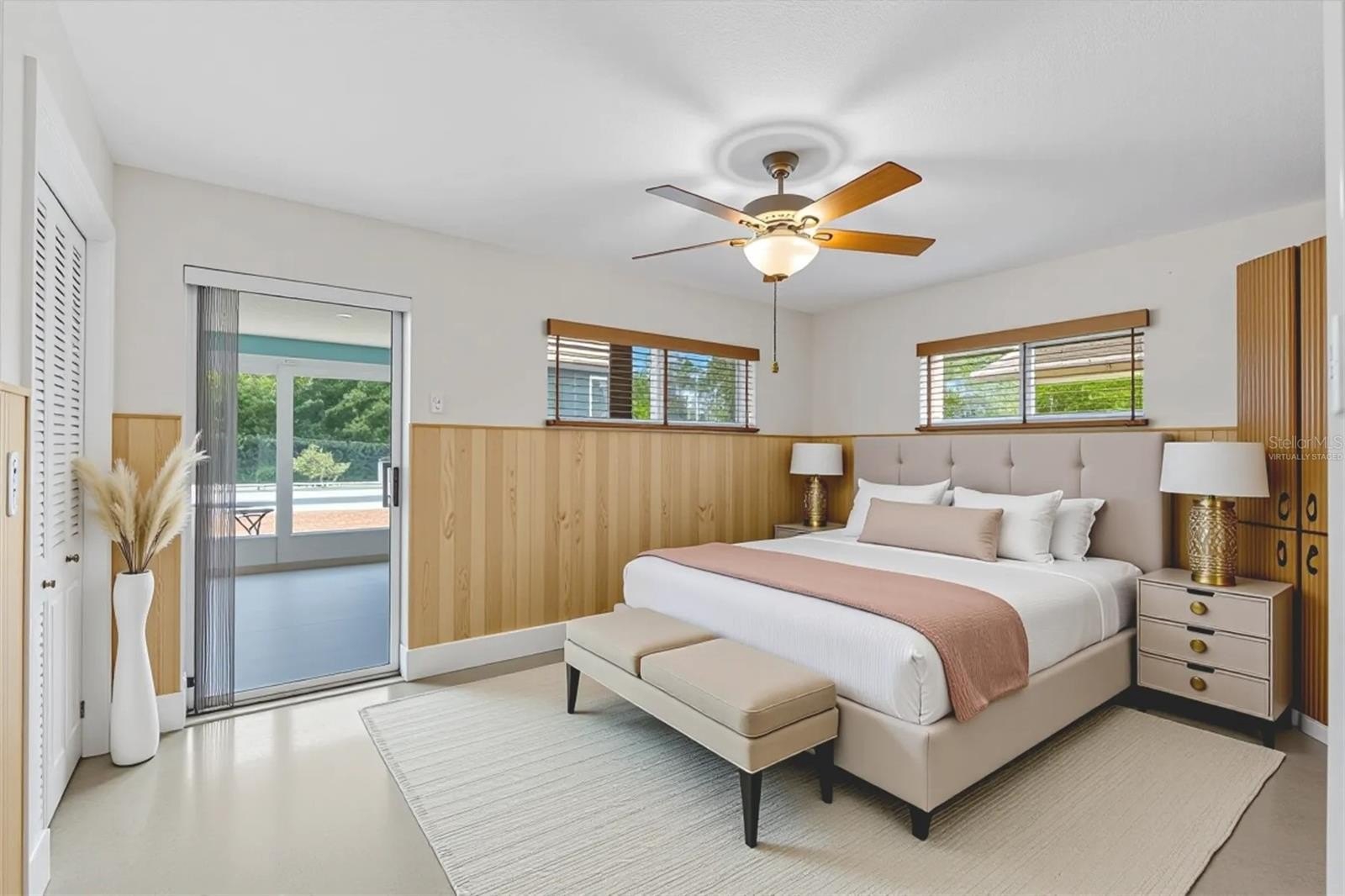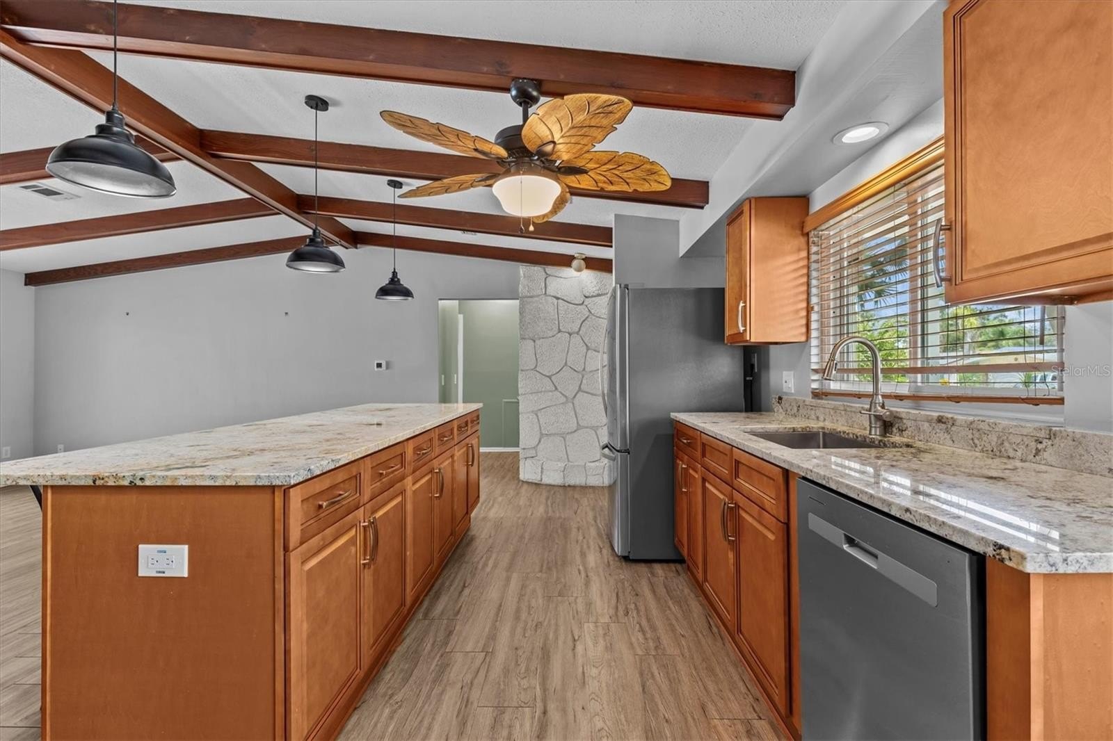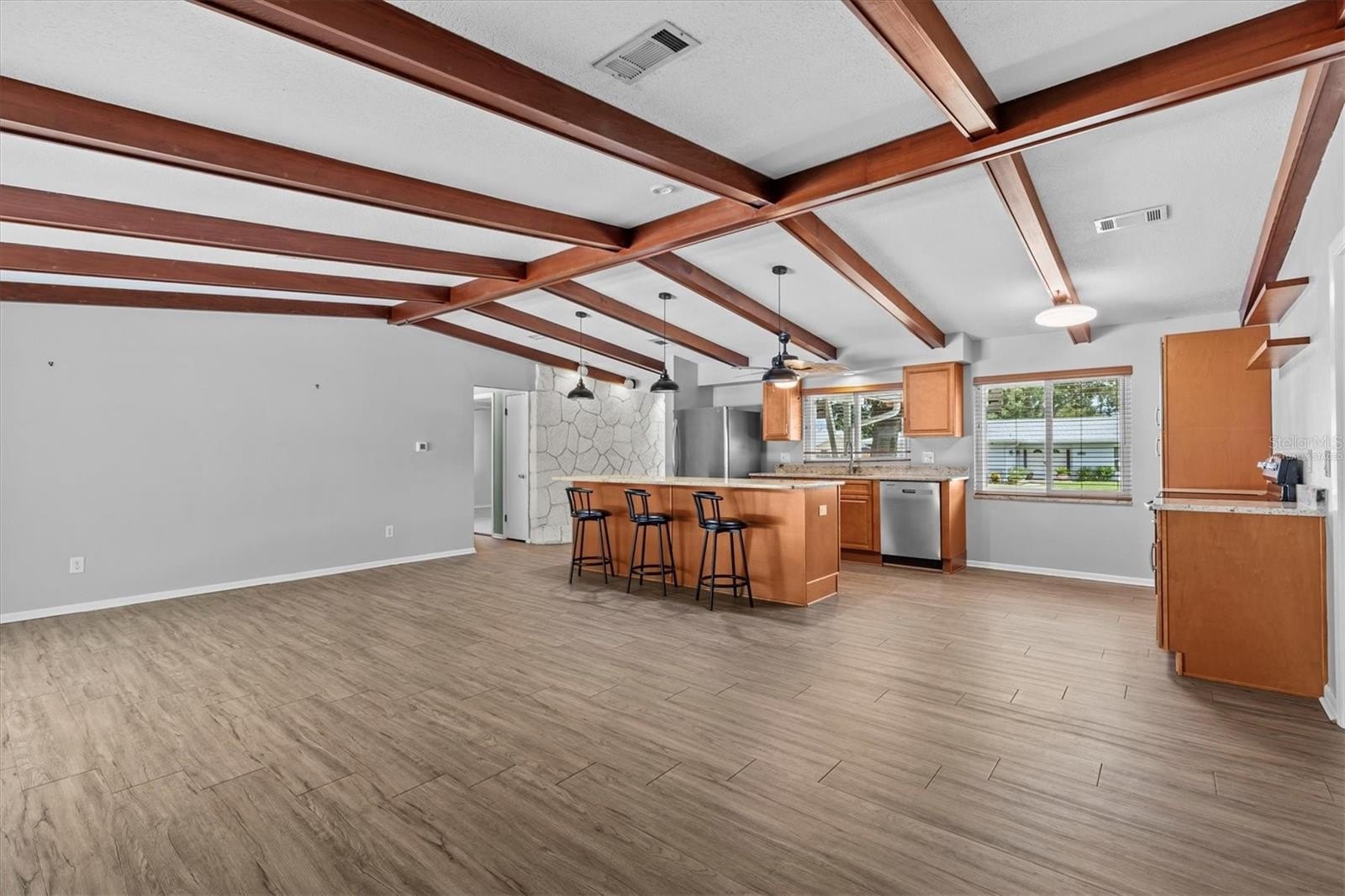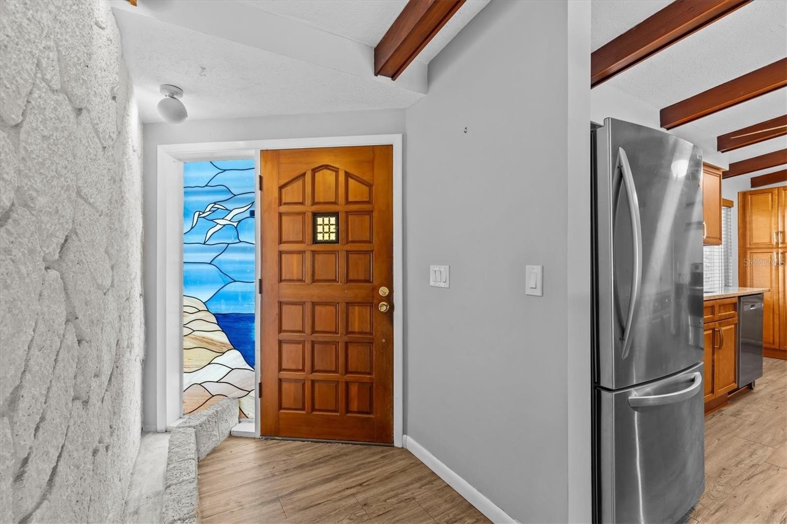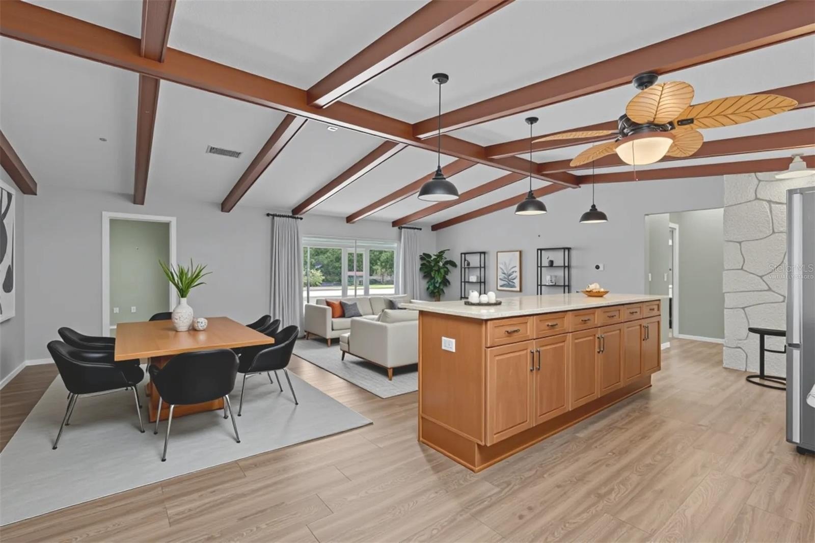 You don’t need to live in downtown Dunedin to enjoy the ultimate walkable lifestyle. Nestled in Fairway Estates, this residence is just steps from the Pinellas Trail, an 18-hole championship golf course and clubhouse, and the region’s premier visual arts and education center. Nearby, a community center with library, fitness studio & classes, Olympic size pool, tennis and pickleball courts, and picturesque parks ensure endless opportunities for recreation, festivals, and nature exploration—all without ever getting in your car. The optional HOA offers the freedom of no deed restrictions, along with an active calendar of family friendly gatherings. Peace of mind comes with a newer roof and HVAC system, hurricane-rated windows and doors, and X flood zone status that helps keep insurance affordable. Inside, you’ll find an open-concept great room and chef’s kitchen designed for entertaining, with soaring vaulted ceilings, dramatic exposed beams, and luxury plank flooring. European-style wood cabinetry, sleek stainless appliances, oversized island with entertainment bar, and gleaming granite countertops. Host with style in the expansive 35’ x 14’ enclosed lanai, complete with a cozy fireplace and the potential for additional climate-controlled living. The Owner’s Suite is a true retreat with direct lanai access, and a spa-inspired ensuite with updated vanity and mid-century modern sunken tub/shower. Two additional bedrooms share an updated ceramic tile bath, also with a timeless sunken tub/shower. Original mid-century terrazzo floors grace all bedrooms. Step outside to your private backyard oasis with a sparkling in-ground pool. The fully fenced yard provides both privacy and security for kids and pets alike. Homes in Fairway Estates are highly sought-after and rarely available. Don’t miss the chance to claim this exceptional lifestyle—schedule your private tour today.