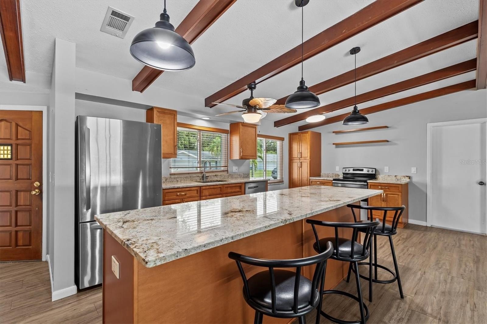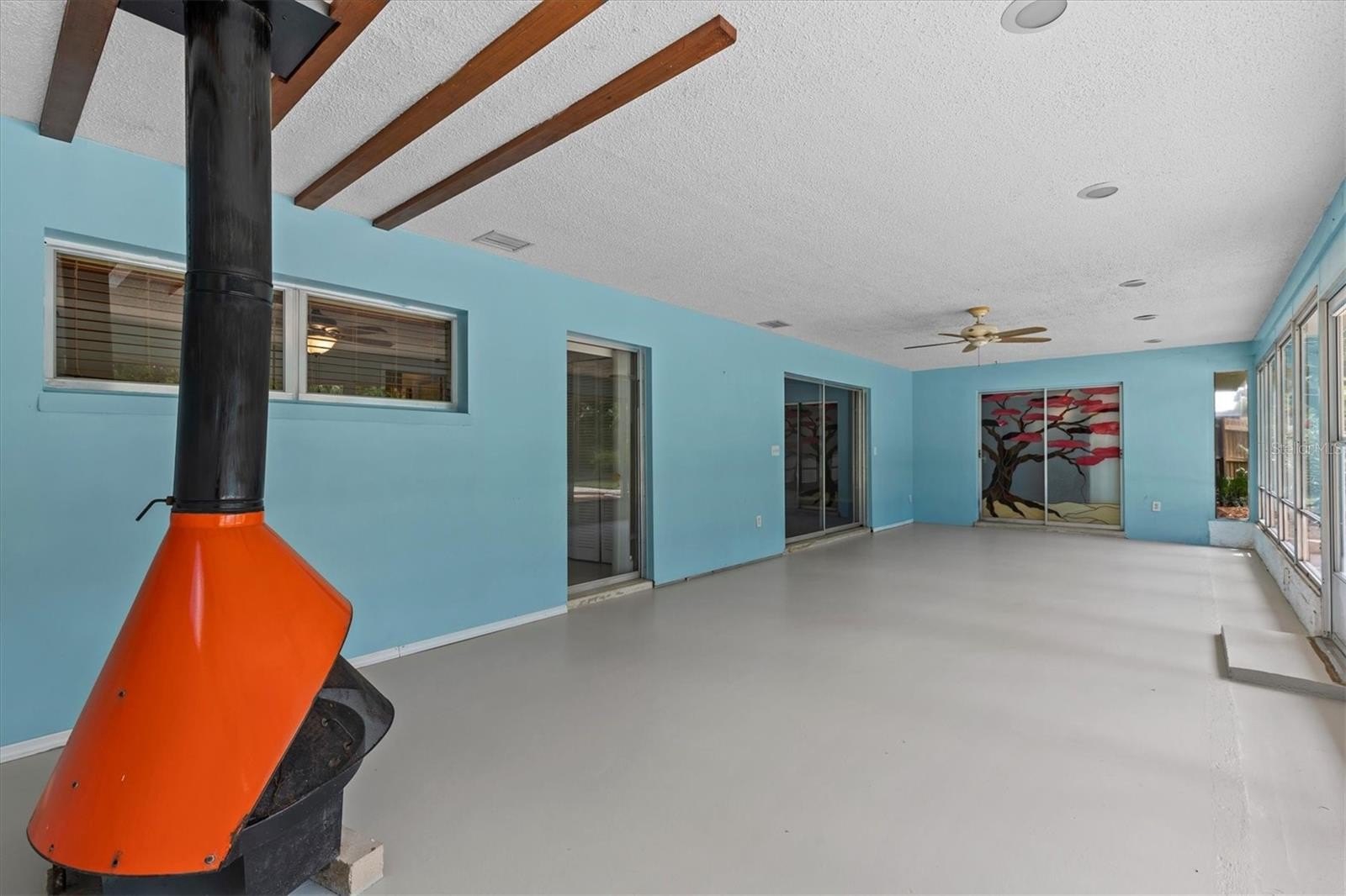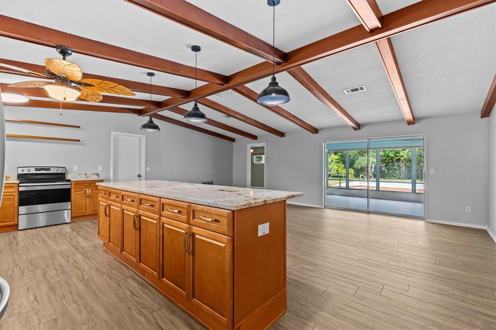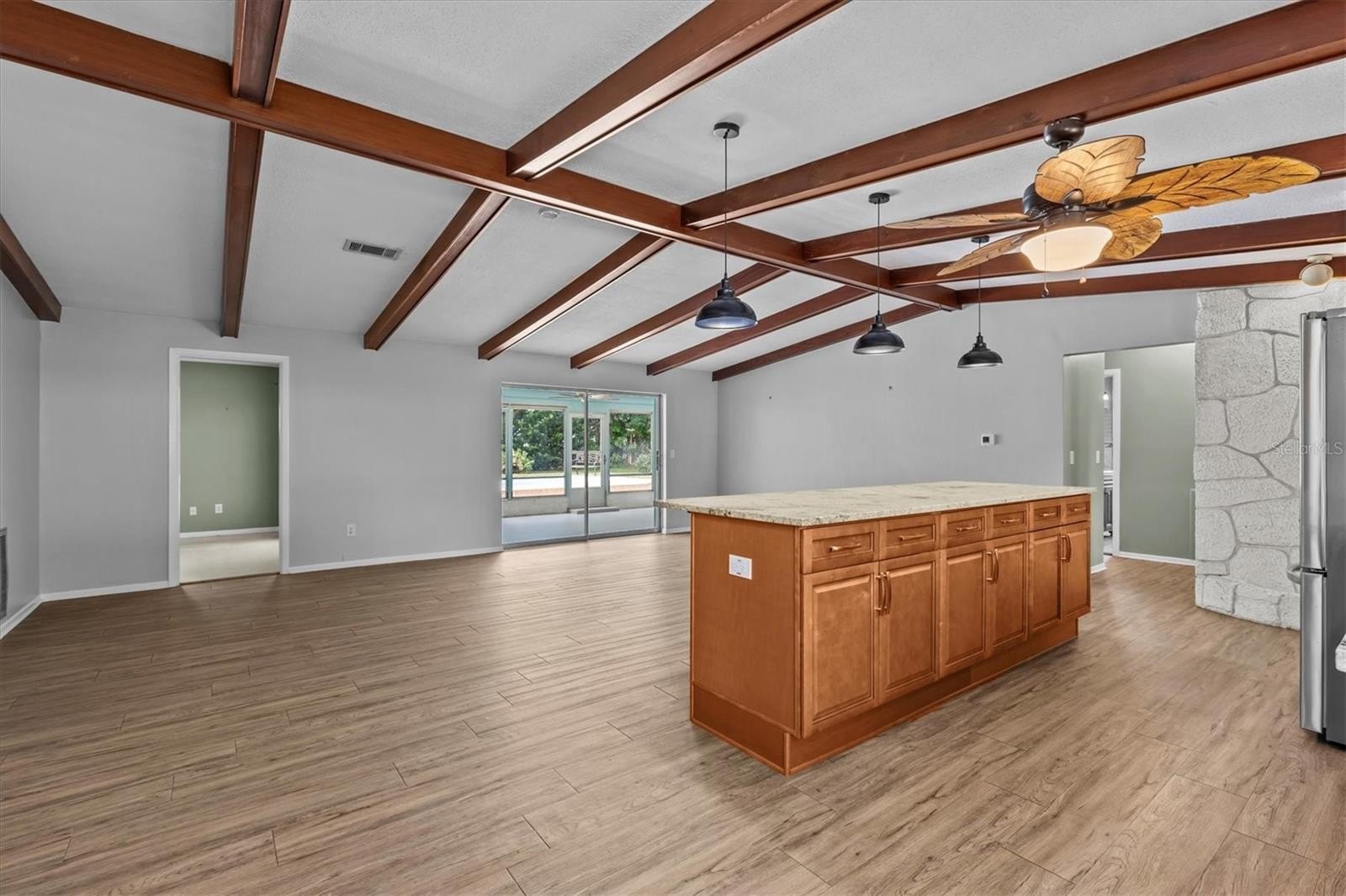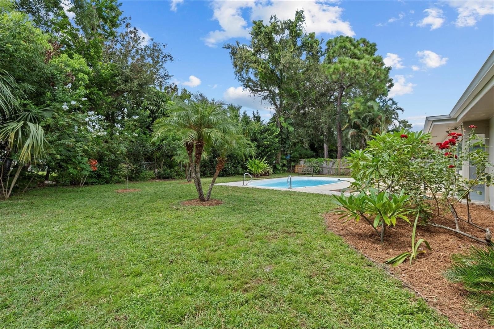 You don’t need to live in downtown Dunedin to enjoy the ultimate walkable lifestyle. Nestled in Fairway Estates, this residence is just steps from the Pinellas Trail, an 18-hole championship golf course and clubhouse, and the region’s premier visual arts and education center. Nearby, a community center with library, fitness studio & classes, Olympic size pool, tennis and pickleball courts, and picturesque parks ensure endless opportunities for recreation, festivals, and nature exploration—all without ever getting in your car. The optional HOA offers the freedom of no deed restrictions, along with an active calendar of family friendly gatherings. Peace of mind comes with a newer roof and HVAC system, hurricane-rated windows and doors, and X flood zone status that helps keep insurance affordable. Inside, you’ll find an open-concept great room and chef’s kitchen designed for entertaining, with soaring vaulted ceilings, dramatic exposed beams, and luxury plank flooring. European-style wood cabinetry, sleek stainless appliances, oversized island with entertainment bar, and gleaming granite countertops. Host with style in the expansive 35’ x 14’ enclosed lanai, complete with a cozy fireplace and the potential for additional climate-controlled living. The Owner’s Suite is a true retreat with direct lanai access, and a spa-inspired ensuite with updated vanity and mid-century modern sunken tub/shower. Two additional bedrooms share an updated ceramic tile bath, also with a timeless sunken tub/shower. Original mid-century terrazzo floors grace all bedrooms. Step outside to your private backyard oasis with a sparkling in-ground pool. The fully fenced yard provides both privacy and security for kids and pets alike. Homes in Fairway Estates are highly sought-after and rarely available. Don’t miss the chance to claim this exceptional lifestyle—schedule your private tour today.