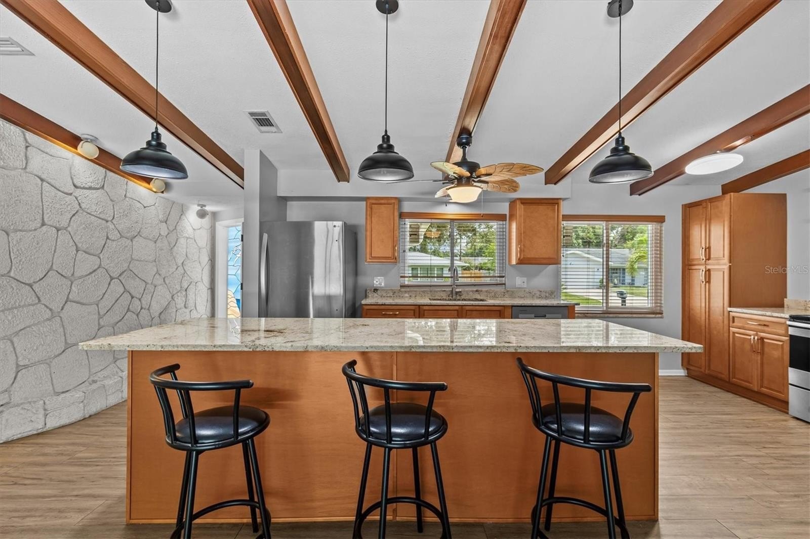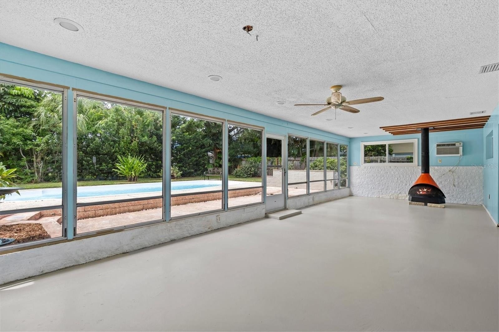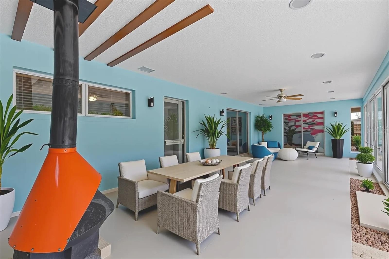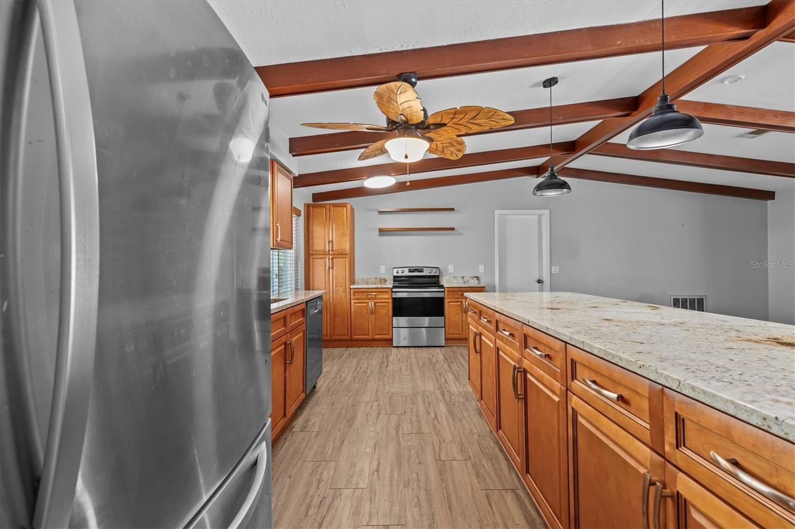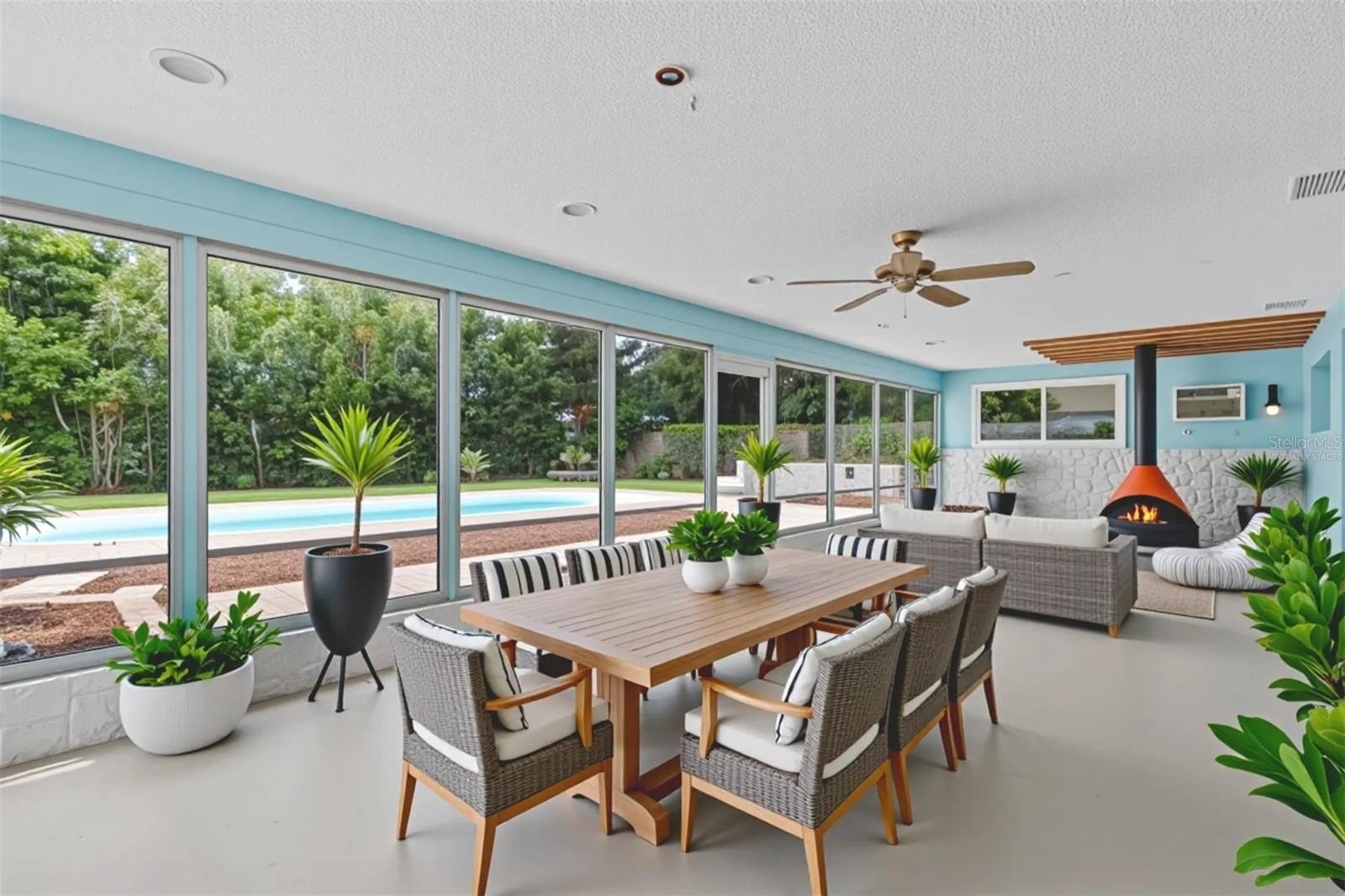 You don’t need to live in downtown Dunedin to enjoy the ultimate walkable lifestyle. Nestled in Fairway Estates, this residence is just steps from the Pinellas Trail, an 18-hole championship golf course and clubhouse, and the region’s premier visual arts and education center. Nearby, a community center with library, fitness studio & classes, Olympic size pool, tennis and pickleball courts, and picturesque parks ensure endless opportunities for recreation, festivals, and nature exploration—all without ever getting in your car. The optional HOA offers the freedom of no deed restrictions, along with an active calendar of family friendly gatherings. Peace of mind comes with a newer roof and HVAC system, hurricane-rated windows and doors, and X flood zone status that helps keep insurance affordable. Inside, you’ll find an open-concept great room and chef’s kitchen designed for entertaining, with soaring vaulted ceilings, dramatic exposed beams, and luxury plank flooring. European-style wood cabinetry, sleek stainless appliances, oversized island with entertainment bar, and gleaming granite countertops. Host with style in the expansive 35’ x 14’ enclosed lanai, complete with a cozy fireplace and the potential for additional climate-controlled living. The Owner’s Suite is a true retreat with direct lanai access, and a spa-inspired ensuite with updated vanity and mid-century modern sunken tub/shower. Two additional bedrooms share an updated ceramic tile bath, also with a timeless sunken tub/shower. Original mid-century terrazzo floors grace all bedrooms. Step outside to your private backyard oasis with a sparkling in-ground pool. The fully fenced yard provides both privacy and security for kids and pets alike. Homes in Fairway Estates are highly sought-after and rarely available. Don’t miss the chance to claim this exceptional lifestyle—schedule your private tour today.
