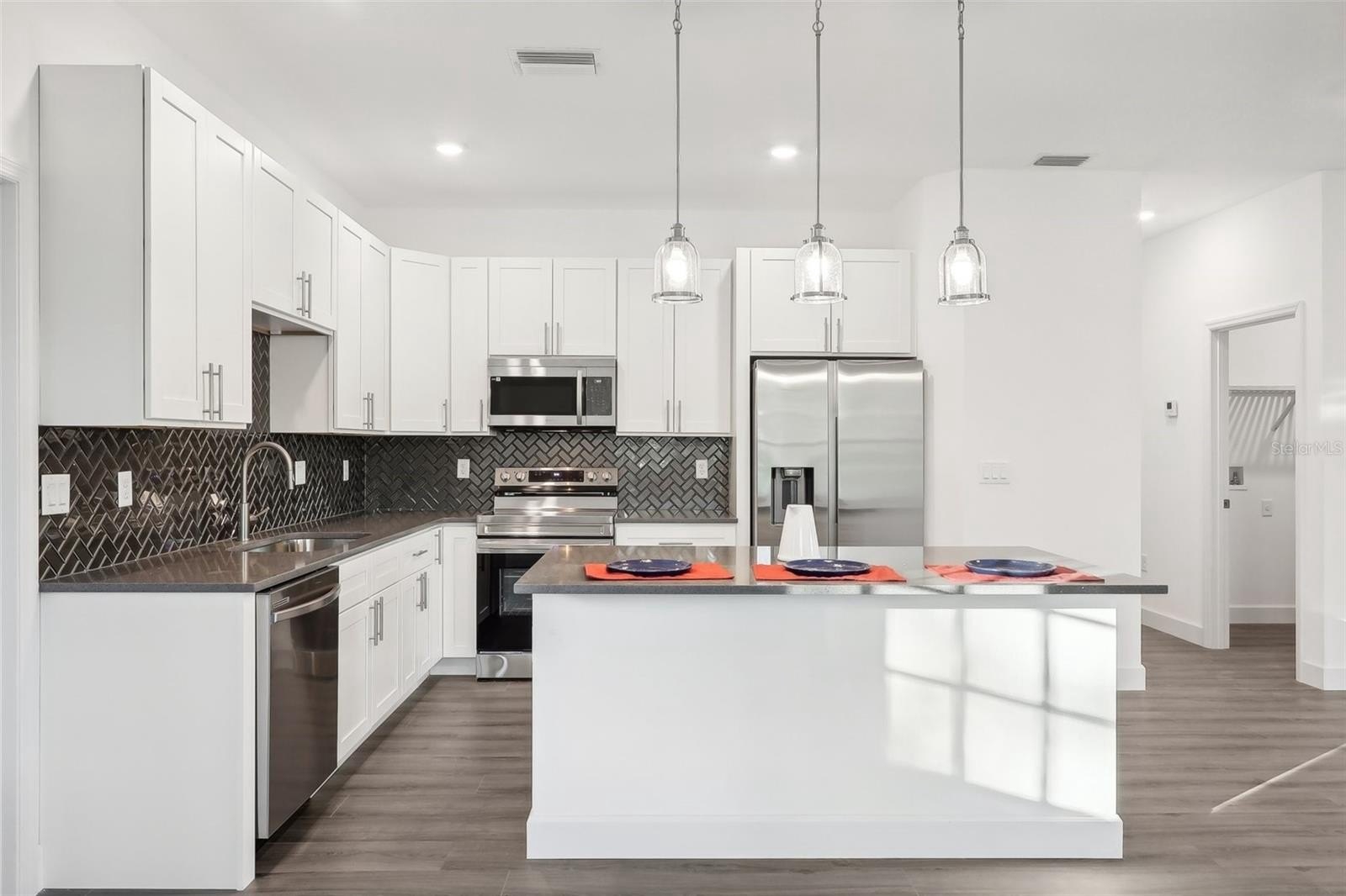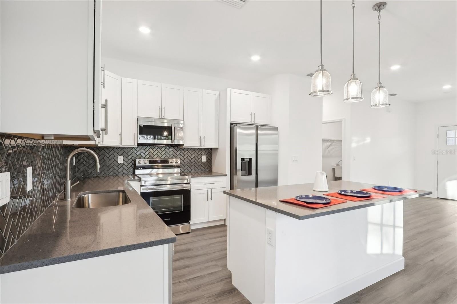 Under Construction. NEW CONSTRUCTION HOME! SELLER IS OFFERING BUYER 2/1 BUY DOWN/CONCESSIONS WITH ACCEPTED OFFER!Don’t miss this great opportunity to own a brand-new 3-bedroom, 2-bathroom, 2-car garage home located just minutes from beautiful downtown DeLand. This home features an open-concept kitchen with a large island, quartz countertops, and stainless steel appliances including a range, refrigerator, dishwasher, and above-range microwave. The kitchen is highlighted by stunning 42" upper cabinets, while the main living areas offer stylish vinyl plank flooring and both bathrooms are finished with tile. The spacious master suite includes an oversized walk-in closet and a luxurious bathroom with a soaking tub, a beautifully tiled walk-in shower, and double vanities. Throughout the home, you'll find thoughtful upgrades such as ceiling fans in all bedrooms and the living room, 5 1/4" baseboards, insulated double-pane vinyl-frame windows, and an inside laundry room. Built with quality concrete block construction up on a stem wall to elevate the home, and architectural shingles, this home also includes covered front and back patios for added outdoor living space. Some photos may be of previous models—finishes and colors may vary. HURRY..still time to help with choosing some finishes and colors.