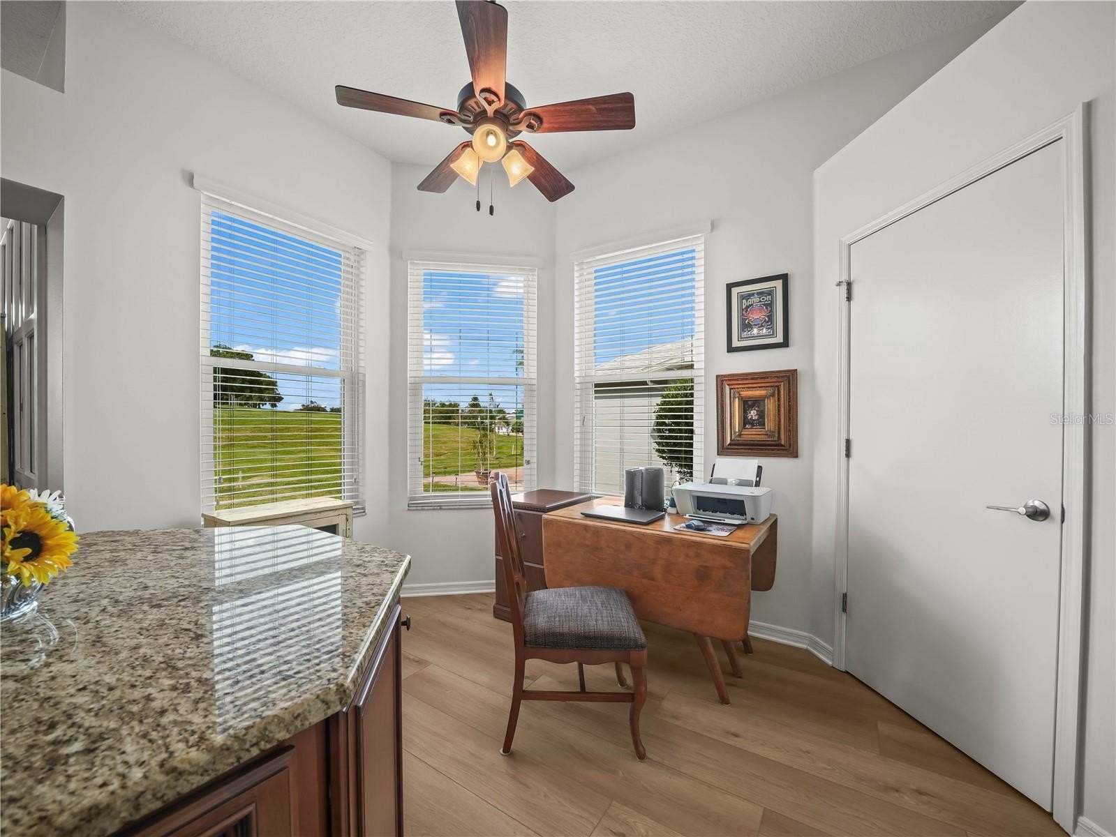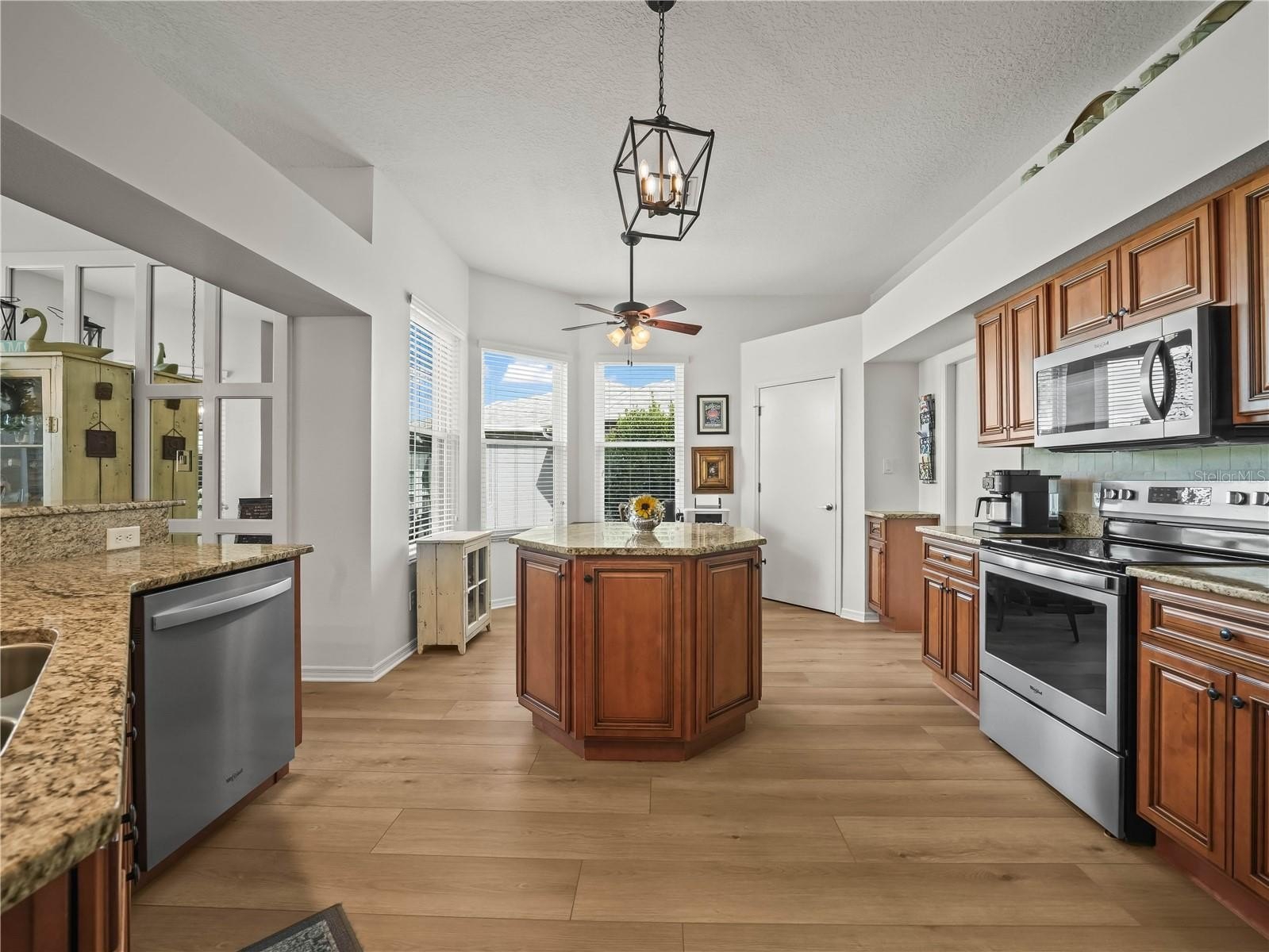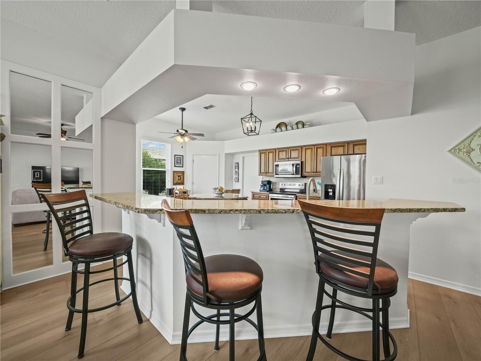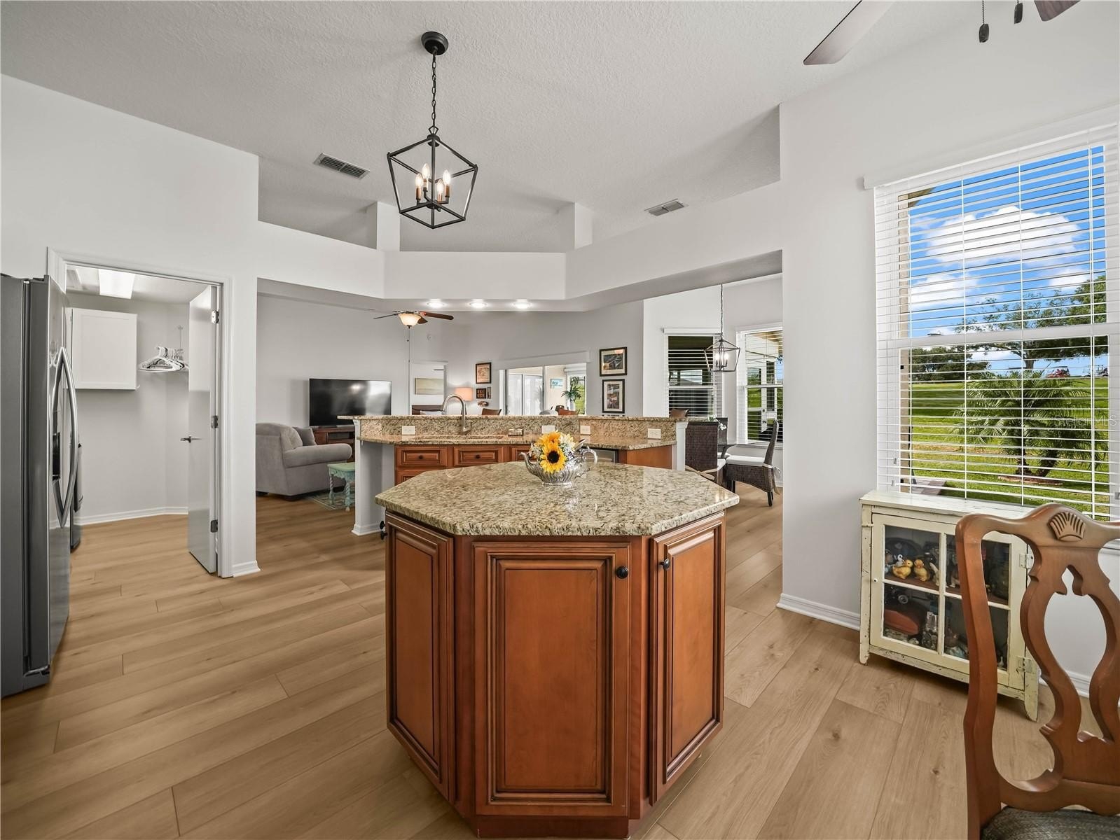 The open kitchen boasts real wood cabinetry, granite countertops, stainless steel appliances, a center island for extra storage, and a snack bar for casual dining. Enjoy your morning coffee in the cozy dinette area with serene views of the golf course. A walk-in pantry provides additional storage for groceries and kitchen essentials.