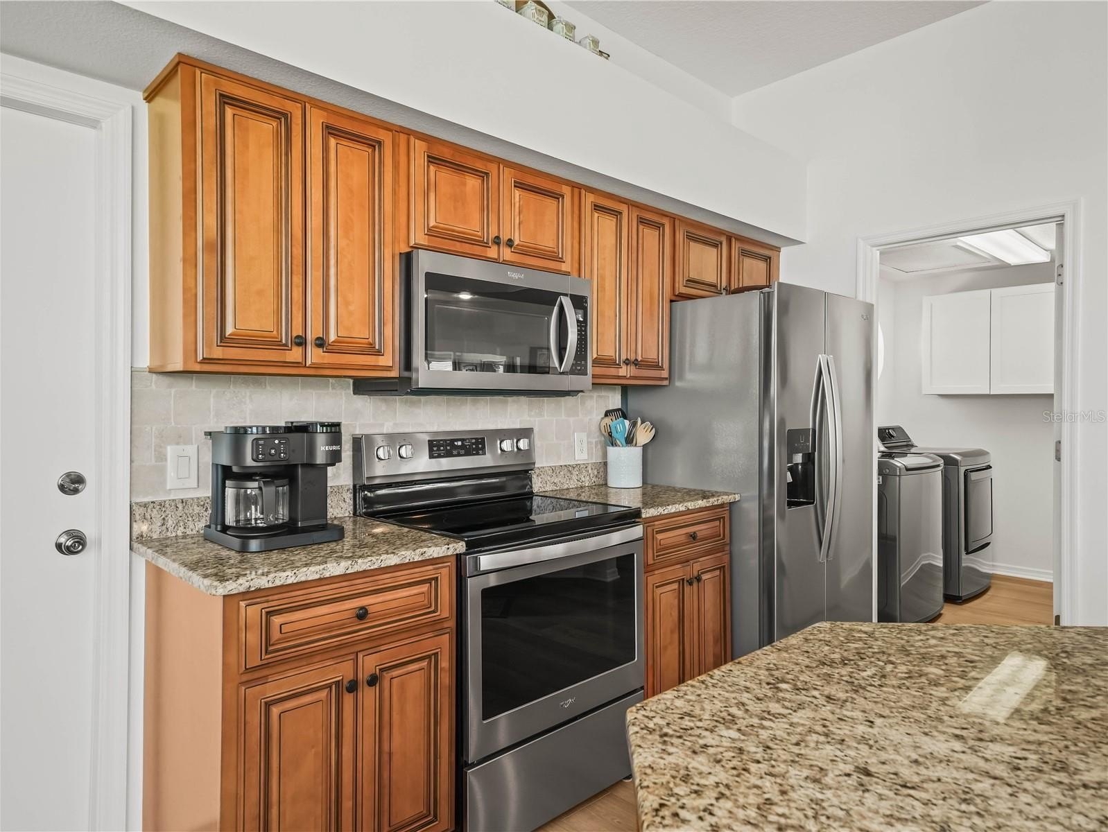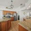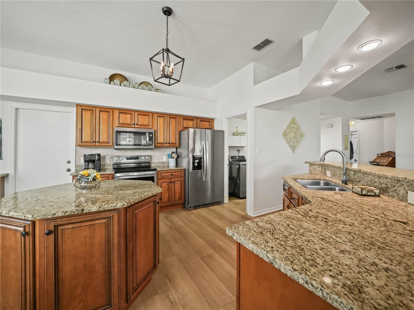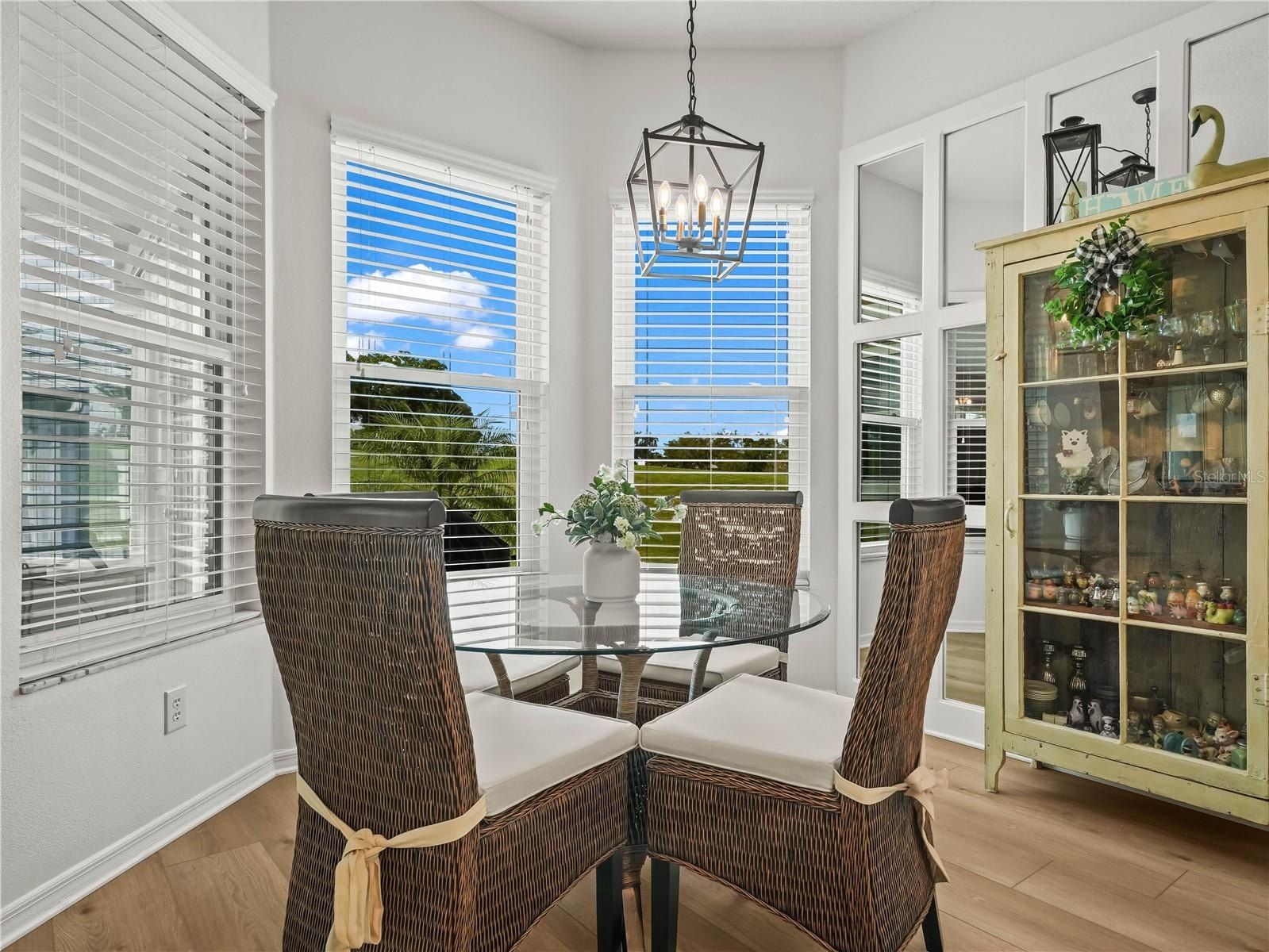 The open kitchen boasts real wood cabinetry, granite countertops, stainless steel appliances, a center island for extra storage, and a snack bar for casual dining. Enjoy your morning coffee in the cozy dinette area with serene views of the golf course. A walk-in pantry provides additional storage for groceries and kitchen essentials.