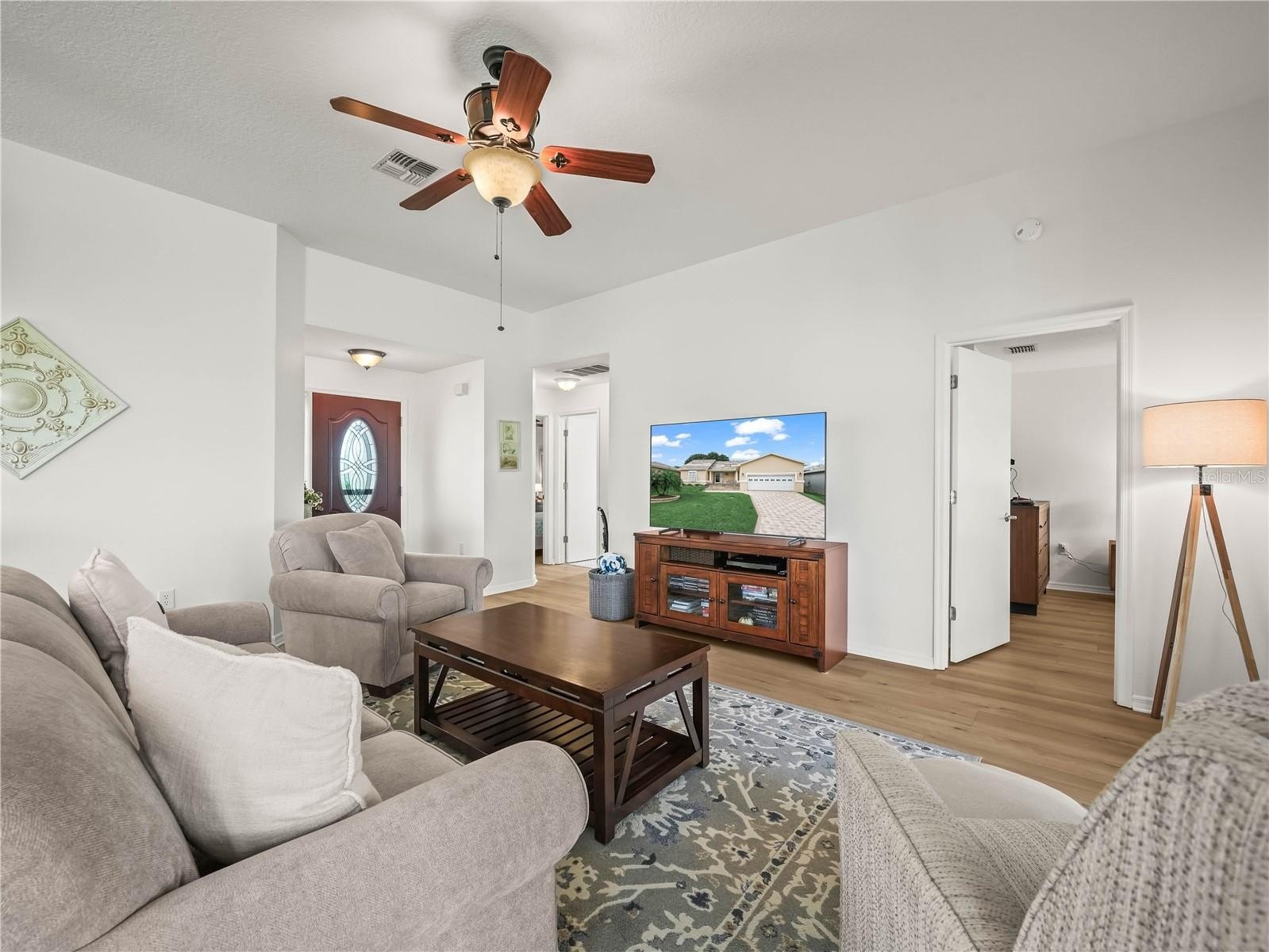 This move-in ready home features new luxury vinyl flooring throughout, fresh interior paint, newly painted doors and baseboards, and optional furniture to make settling in even easier. The spacious living room flows seamlessly into the Florida Room, creating a bright and airy space perfect for relaxing or entertaining.