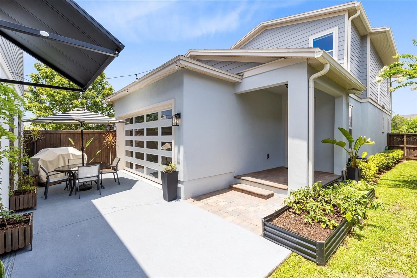 Outdoor living is easy in the private courtyard nestled between the main home and garage apartment. With paver walkways, garden planters, and space to dine or grill, this area creates a peaceful retreat in the heart of Laureate Park.