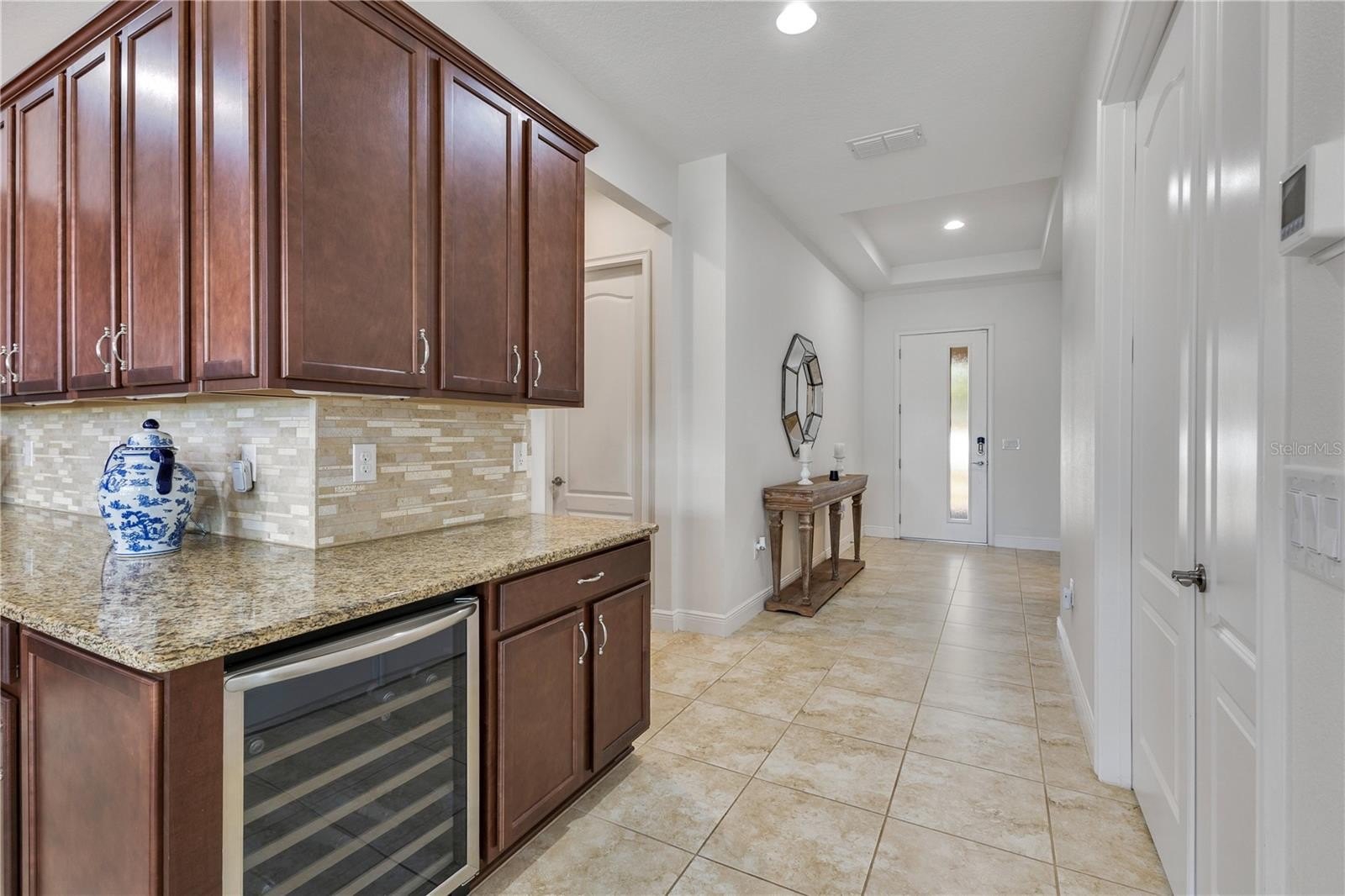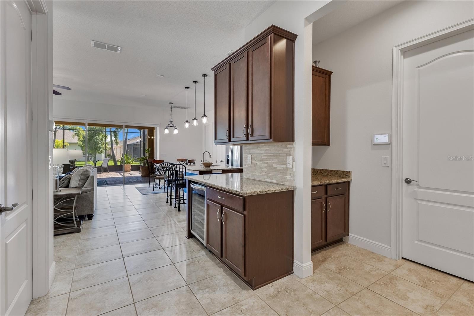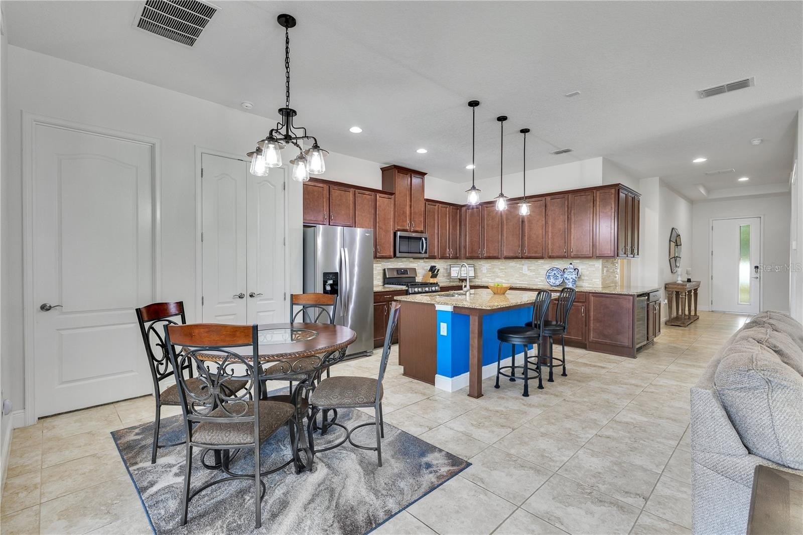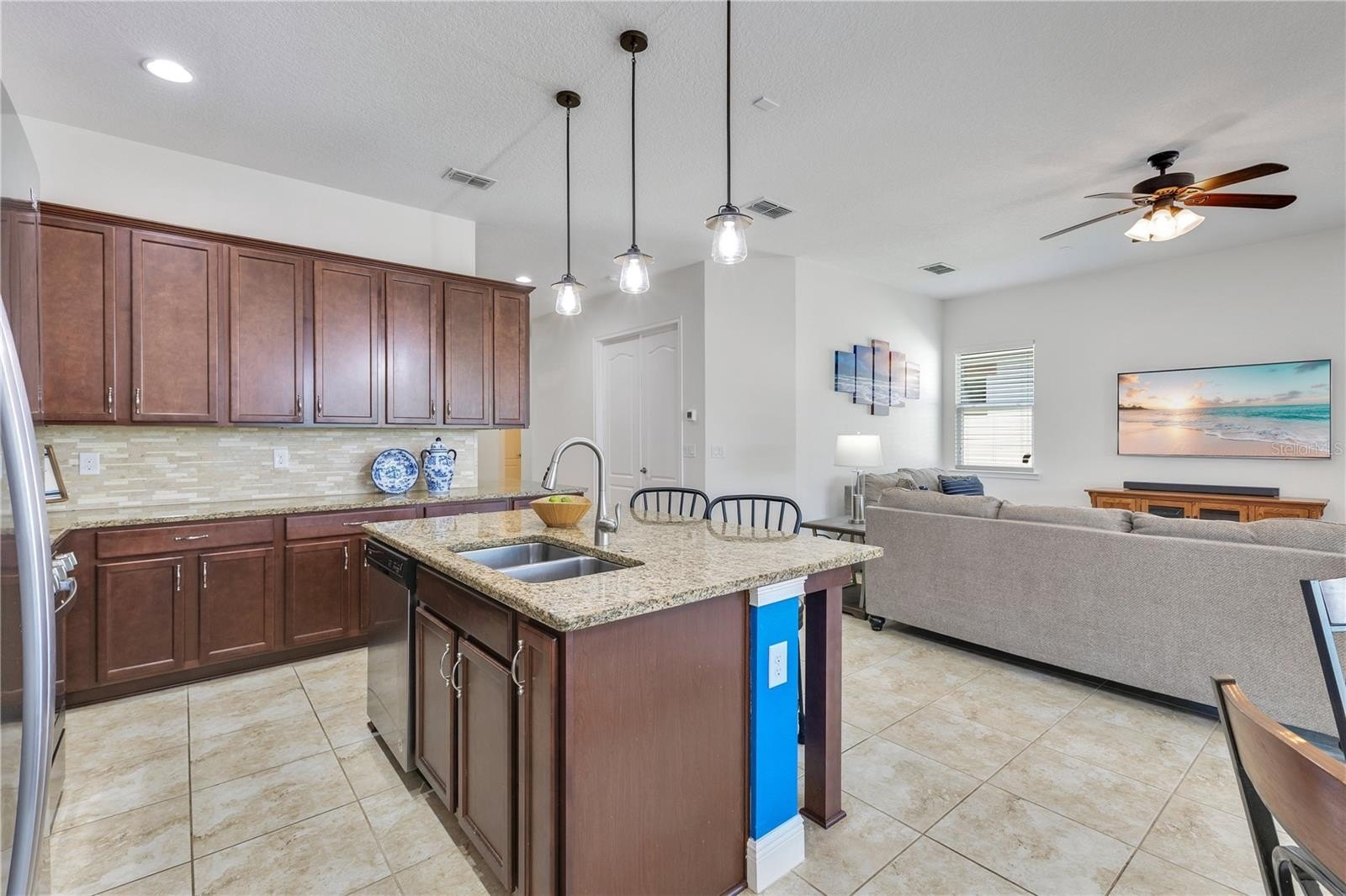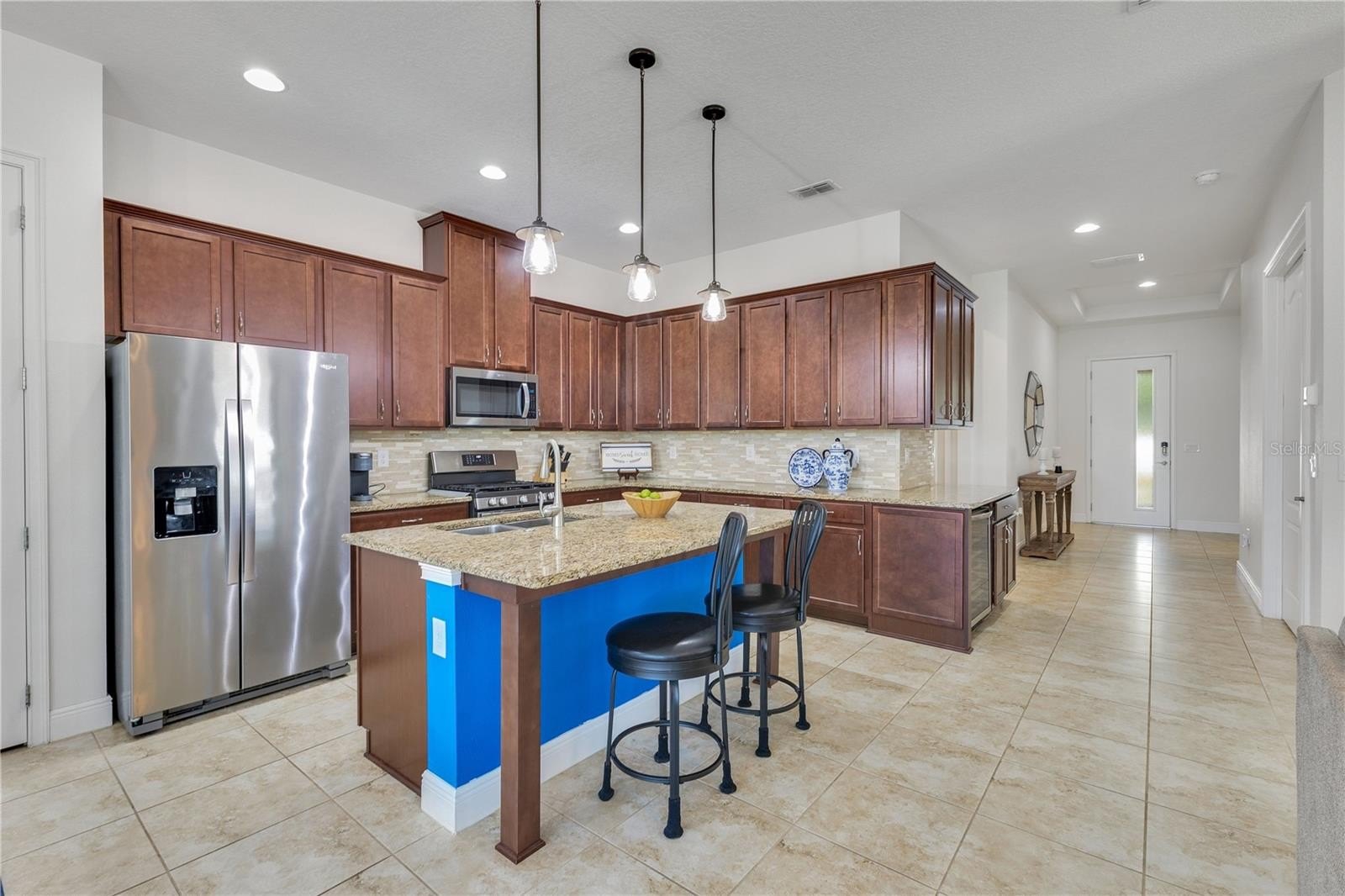Welcome to a true resort style haven reserved for active adults 55 and better. The paver drive and lush landscaping set a welcoming tone that continues inside where sunlight pours across a meticulously maintained home equipped with large format tile, high ceilings, and an open plan that effortlessly links living, dining, and the kitchen. Granite counters, rich wood cabinetry, a gas range, and pendant lighting create a gathering spot that feels both polished and comfortable.