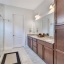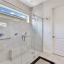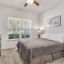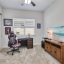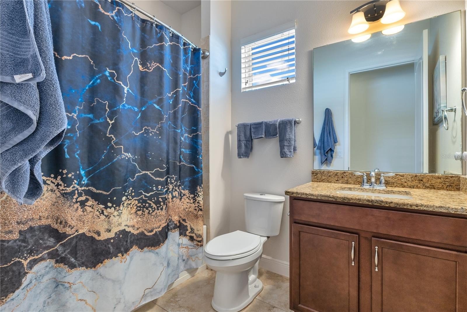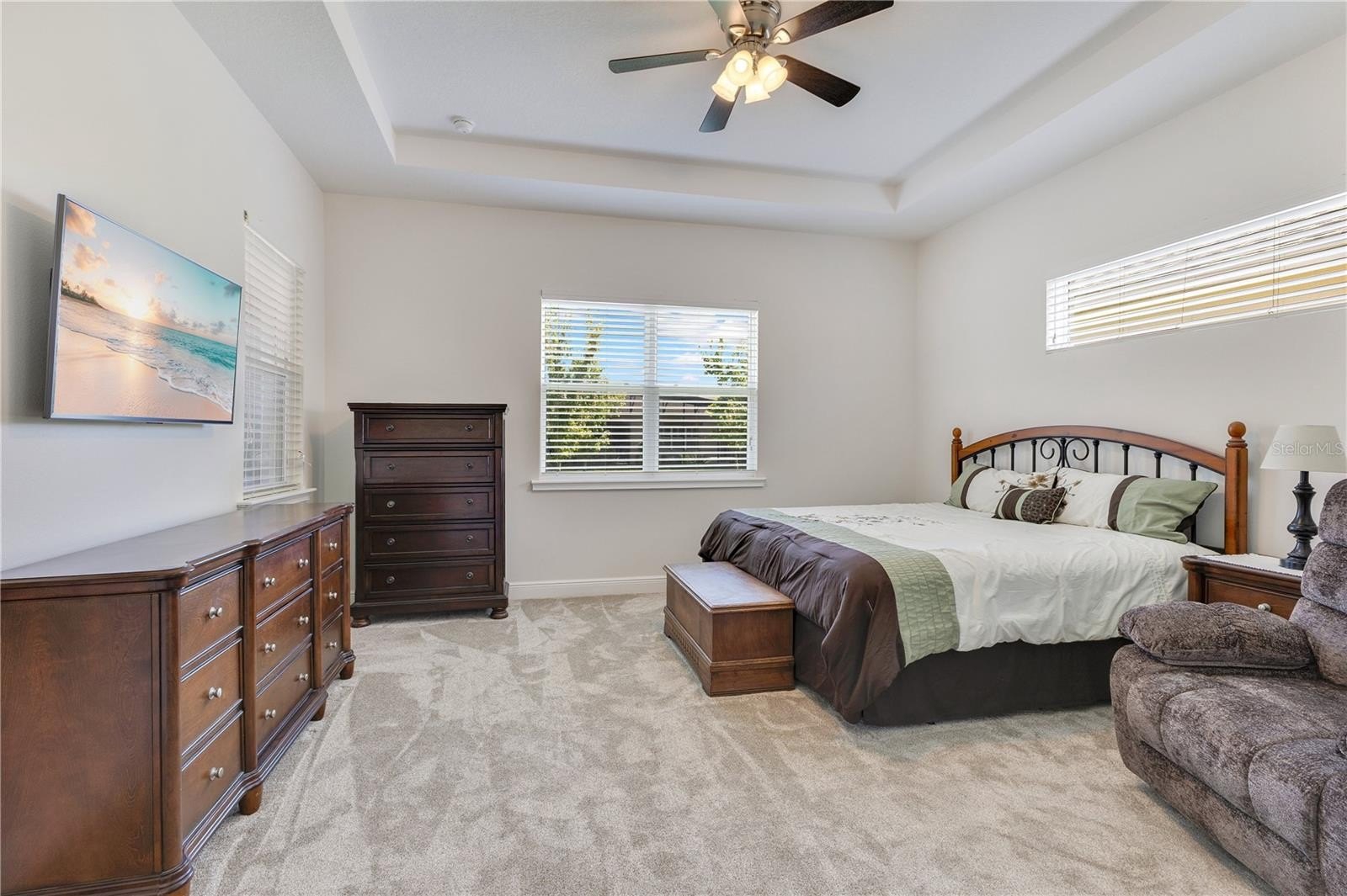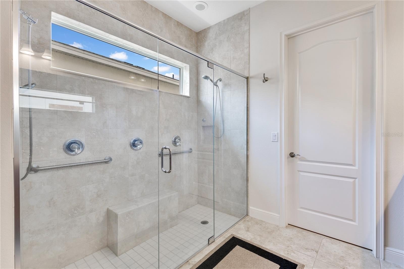The split bedroom layout keeps the primary suite private. It offers a tray ceiling, a deep walk in closet, and a spa shower with frameless glass, dual heads, and bench seating. Two additional bedrooms both sit toward the front of the house. A guest bath with granite vanity, plus a laundry room outfitted with upper cabinets, a utility sink, and folding space, make daily life easy.