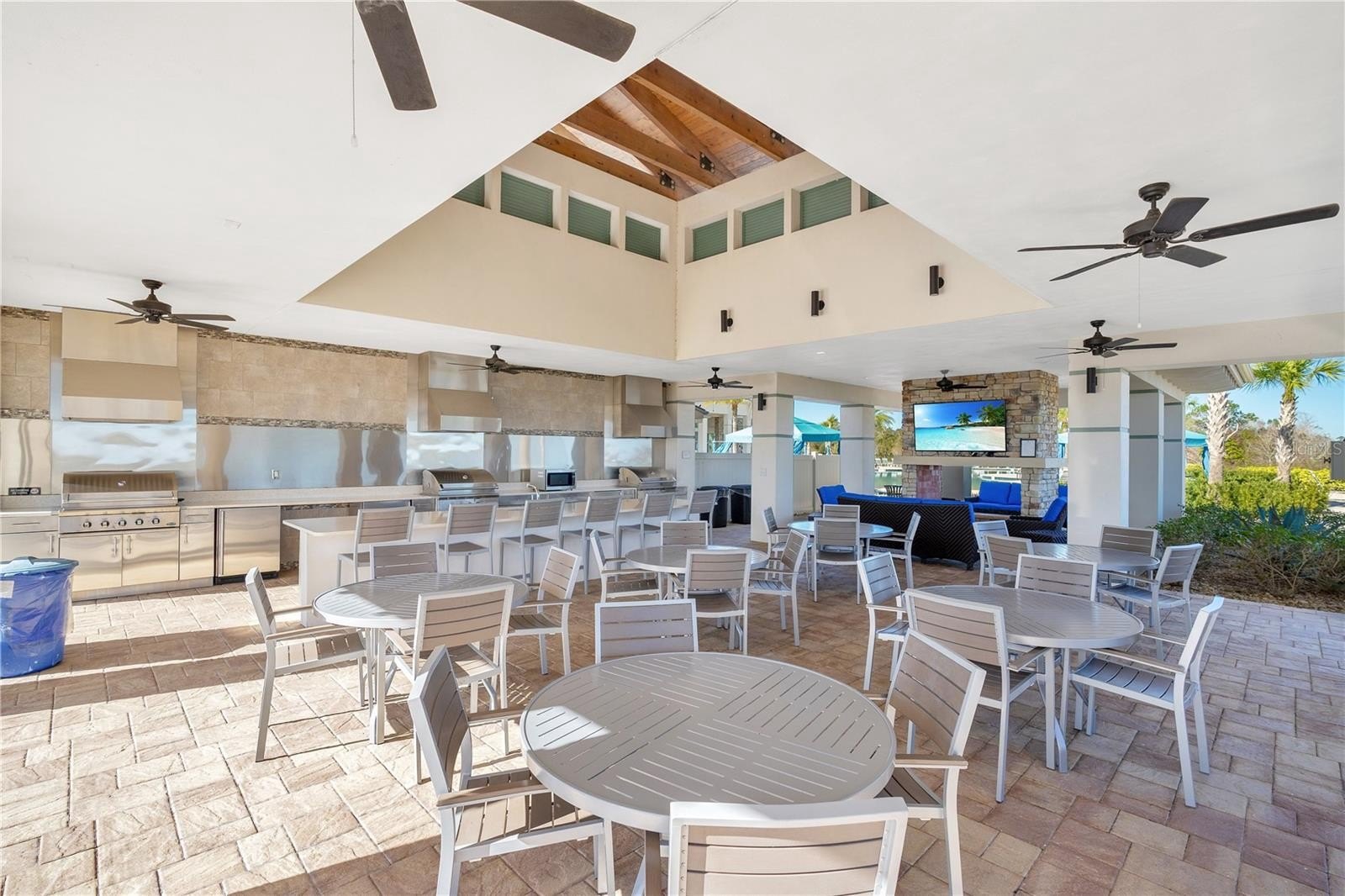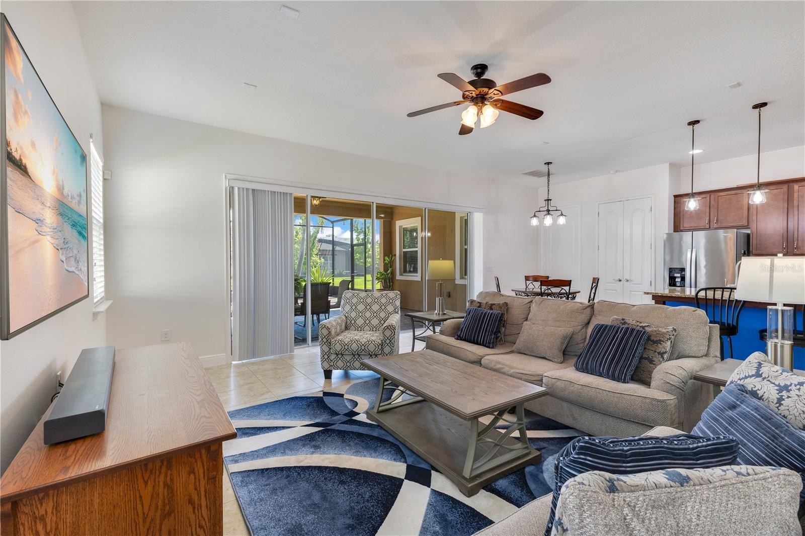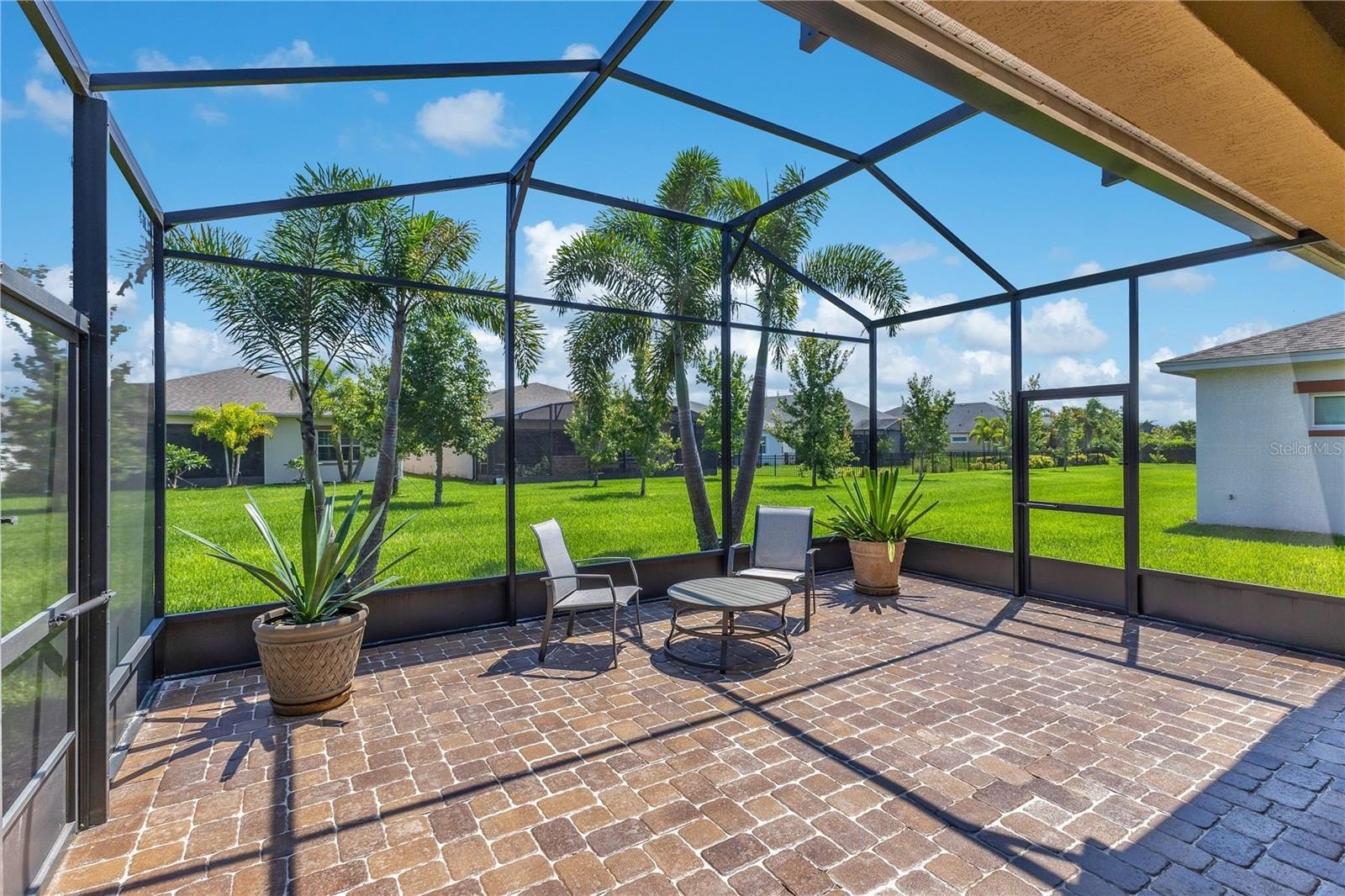 Step through pocketing sliders and you will see the upgrade everyone talks about. The GIANT screened lanai runs nearly the full width of the home, giving you room for grilling, dining, and lounging without ever feeling cramped. It has both a space for catching sun rays and under the shade.