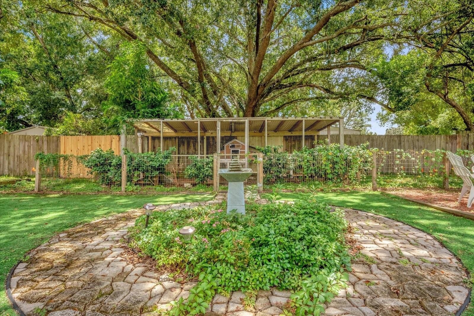Family-Friendly Features: A charming treehouse fort and chicken coop make this space a dream.
