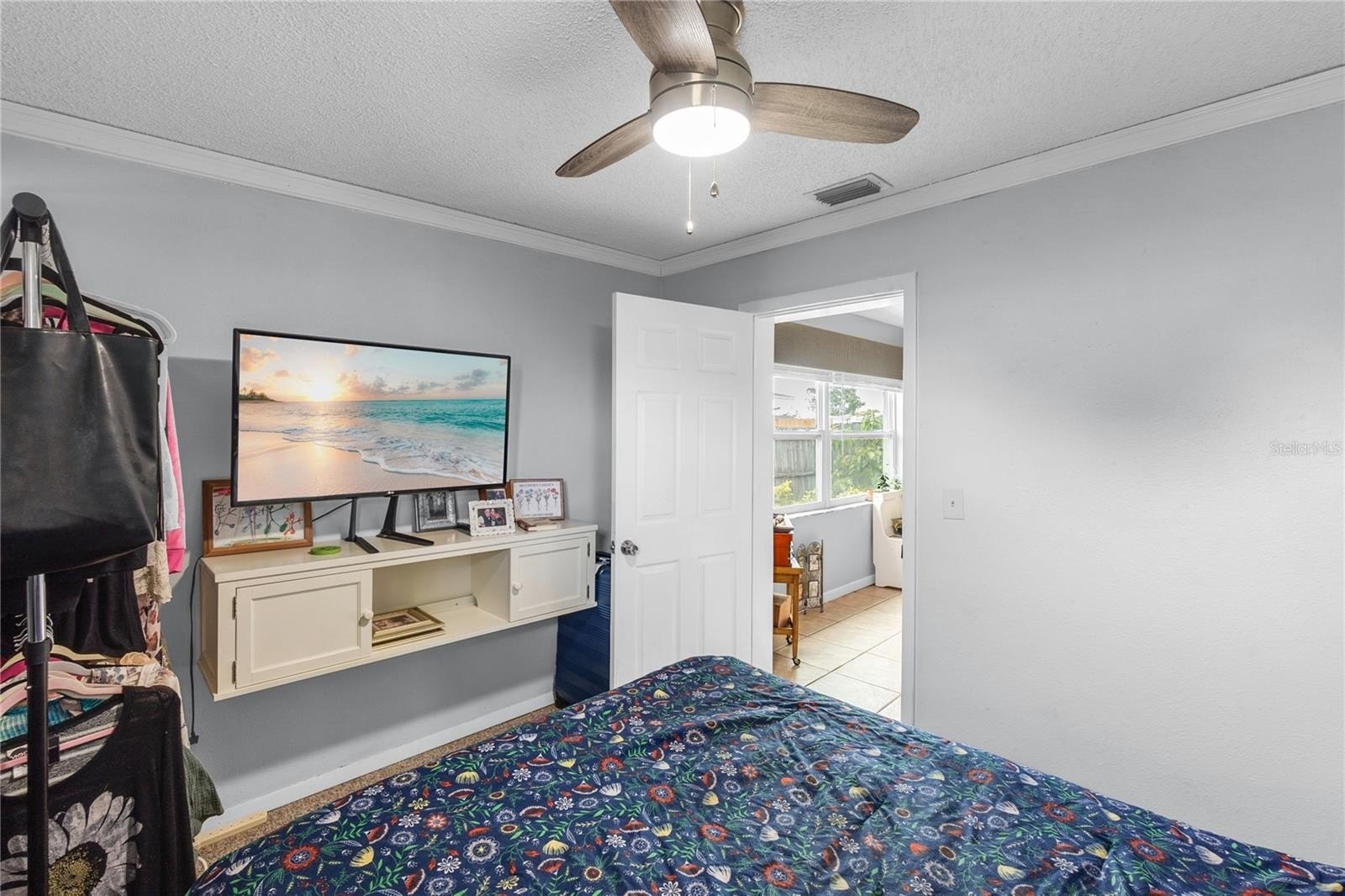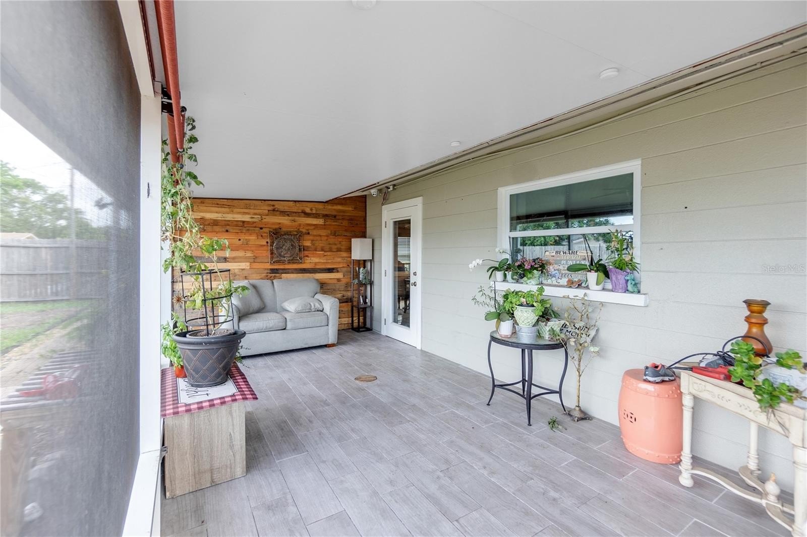 Step through to a generous screened porch, where tiled floors and an artistic wood accent wall create an ideal indoor-outdoor retreat. Just off this area is a versatile office or guest bedroom—perfect for remote work or hosting visitors.