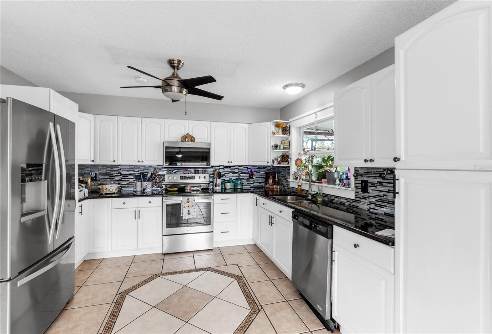 The kitchen is a standout with its cabinetry, granite countertops, stainless steel appliances, modern glass tile backsplash, under-cabinet lighting, and a window view to the lush backyard.