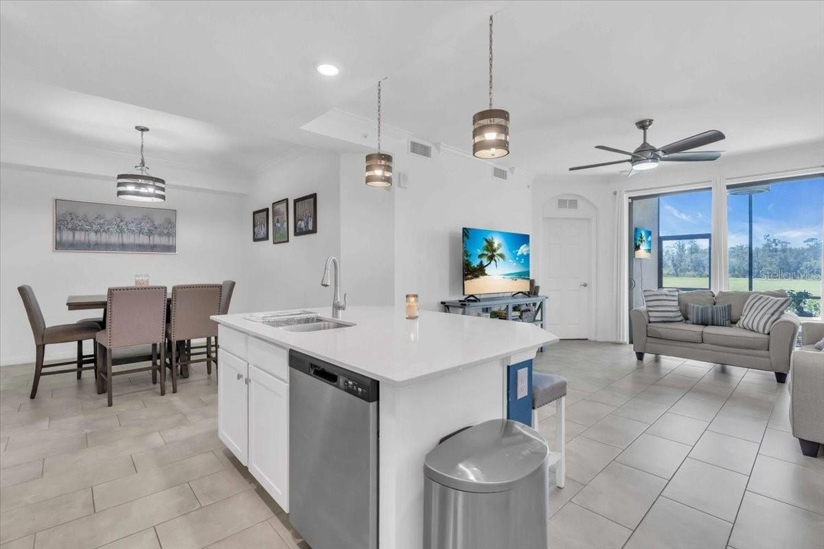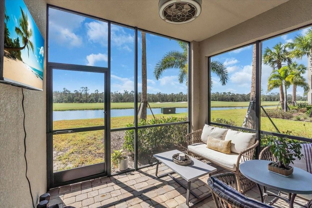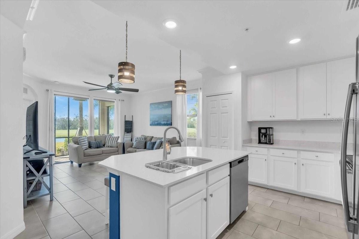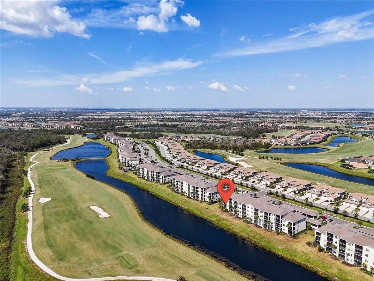 GROUND FLOOR, END UNIT, 3-bedroom, 2 bathroom condominium with golf membership in an amenity-rich community! NO CARPET. Beautifully designed and perfectly situated on the ground floor, offering easy access. Open floor plan filled with natural light, featuring a spacious living area that seamlessly flows into a modern kitchen equipped with stainless steel appliances and ample quartz counter space. The center island is a great place to have breakfast or a snack. Off the kitchen is a generous dining area. The primary suite boasts a private bathroom and a dual closets and is at the back of the home with water views, providing a tranquil retreat at the end of the day. The covered and screened lanai is next to the primary suite, off of the living area. It is a great place to enjoy your morning coffee or unwind in the evening with beautiful water and golf views. The split floor plan places the two additional bedrooms at the front of the unit, with one of the bedrooms connecting to the other full bath. Guests are able to access that bathroom from the hallway as well. The third bedrooms makes a great guest space, home office, or a hobby space. The unit comes with an outdoor storage closet as well as a reserved, covered parking space. Plenty of guest parking available. This property includes coveted golf membership, allowing you to enjoy the pristine greens of the community’s Arnold Palmer Championship 36-hole golf course. Beyond your front door, indulge in a wealth of amenities, including a grand clubhouse with beach entry lagoon pool, fitness center, clay tennis courts, casual poolside dining, full service spa, and so much more. Feel safe and secure with guarded gate access. Convenient access to everything Lakewood Ranch has to offer. Close to I-75, Waterside, UTC, top rated schools, shopping and dining. Not in a flood or evacuation zone but still close enough to all your favorite beaches. Within 22 miles of Siesta Key, Lido Key, and Anna Maria Island.