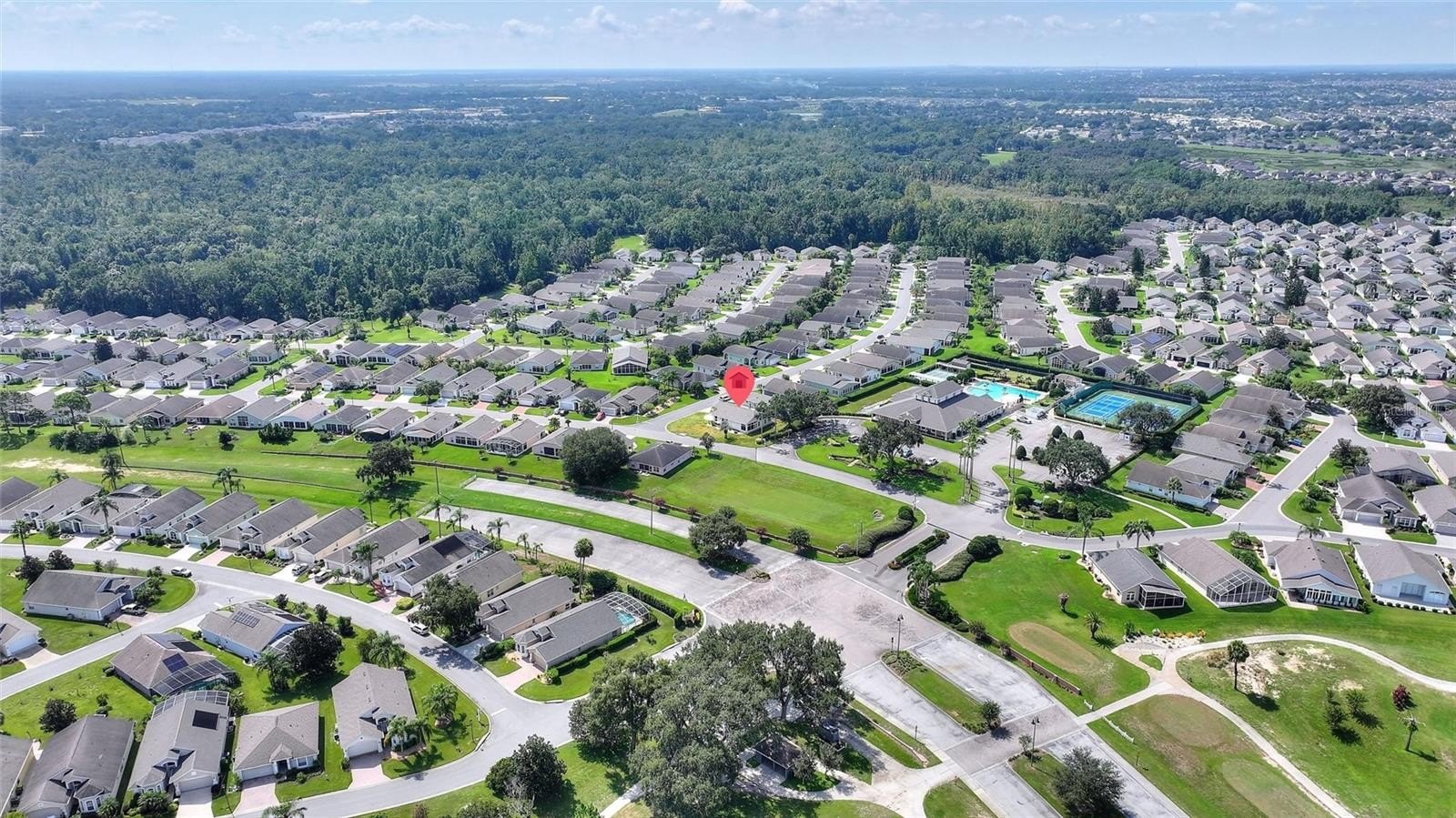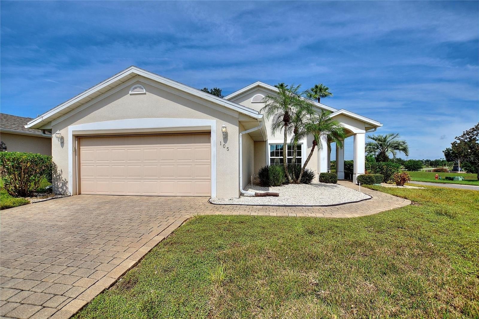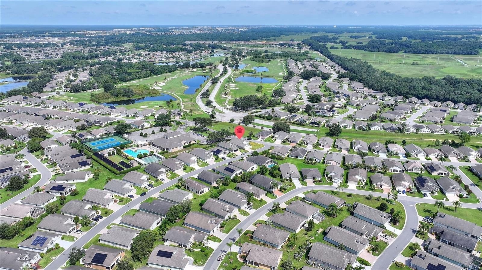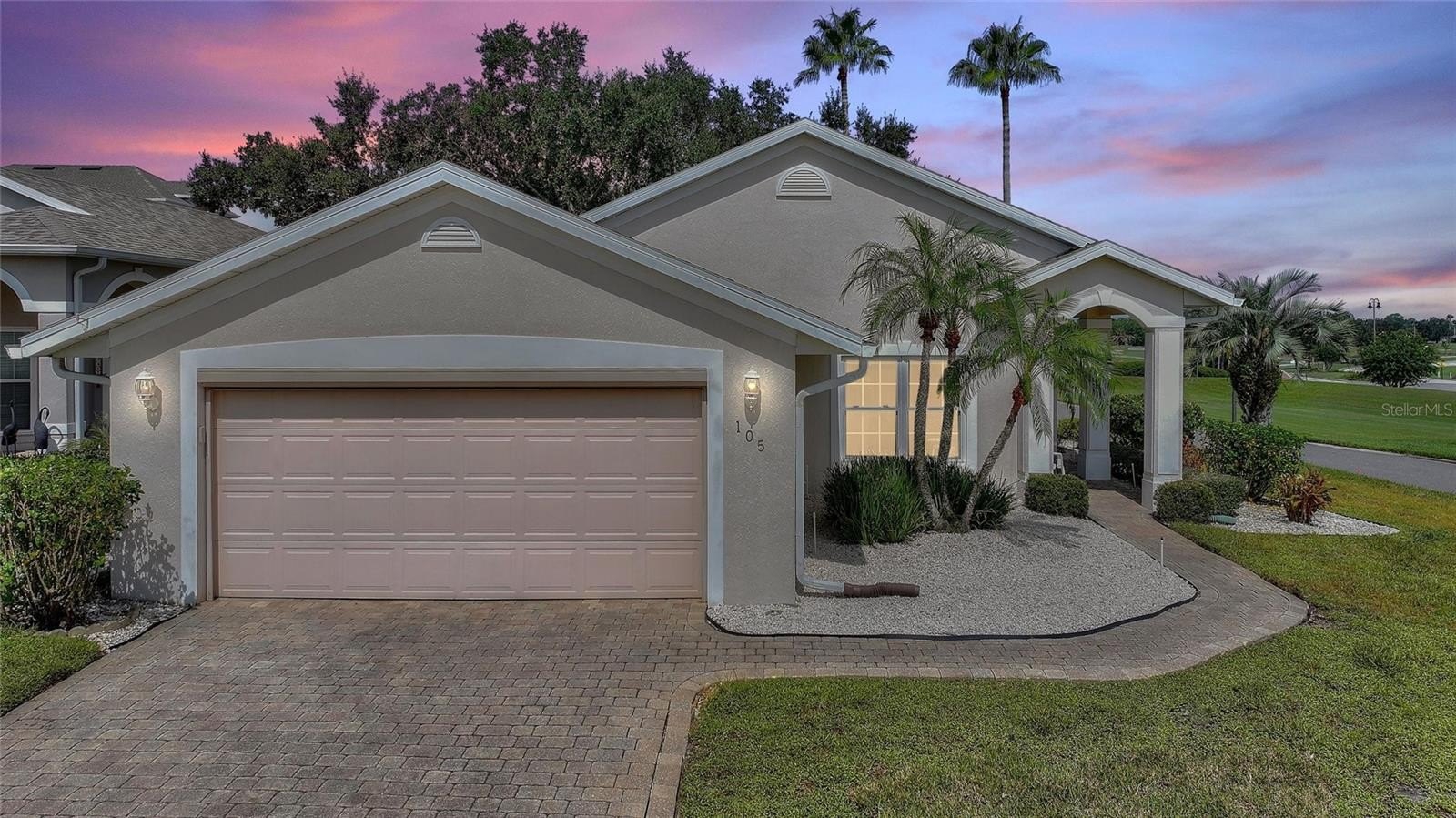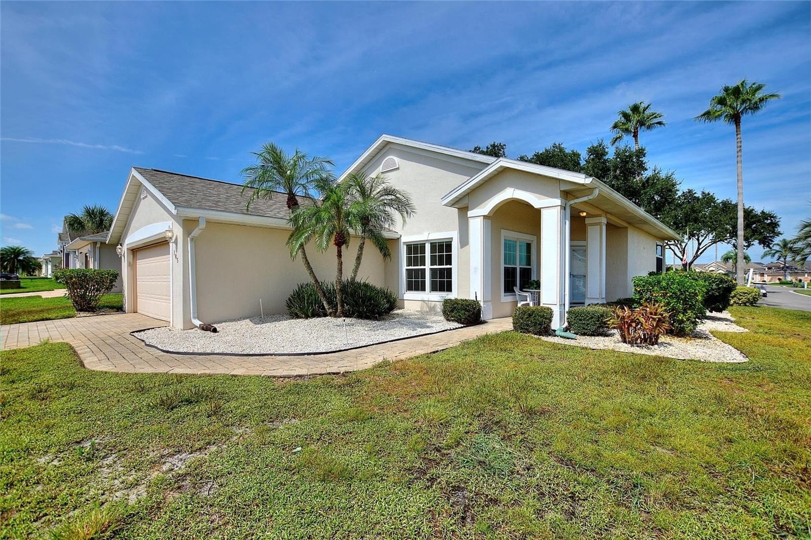 One or more photo(s) has been virtually staged. Partially-furnished RidgeMont 2 Bedroom / 2 Bath / Office model on 1-floor in Gated 55+ Community with 2025 Roof & Water Heater, Solid Surface Floors throughout, newer HVAC & Replacement Windows, located next-door to High Vista's private clubhouse and outdoor amenity center. Brick paver driveway and walkway to a charming portico entry with full-view storm door enters a vaulted-ceiling great room with a wall of patio windows to an enclosed west-facing lanai. Eat-in kitchen in front of house has white cabinets & countertops, large closet pantry and a newer stainless-steel refrigerator. Utility sink and stackable washer/dryer in corridor laundry area. Primary bedroom has private bath within 13x6 walk-in-closet, dual sink vanity, soaking tub, linen closet and shower. Guest bedroom and office share a full bath and large linen closet in this split bedroom floor plan. Quality top-down/bottom-up blinds throughout interior. 2-car garage has insulated garage door with opener & keypad entry and electric screen door. Well for Irrigation. Roof and Water Heater replaced 2025; HVAC replaced 2022; many windows replaced 2019. Newer smoke detectors. Sold As-Is. Ridgewood Lakes is a golf cart friendly community. $230 monthly High Vista HOA fee includes Spectrum internet and basic cable TV with 2 cable boxes, lawn mowing and exclusive access to resident-owned 12,000 SF private High Vista clubhouse and amenities. $425 semi-annual Ridgewood Lakes HOA fee provides 24x7 staffed security gate and master association-owned private road maintenance. Adjacent to 18-hole White Heron Golf Club with restaurant, privately owned and open to the public. High Vista is a 55+ community with outdoor heated pool and spa, fitness center, library, pub & many organized activities. Pickle ball, tennis, bocce and shuffleboard courts. Miles of biking and walking trails within Ridgewood Lakes gated community. Shopping, Disney, Universal, Orlando & Central FL entertainment nearby, easy access to I-4, medical facilities, airports & Sunrail Station. Advent Health hospital is 3 miles away.